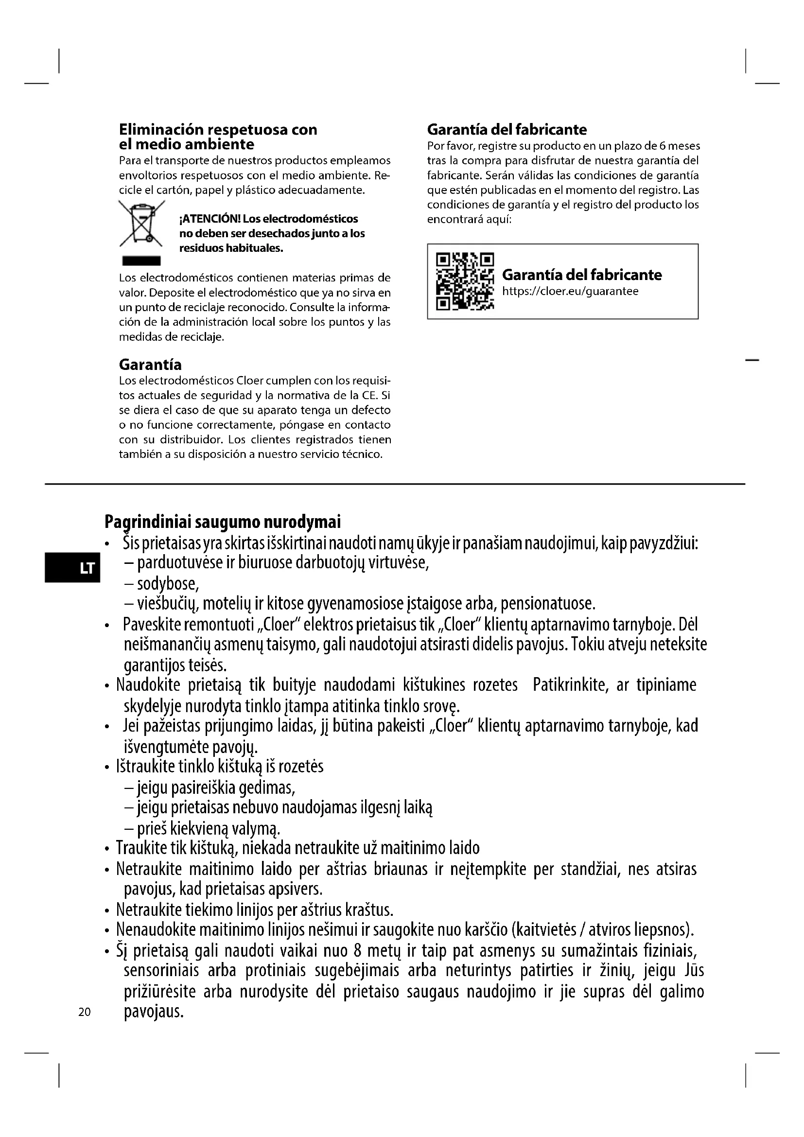 muos bendruomenės arba miesto administracija. Garantija Cloer elektros prietaisai atitinka aktualias EB direkt- yvas ir saugumo nurodymus. Jeigu Jums atrodys, kad Jūsų Cloer prietaisas yra su defektu arba veikia netinkamai, kreipkitės Jūs prašau į savo prekybinę firmą arba Cloer-klientų aptarnavimo tarnybą. Be to, registruoti pastovūs pirkėjai yra mūsų klientų tarnybos dispozicijoje. Gamintojo garantija Prašau registruokite Jūs savo prietaisą per 6 mėnesius po pirkimo, kad galėtumėte naudotis mūsų gaminto