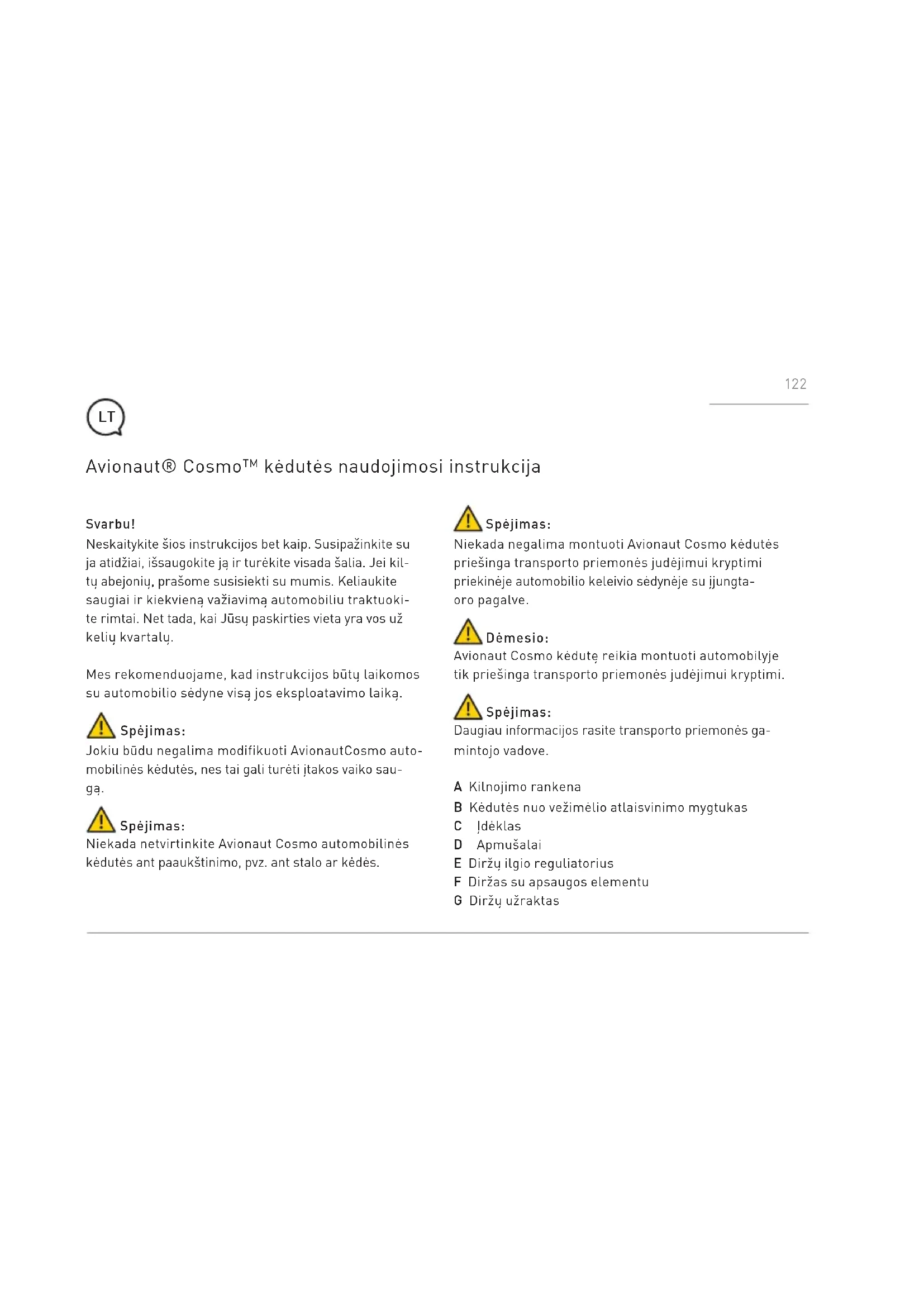- Questa garanzia è stata elaborata da Ł.KARWALA, un'azienda registrata in Polonia. L’indirizzo dell'azienda è il seguente: Szarlejka, ul. Lukaszewicza 172 42-130 Wreczyca Wielka, Polska (1) I prodotti acquistati con etichette o numeri di identificazione rimossi o alterati sono considerati non autorizzati. Poiché l'autenticità di tali prodotti non può essere stabilita, la garanzia non copre tali prodotti. 121Svarbu! Neskaitykite šios instrukcijos bet kaip. Susipažinkite su ja atidžiai, išsaugokite ją ir turėkite visada šalia. Jei kil- tų abejonių, prašome susisiekti su mumis. Keliaukite saugiai ir kiekvieną važiavimą automobiliu traktuoki- te rimtai. Net tada, kai Jūsų paskirties vieta yra vos už kelių kvartalų. Mes rekomenduojame, kad instrukcijos būtų laikomos su automobilio sėdyne visą jos eksploatavimo laiką. Spėjimas: Jokiu būdu negalima modifikuoti AvionautCosmo auto- mobilinės kėdutės, nes tai gali turėti įtakos vaiko sau- gą. Spėjimas: Niekada netvirtinkite Avionaut Cosmo automobilinės kėdutės ant paaukštinimo, pvz. ant stalo ar kėdės. Avionaut® Cosmo™ kėdutės naudojimosi instrukcija Spėjimas: Niekada negalima montuoti Avionaut Cosmo kėdutės priešinga transporto priemonės judėjimui kryptimi priekinėje automobilio keleivio sėdynėje su įjungta- oro pagalve. Dėmesio: Avionaut Cosmo kėdutę reikia montuoti automobilyje tik priešinga transporto priemonės judėjimui kryptimi. Spėjimas: Daugiau informacijos rasite transporto priemonės ga- mintojo vadove. A Kilnojimo rankena B Kėdutės nuo vežimėlio atlaisvinimo mygtukas C Įdėklas D Apmušalai E Diržų ilgio reguliatorius F Diržas su apsaugos elementu G Diržų užraktas