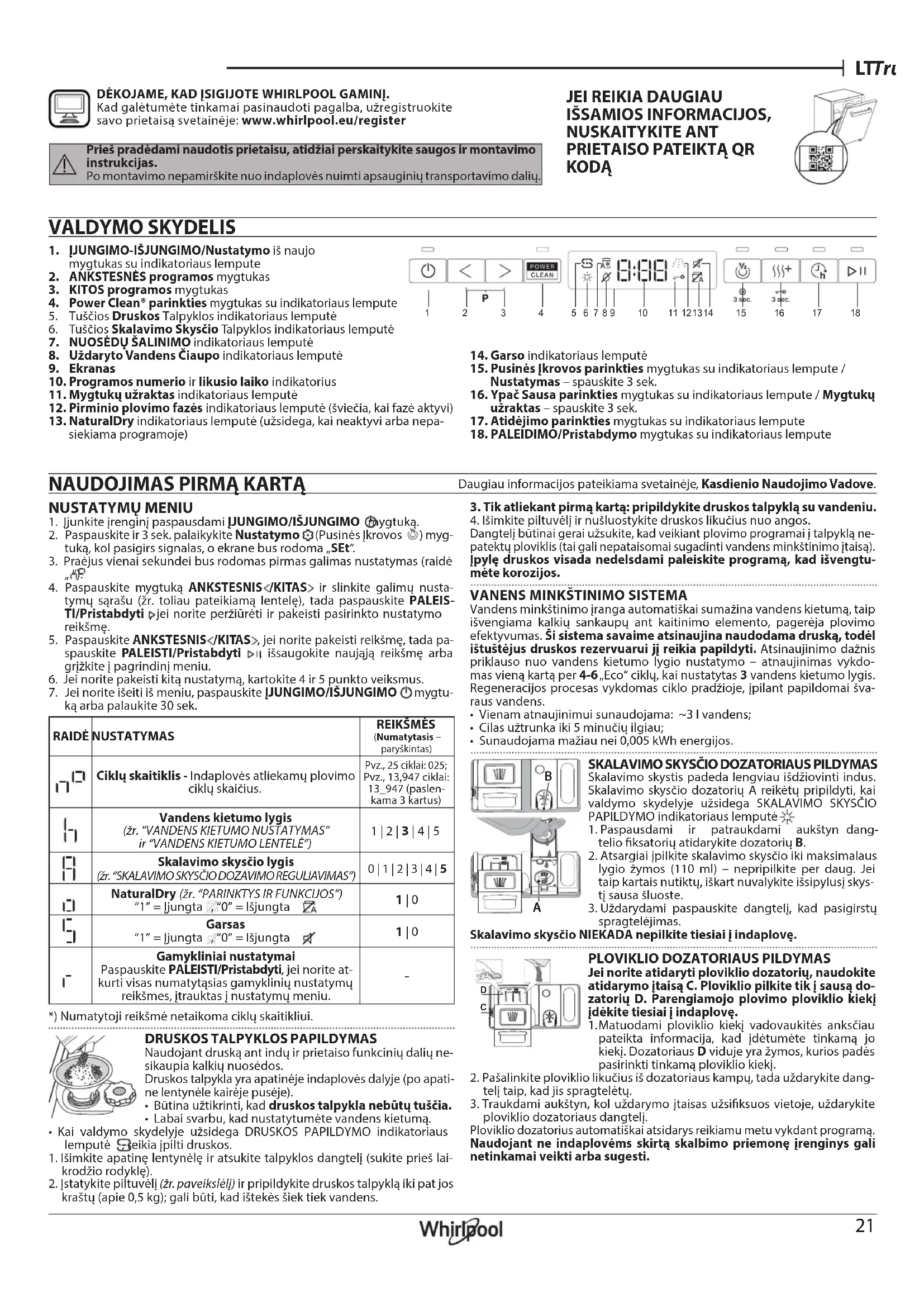 Daugiau informacijos pateikiama svetainėje, Kasdienio Naudojimo Vadove. DĖKOJAME, KAD ĮSIGIJOTE WHIRLPOOL GAMINĮ. Kad galėtumėte tinkamai pasinaudoti pagalba, užregistruokite savo prietaisą svetainėje: www.whirlpool.eu/registerPrieš pradėdami naudotis prietaisu, atidžiai perskaitykite saugos ir montavimo instrukcijas. Po montavimo nepamirškite nuo indaplovės nuimti apsauginių transportavimo dalių.1. ĮJUNGIMO-IŠJUNGIMO/Nustatymo iš naujo mygtukas su indikatoriaus lempute2. ANKSTESNĖS programos mygtukas3. KITOS programos mygtukas4. Power Clean® parinkties mygtukas su indikatoriaus lempute5. Tuščios Druskos Talpyklos indikatoriaus lemputė
