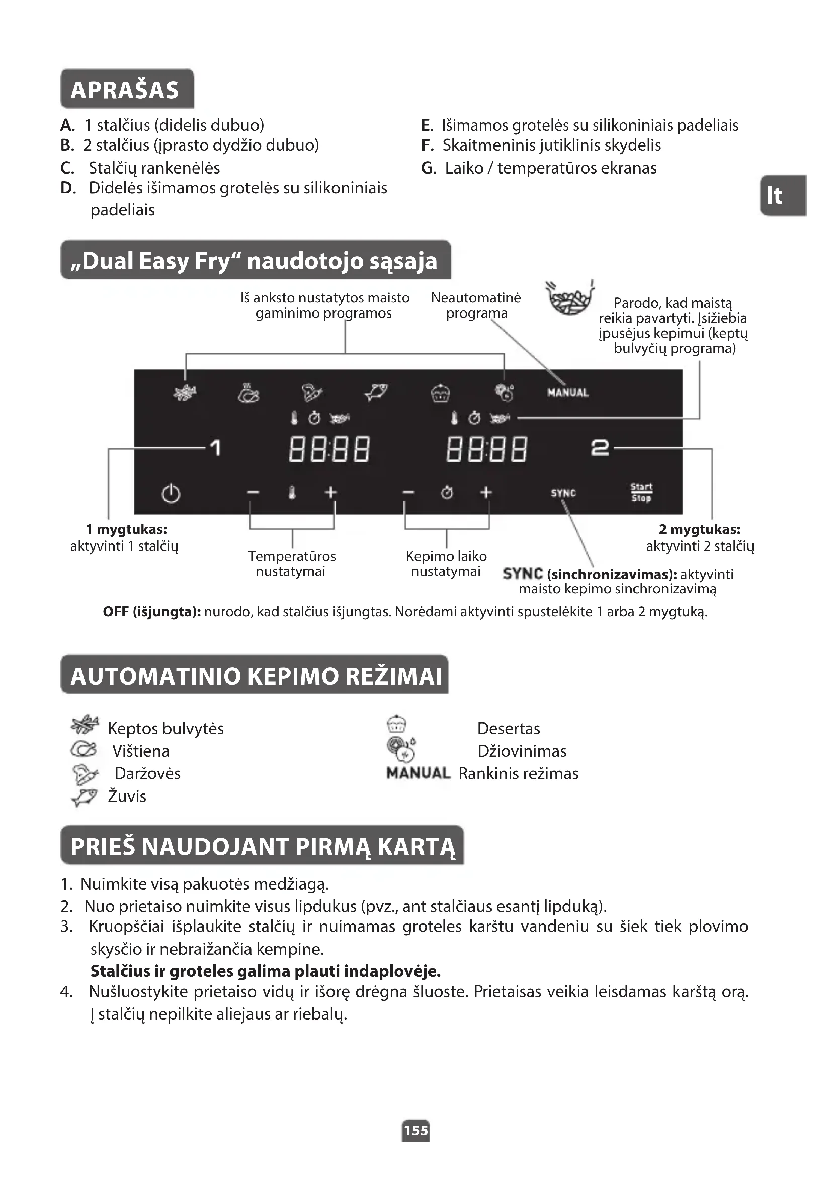 APRAŠAS A. 1 stalčius (didelis dubuo) B. 2 stalčius (įprasto dydžio dubuo) C. Stalčių rankenėlės D. Didelės išimamos grotelės su silikoniniais padeliais E. Išimamos grotelės su silikoniniais padeliais F. Skaitmeninis jutiklinis skydelis G. Laiko / temperatūros ekranas „Dual Easy Fry“ naudotojo sąsaja