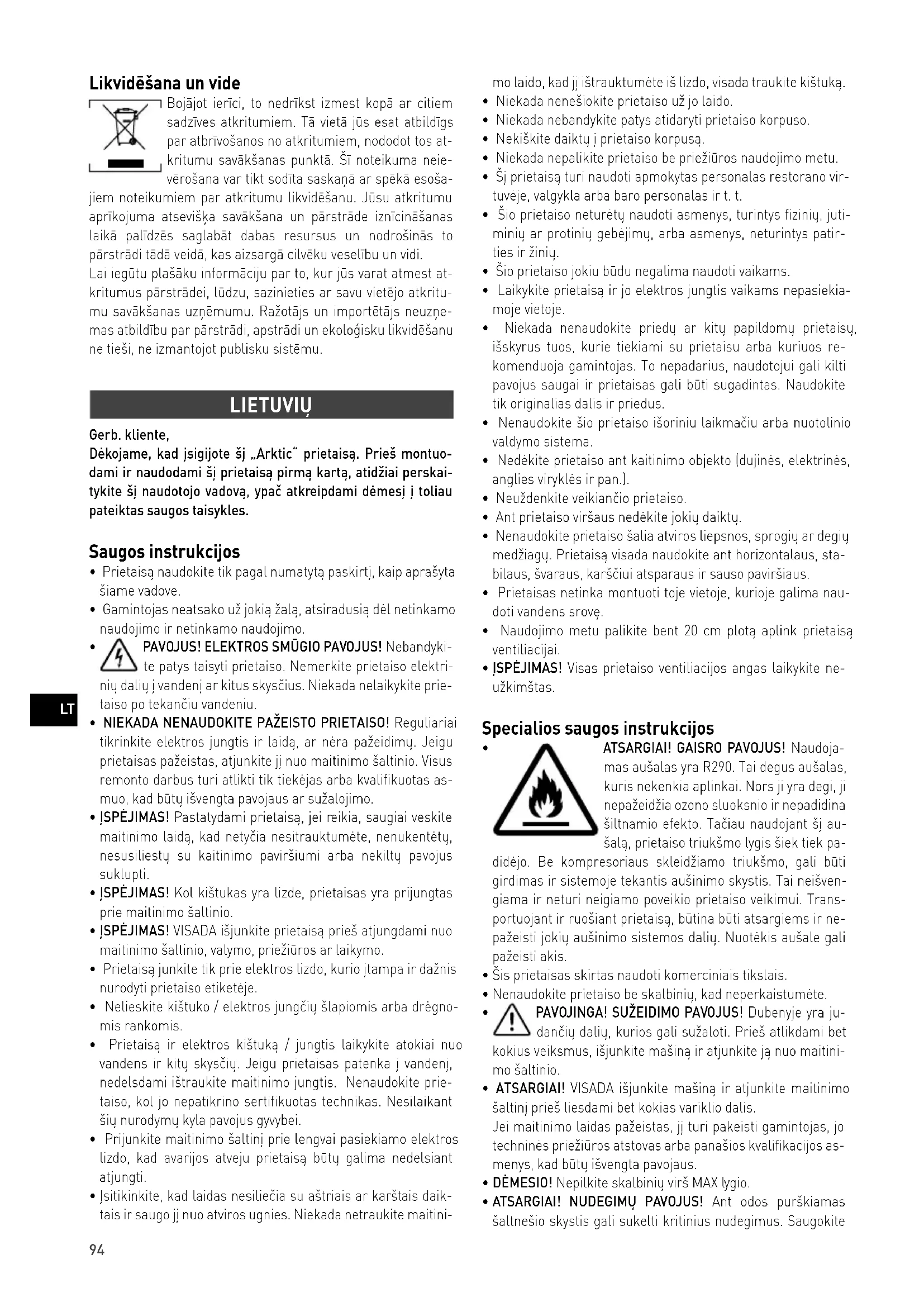 - ATSARGIAI! GAISRO PAVOJUS! Naudoja- mas aušalas yra R290. Tai degus aušalas, kuris nekenkia aplinkai. Nors ji yra degi, ji nepažeidžia ozono sluoksnio ir nepadidina šiltnamio efekto. Tačiau naudojant šį au- šalą, prietaiso triukšmo lygis šiek tiek pa- didėjo. Be kompresoriaus skleidžiamo triukšmo, gali būti girdimas ir sistemoje tekantis aušinimo skystis. Tai neišven- giama ir neturi neigiamo poveikio prietaiso veikimui. Trans- portuojant ir ruošiant prietaisą, būtina būti atsargiems ir ne- pažeisti jokių aušinimo sistemos dalių. Nuotėkis aušale gali pažeisti akis.