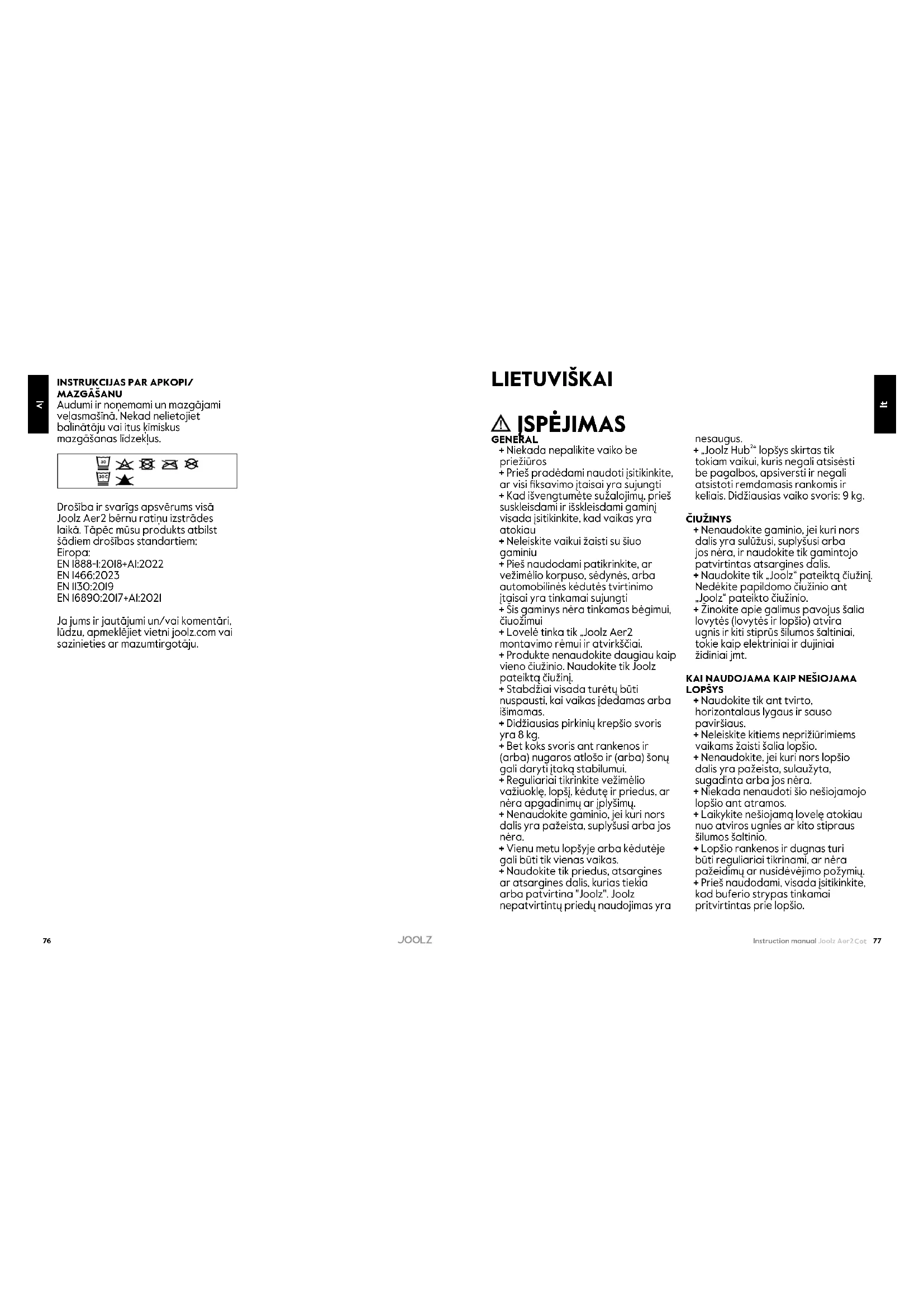 Audiniai yra nuimami ir skalbiami mašinoje. Niekada nenaudokite baliklio arba kitų cheminių ploviklių. Kuriant „Joolz Aer2“ buvo itin atsižvelgiama į saugumą. Todėl mūsų gaminys atitinka šiuos saugos standartus: Europa: EN 1888-1:2018+A1:2022 EN 1466:2023 EN 1130:2019 EN 16890:2017+A1:2021 Aplankykite joolz.com arba susisiekite su pardavėju, jei turite klausimų ir (arba) pastabų. lt8180 Instruction manual Joolz Aer2 Cot