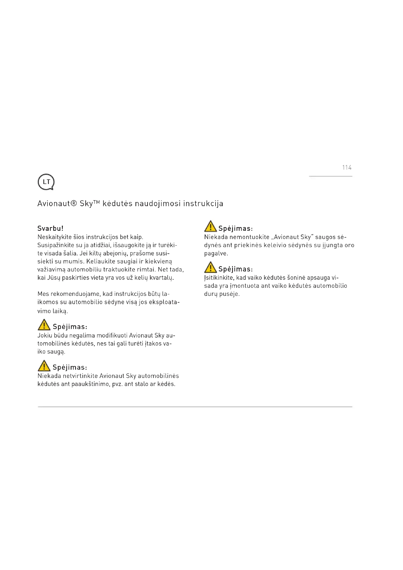- Questa garanzia è stata elaborata da KARWALA, un'azienda registrata in Polonia. L’indirizzo dell'azienda è il seguente: KARWALA Szarlejka, ul. Lukaszewicza 172 42-130 Wreczyca Wielka, Polska (1) I prodotti acquistati con etichette o numeri di identificazione rimossi o alterati sono considerati non autorizzati. Poiché l'autenticità di tali prodotti non può essere stabilita, la garanzia non copre tali prodotti. 113Svarbu! Neskaitykite šios instrukcijos bet kaip. Susipažinkite su ja atidžiai, išsaugokite ją ir turėki- te visada šalia. Jei kiltų abejonių, prašome susi- siekti su mumis. Keliaukite saugiai ir kiekvieną važiavimą automobiliu traktuokite rimtai. Net tada, kai Jūsų paskirties vieta yra vos už kelių kvartalų. Mes rekomenduojame, kad instrukcijos būtų la- ikomos su automobilio sėdyne visą jos eksploata- vimo laiką. Spėjimas: Jokiu būdu negalima modifikuoti Avionaut Sky au- tomobilinės kėdutės, nes tai gali turėti įtakos va- iko saugą. Spėjimas: Niekada netvirtinkite Avionaut Sky automobilinės kėdutės ant paaukštinimo, pvz. ant stalo ar kėdės. Avionaut® Sky™ kėdutės naudojimosi instrukcija Spėjimas: Niekada nemontuokite „Avionaut Sky“ saugos sė- dynės ant priekinės keleivio sėdynės su įjungta oro pagalve. Spėjimas: Įsitikinkite, kad vaiko kėdutės šoninė apsauga vi- sada yra įmontuota ant vaiko kėdutės automobilio durų pusėje.