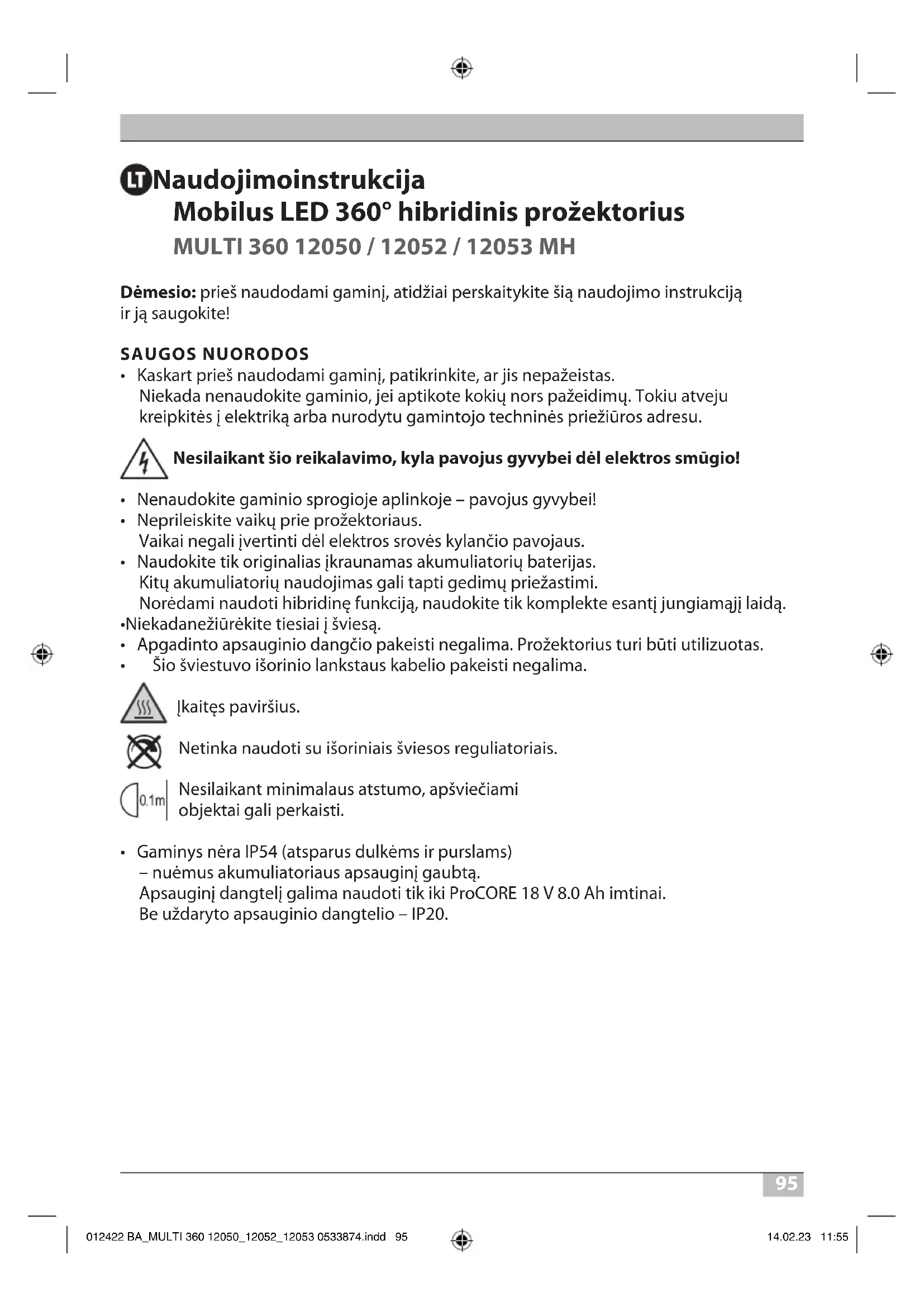 ES atitikties deklaraciją turi gamintojas. ŠALINIMAS Ekologiškai šalinkite elektros prietaisus! Elektros prietaisus draudžiama šalinti su buitinėmis atliekomis! Remiantis ES direktyva 2012/19/ES dėl elektros ir elektroninės įrangos atliekų, naudotus elektros prietaisus privaloma surinkti atskirai ir atiduoti ekologiškai perdirbti. Dėl nebenaudojamų prietaisų šalinimo galimybių teiraukitės savo savivaldybėje. 012422 BA_MULTI 360 12050_12052_12053 0533874.indd 98012422 BA_MULTI 360 12050_12052_12053 0533874.indd 98 14.02.23 11:5514.02.23 11:5599 MULTI 360 12050 / 12052 / 12053 MH Naudojimo instrukcija ŠALINIMAS Baterijos ir įkraunamos baterijos nėra buitinės atliekos! Jūs, kaip vartotojas, esate teisiškai įpareigotas atiduoti visas baterijas ir akumuliatorius į surinkimo punktą savo savivaldybėje / rajone ar parduotuvėse, kad juos būtų galima utilizuoti ekologiškai, nes kitaip gali kilti pavojus aplinkai ir žmonių sveikatai. GAMINTOJAS Hugo Brennenstuhl GmbH & Co. KG Seestraße 1-3 · D-72074 Tübingen H. Brennenstuhl S.A.S. 4 rue de Bruxelles ∙ F-67170 Bernolsheim lectra technik ag Blegistrasse 13 · CH-6340 Baar Dėl išsamesnės informacijos rekomenduojame apsilankyti mūsų svetainėje www.brennenstuhl.com, skiltyje „Service“ / „FAQs“ (Paslauga / DUK). 012422 BA_MULTI 360 12050_12052_12053 0533874.indd 99012422 BA_MULTI 360 12050_12052_12053 0533874.indd 99 14.02.23 11:5514.02.23 11:55Lietošanas instrukcija Mobilais LED 360° hibrīda prožektors MULTI 360 12050 / 12052 / 12053 MH Uzmanību: pirms izstrādājuma lietošanas uzmanīgi izlasiet un saglabājiet lietošanas pamācību!