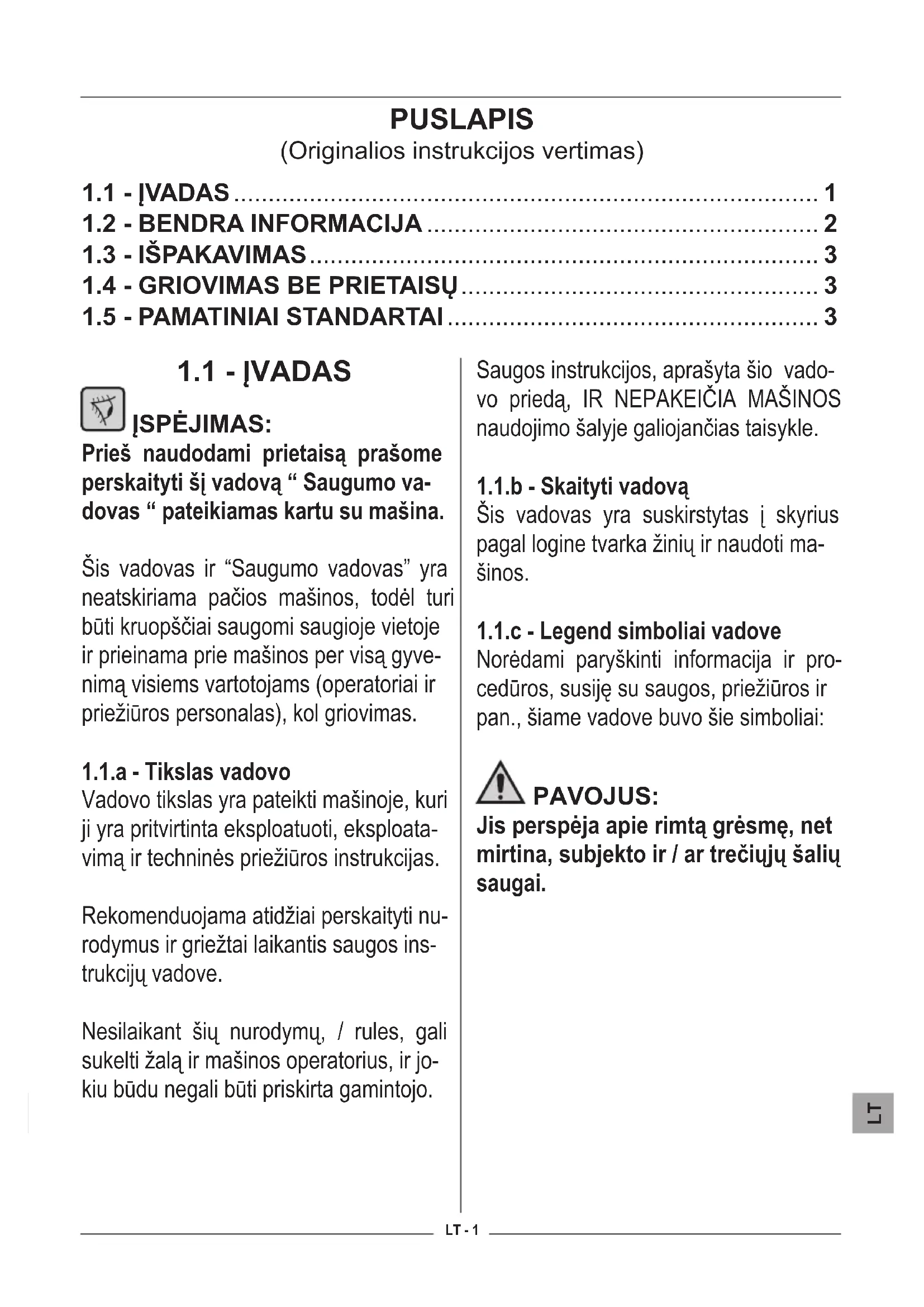 Vadovo tikslas yra pateikti mašinoje, kuri ji yra pritvirtinta eksploatuoti, eksploata- vimą ir techninės priežiūros instrukcijas. Rekomenduojama atidžiai perskaityti nu- rodymus ir griežtai laikantis saugos ins- trukcijų vadove. Nesilaikant šių nurodymų, / rules, gali sukelti žalą ir mašinos operatorius, ir jo- kiu būdu negali būti priskirta gamintojo. Saugos instrukcijos, aprašyta šio vado- vo priedą, IR NEPAKEIČIA MAŠINOS naudojimo šalyje galiojančias taisykle.
