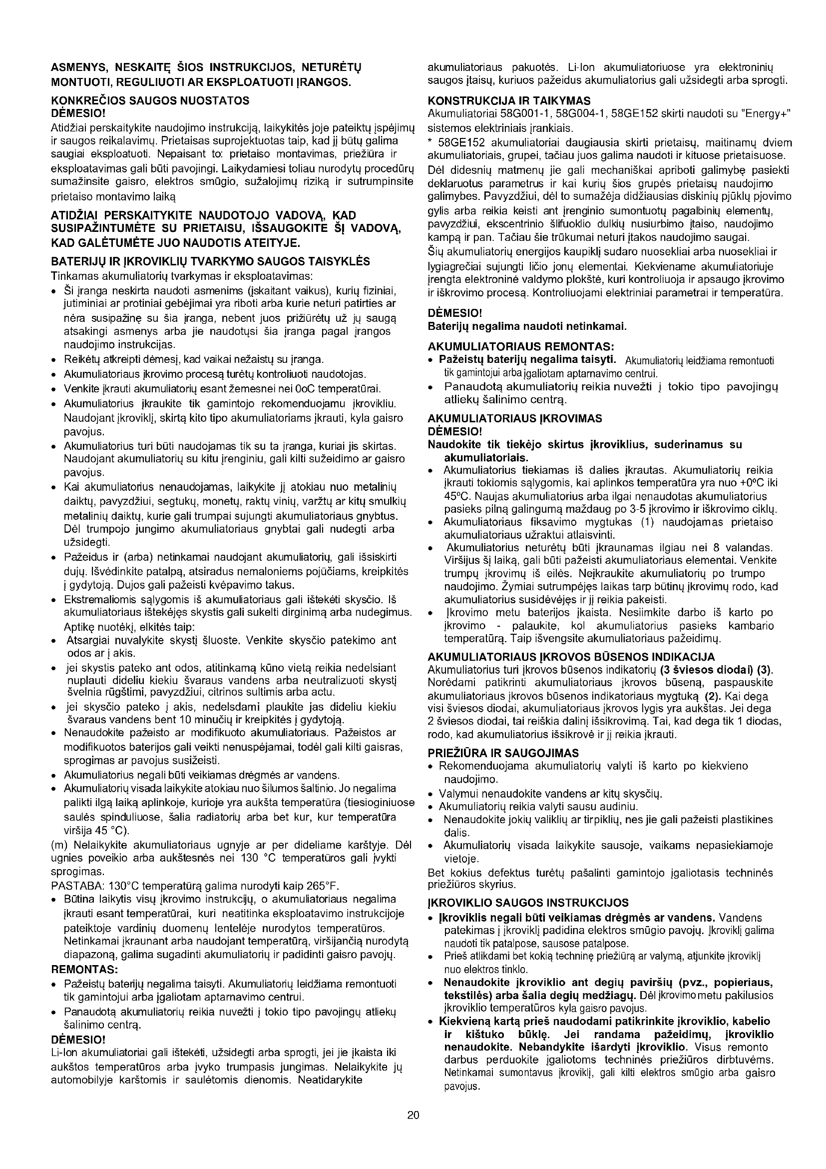 - 58GE152 akumuliatoriai daugiausia skirti prietaisų, maitinamų dviem akumuliatoriais, grupei, tačiau juos galima naudoti ir kituose prietaisuose. Dėl didesnių matmenų jie gali mechaniškai apriboti galimybę pasiekti deklaruotus parametrus ir kai kurių šios grupės prietaisų naudojimo galimybes. Pavyzdžiui, dėl to sumažėja didžiausias diskinių pjūklų pjovimo gylis arba reikia keisti ant įrenginio sumontuotų pagalbinių elementų, pavyzdžiui, ekscentrinio šlifuoklio dulkių nusiurbimo įtaiso, naudojimo kampą ir pan. Tačiau šie trūkumai neturi įtakos naudojimo saugai. Šių akumuliatorių energijos kaupiklį sudaro nuosekliai arba nuosekliai ir lygiagrečiai sujungti ličio jonų elementai. Kiekviename akumuliatoriuje įrengta elektroninė valdymo plokštė, kuri kontroliuoja ir apsaugo įkrovimo ir iškrovimo procesą. Kontroliuojami elektriniai parametrai ir temperatūra. DĖMESIO! Baterijų negalima naudoti netinkamai. AKUMULIATORIAUS REMONTAS: