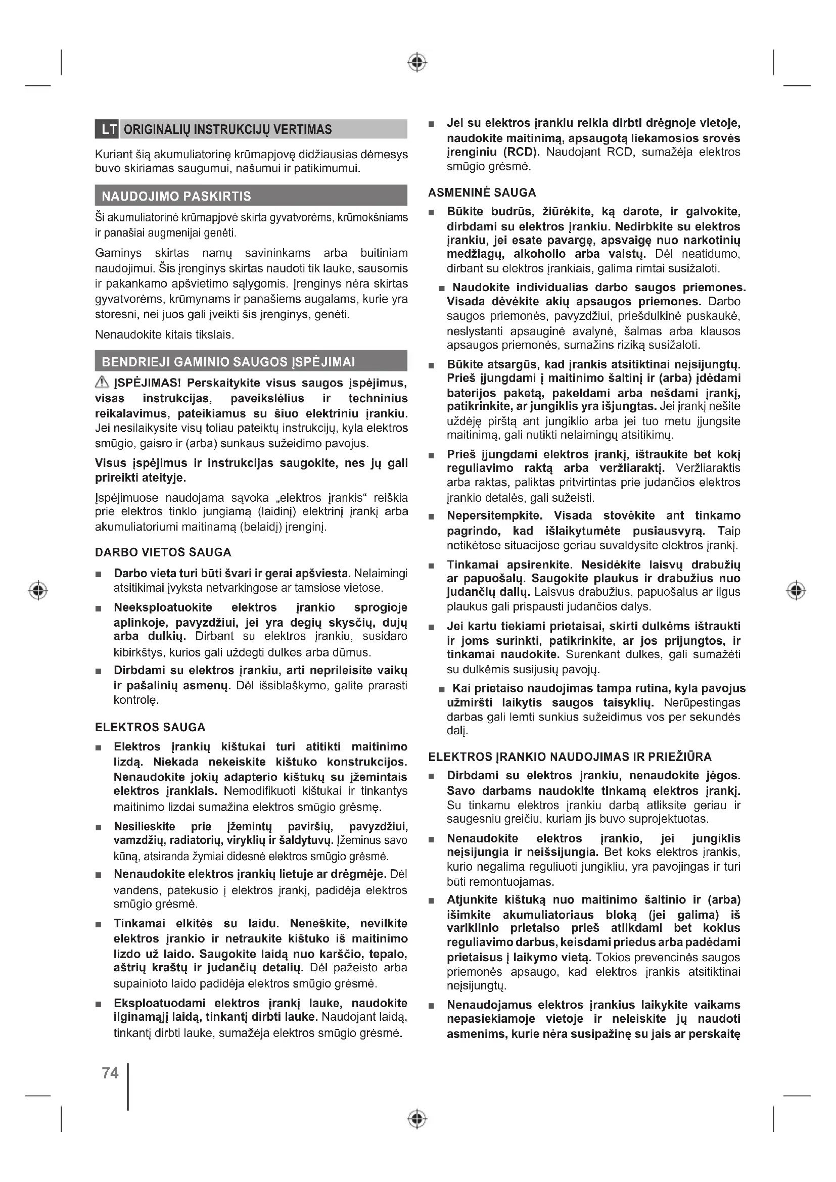 ■ Darbo vieta turi būti švari ir gerai apšviesta. Nelaimingi atsitikimai įvyksta netvarkingose ar tamsiose vietose. ■ Neeksploatuokite elektros įrankio sprogioje aplinkoje, pavyzdžiui, jei yra degių skysčių, dujų arba dulkių. Dirbant su elektros įrankiu, susidaro kibirkštys, kurios gali uždegti dulkes arba dūmus. ■ Dirbdami su elektros įrankiu, arti neprileisite vaikų ir pašalinių asmenų. Dėl išsiblaškymo, galite prarasti kontrolę. ELEKTROS SAUGA ■ Elektros įrankių kištukai turi atitikti maitinimo lizdą. Niekada nekeiskite kištuko konstrukcijos. Nenaudokite jokių adapterio kištukų su įžemintais elektros įrankiais. Nemodifikuoti kištukai ir tinkantys maitinimo lizdai sumažina elektros smūgio grėsmę. ■ Nesilieskite prie įžemintų paviršių, pavyzdžiui, vamzdžių, radiatorių, viryklių ir šaldytuvų. Įžeminus savo kūną, atsiranda žymiai didesnė elektros smūgio grėsmė. ■ Nenaudokite elektros įrankių lietuje ar drėgmėje. Dėl vandens, patekusio į elektros įrankį, padidėja elektros smūgio grėsmė. ■ Tinkamai elkitės su laidu. Neneškite, nevilkite elektros įrankio ir netraukite kištuko iš maitinimo lizdo už laido. Saugokite laidą nuo karščio, tepalo, aštrių kraštų ir judančių detalių. Dėl pažeisto arba supainioto laido padidėja elektros smūgio grėsmė. ■ Eksploatuodami elektros įrankį lauke, naudokite ilginamąjį laidą, tinkantį dirbti lauke. Naudojant laidą, tinkantį dirbti lauke, sumažėja elektros smūgio grėsmė. ■ Jei su elektros įrankiu reikia dirbti drėgnoje vietoje, naudokite maitinimą, apsaugotą liekamosios srovės įrenginiu (RCD). Naudojant RCD, sumažėja elektros smūgio grėsmė. ASMENINĖ SAUGA ■ Būkite budrūs, žiūrėkite, ką darote, ir galvokite, dirbdami su elektros įrankiu. Nedirbkite su elektros įrankiu, jei esate pavargę, apsvaigę nuo narkotinių medžiagų, alkoholio arba vaistų. Dėl neatidumo, dirbant su elektros įrankiais, galima rimtai susižaloti. ■ Naudokite individualias darbo saugos priemones. Visada dėvėkite akių apsaugos priemones. Darbo saugos priemonės, pavyzdžiui, priešdulkinė puskaukė, neslystanti apsauginė avalynė, šalmas arba klausos apsaugos priemonės, sumažins riziką susižaloti. ■ Būkite atsargūs, kad įrankis atsitiktinai neįsijungtų. Prieš įjungdami į maitinimo šaltinį ir (arba) įdėdami baterijos paketą, pakeldami arba nešdami įrankį, patikrinkite, ar jungiklis yra išjungtas. Jei įrankį nešite uždėję pirštą ant jungiklio arba jei tuo metu įjungsite maitinimą, gali nutikti nelaimingų atsitikimų. ■ Prieš įjungdami elektros įrankį, ištraukite bet kokį reguliavimo raktą arba veržliaraktį. Veržliaraktis arba raktas, paliktas pritvirtintas prie judančios elektros įrankio detalės, gali sužeisti. ■ Nepersitempkite. Visada stovėkite ant tinkamo pagrindo, kad išlaikytumėte pusiausvyrą. Taip netikėtose situacijose geriau suvaldysite elektros įrankį. ■ Tinkamai apsirenkite. Nesidėkite laisvų drabužių ar papuošalų. Saugokite plaukus ir drabužius nuo judančių dalių. Laisvus drabužius, papuošalus ar ilgus plaukus gali prispausti judančios dalys. ■ Jei kartu tiekiami prietaisai, skirti dulkėms ištraukti ir joms surinkti, patikrinkite, ar jos prijungtos, ir tinkamai naudokite. Surenkant dulkes, gali sumažėti su dulkėmis susijusių pavojų. ■ Kai prietaiso naudojimas tampa rutina, kyla pavojus užmiršti laikytis saugos taisyklių. Nerūpestingas darbas gali lemti sunkius sužeidimus vos per sekundės dalį. ELEKTROS ĮRANKIO NAUDOJIMAS IR PRIEŽIŪRA ■ Dirbdami su elektros įrankiu, nenaudokite jėgos. Savo darbams naudokite tinkamą elektros įrankį. Su tinkamu elektros įrankiu darbą atliksite geriau ir saugesniu greičiu, kuriam jis buvo suprojektuotas. ■ Nenaudokite elektros įrankio, jei jungiklis neįsijungia ir neišsijungia. Bet koks elektros įrankis, kurio negalima reguliuoti jungikliu, yra pavojingas ir turi būti remontuojamas. ■ Atjunkite kištuką nuo maitinimo šaltinio ir (arba) išimkite akumuliatoriaus bloką (jei galima) iš variklinio prietaiso prieš atlikdami bet kokius reguliavimo darbus, keisdami priedus arba padėdami prietaisus į laikymo vietą. Tokios prevencinės saugos priemonės apsaugo, kad elektros įrankis atsitiktinai neįsijungtų. ■ Nenaudojamus elektros įrankius laikykite vaikams nepasiekiamoje vietoje ir neleiskite jų naudoti asmenims, kurie nėra susipažinę su jais ar perskaitęLIETUVIŠKAI