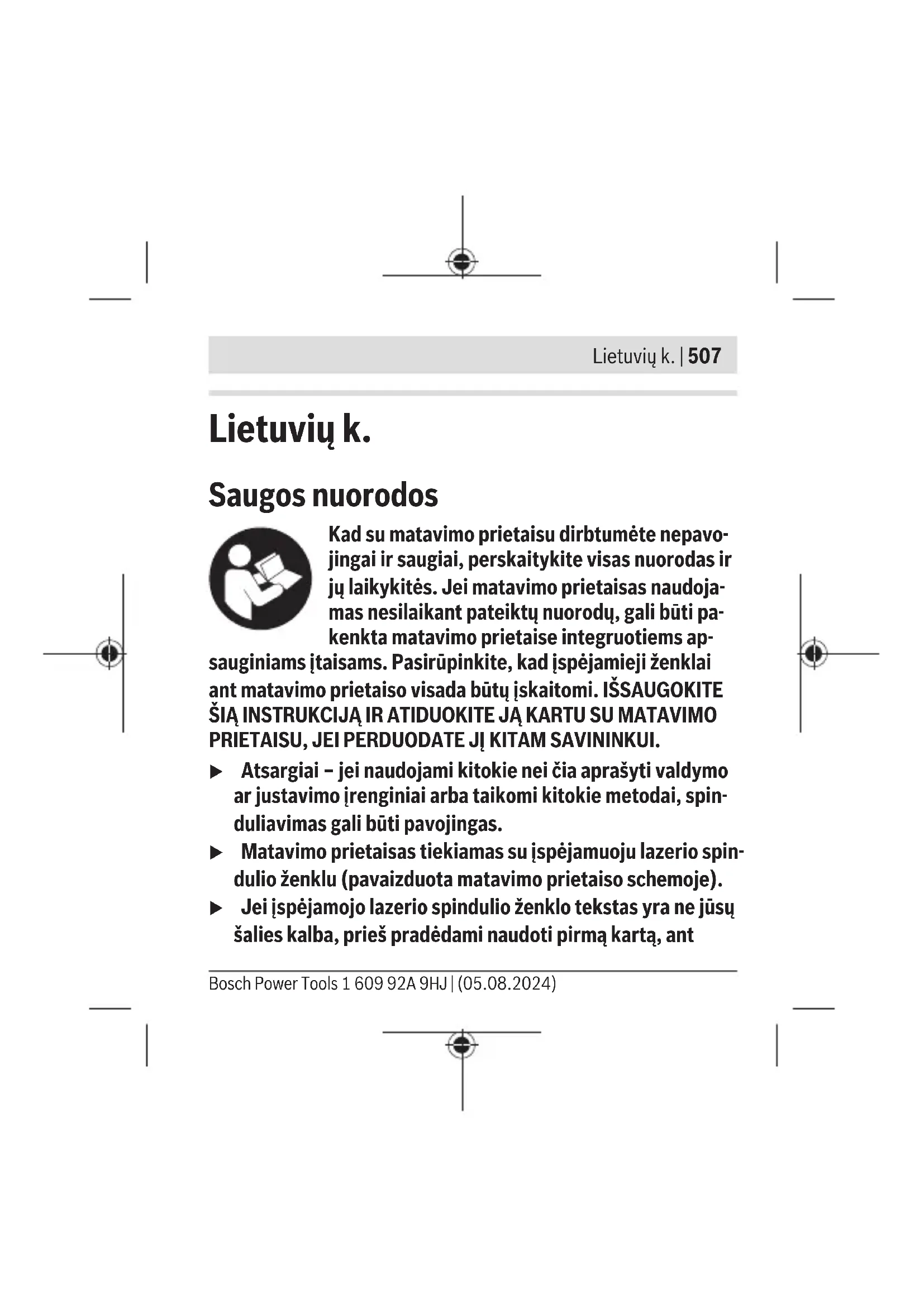 esant 20–25°C D) Nurodytos vertės galioja esant normalios ir palankioms aplinkos sąly- goms (pvz., nėra vibracijos, nėra rūko, nėra dūmų, nėra tiesioginio saulės spinduliavimo). Po didelių temperatūros svyravimų gali atsira- sti tikslumo nuokrypių. E) Atsiranda tik nelaidžių nešvarumų, tačiau galima tikėtis aprasojimo sukelto laikino laidumo. F) Svoris su sieniniu laikikliu, be baterijų/akumuliatorių Firminėje lentelėje esantis gaminio numeris (11) yra skirtas jūsų matavimo prietaisui vienareikšmiškai identifikuoti. 1 609 92A 9HJ | (05.08.2024) Bosch Power ToolsLietuvių k. | 515 Energijos tiekimas į matavimo prietaisą Baterijų įdėjimas/keitimas Matavimo prietaisą patariama naudoti su šarminėmis mangano baterijomis arba akumuliatoriais. Norėdami atidaryti baterijų skyriaus dangtelį(8), paspauskite fiksatorių(7) ir nuimkite baterijų skyriaus dangtelį. Įdėkite bate- rijas ar akumuliatorius. Įdėdami baterijas atkreipkite dėmesį į baterijų skyriaus viduje nu- rodytus baterijų polius. Visada kartu pakeiskite visas baterijas ar akumuliatorius. Naudo- kite tik vieno gamintojo ir vienodos talpos baterijas ar akumuliato- rius. u Jei matavimo prietaiso ilgesnį laiką nenaudosite, išimkite iš jo baterijas ar akumuliatorius. Matavimo prietaise ilgiau laikomos baterijos ir akumuliatoriai dėl korozijos gali pradėti ir- ti. Bosch Power Tools 1 609 92A 9HJ | (05.08.2024)516 | Lietuvių k. Naudojimas Paruošimas naudoti u Saugokite matavimo prietaisą nuo drėgmės ir tiesioginio saulės spindulių poveikio. u Matavimo prietaisą saugokite nuo itin aukštos ir žemos temperatūros bei temperatūros svyravimų. Pvz., nepalikite jo ilgesniam laikui automobilyje. Esant didesniems temperatū- ros svyravimams, prieš įjungdami matavimo prietaisą, palau- kite, kol stabilizuosis jo temperatūra. Esant ypač aukštai ir že- mai temperatūrai arba temperatūros svyravimams, gali būti pakenkiama matavimo prietaiso tikslumui. u Saugokite, kad matavimo prietaisas nebūtų smarkiai sutre- nktas ir nenukristų. Pažeidus matavimo prietaisą gali būti pa- kenkiama tikslumui. Prietaisui nukritus arba jį sutrenkus, patik- rinkite lazerio spindulio liniją su žinoma horizontalia ar vertika- lia atskaitos linija. u Visada žymėkite tik lazerio taško ar lazerio linijos vidurį. Lazerio taško dydis ir lazerio linijos plotis kinta priklausomai nuo atstumo. 1 609 92A 9HJ | (05.08.2024) Bosch Power ToolsLietuvių k. | 517 Įjungimas ir išjungimas Norėdami matavimo prietaisą įjungti taškiniu režimu, pastum- kite įjungimo-išjungimo jungiklį (2) vieną pakopą lazerio spindulio išėjimo angų kryptimi (jungiklio padėtis ●). Norėdami įjungti linijiniu režimu, stumkite įjungimo-išjungimo jungiklį(2) iki atramos lazerio spindulio išėjimo angų kryptimi (jungiklio padėtis—). Įjungus matavimo prietaisą, priklausomai nuo pasirinkto veikimo režimo, prietaisas iškart siunčia lazerio spindulį per spindulio iš- ėjimo angą(6) (taškinis režimas) arba (1) (linijinis režimas). u Nenukreipkite lazerio spindulio į kitus asmenis ar gyvūnus ir nežiūrėkite į lazerio spindulį patys, net ir būdami atokiau nuo prietaiso. Norėdami matavimo prietaisą išjungti, įjungimo-išjungimo jungiklį(2) pastumkite iki atramos kryptimiOFF. u Nepalikite įjungto matavimo prietaiso be priežiūros, o bai- gę su prietaisu dirbti, jį išjunkite. Lazerio spindulys gali ap- akinti kitus žmones. Bosch Power Tools 1 609 92A 9HJ | (05.08.2024)518 | Lietuvių k. Matavimo prietaiso padėties nustatymas (žr.Apav.) Nurodytas niveliavimo tikslumas gali būti pasiektas tik tada, kai matavimo prietaisas yra tinkamoje padėtyje: – Horizontaliai išlyginant horizontaliam išlyginimui skirta gulsčiu- ko ampule(4), matavimo prietaiso atraminis aliuminio paviršius(12) turi būti nukreiptas žemyn. – Vertikaliai išlyginant vertikaliam išlyginimui skirta gulsčiuko ampule(5), lazerio spindulio išėjimo angos (6) ir (1) turi būti nukreiptos aukštyn, o matavimo prietaiso atraminis aliuminio paviršius(12) turi būti nukreiptas į kairę. Pritaikymo galimybės Išlyginimas su lazerio linija (linijinis režimas) Prietaisui veikiant linijiniu režimu, galite, pvz., ant sienų išlyginti daiktus: – horizontaliai vieną šalia kito (matavimo prietaisas nustatytas horizontaliai), – vertikaliai vieną virš kito (matavimo prietaisas nustatytas verti- kaliai), 1 609 92A 9HJ | (05.08.2024) Bosch Power ToolsLietuvių k. | 519 – bet kokiu kampu (matavimo prietaisas nustatytas laikiklio sukamuoju disku (14)). Matavimo prietaisą magneto (9) puse padėkite tiesiai ant vertika- laus magnetinio paviršiaus arba naudokite laikiklį (13). Laikiklio (13) tvirtinimo prie sienos galimybės yra 2: – Tvirtinimas kaiščiais (žr.Bpav.): pridėkite laikiklį (13) prie sienos. Kartu pateiktus kaiščius (18) per laikiklio išėmas įstatykite į sieną (priklausomai nuo sienos savybių – vertikaliai arba 45° kampu). – Pakabinimas: laikiklį (13) užpakaline puse, naudodamiesi ja- me esančia kiauryme, pakabinkite ant varžto, šiek tiek išlin- dusio iš sienos. Laikiklio užpakalinė pusė turi būti prigludusi prie sienos. Įsitikinkite, kad laikiklis (13) patikimai pritvirtintas prie sienos. Matavimo prietaisą magnetu(9) pridėkite prie laikiklio magne- tinio įtvaro(15). Nuoroda: horizontaliai išlyginti su lazerio linija galima tik ant tos sienos, prie kurios pritvirtintas matavimo prietaisas. Net jei ir ma- tosi lazerio linija ant šalia esančių sienų, tai per šias sienas ji nebū- tinai eis horizontaliai. Bosch Power Tools 1 609 92A 9HJ | (05.08.2024)520 | Lietuvių k. Nukreipimas bet kokiu kampu (žr.Cpav.): matavimo prietaisą ant laikiklio nustatykite horizontaliai. Tada pasukite laikiklio suka- mąjį diską(14) taip, kad žymė 0° būtų po matavimo prietaiso pa- dėties indikatoriumi (3). Tada pasukite matavimo prietaisą taip, kad padėties indikatoriu