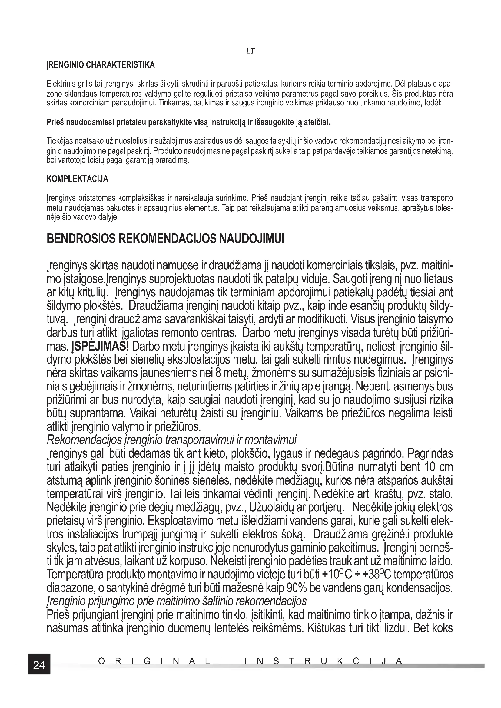 Įrenginys skirtas naudoti namuose ir draudžiama jį naudoti komerciniais tikslais, pvz. maitini- mo įstaigose.Įrenginys suprojektuotas naudoti tik patalpų viduje. Saugoti įrenginį nuo lietaus ar kitų kritulių. Įrenginys naudojamas tik terminiam apdorojimui patiekalų padėtų tiesiai ant šildymo plokštės. Draudžiama įrenginį naudoti kitaip pvz., kaip inde esančių produktų šildy- tuvą. Įrenginį draudžiama savarankiškai taisyti, ardyti ar modifi kuoti. Visus įrenginio taisymo darbus turi atlikti įgaliotas remonto centras. Darbo metu įrenginys visada turėtų būti prižiūri- mas. ĮSPĖJIMAS! Darbo metu įrenginys įkaista iki aukštų temperatūrų, neliesti įrenginio šil- dymo plokštės bei sienelių eksploatacijos metu, tai gali sukelti rimtus nudegimus. Įrenginys nėra skirtas vaikams jaunesniems nei 8 metų, žmonėms su sumažėjusiais fi ziniais ar psichi- niais gebėjimais ir žmonėms, neturintiems patirties ir žinių apie įrangą. Nebent, asmenys bus prižiūrimi ar bus nurodyta, kaip saugiai naudoti įrenginį, kad su jo naudojimo susijusi rizika būtų suprantama. Vaikai neturėtų žaisti su įrenginiu. Vaikams be priežiūros negalima leisti atlikti įrenginio valymo ir priežiūros. Rekomendacijos įrenginio transportavimui ir montavimui Įrenginys gali būti dedamas tik ant kieto, plokščio, lygaus ir nedegaus pagrindo. Pagrindas turi atlaikyti paties įrenginio ir į jį įdėtų maisto produktų svorį.Būtina numatyti bent 10 cm atstumą aplink įrenginio šonines sieneles, nedėkite medžiagų, kurios nėra atsparios aukštai temperatūrai virš įrenginio. Tai leis tinkamai vėdinti įrenginį. Nedėkite arti kraštų, pvz. stalo. Nedėkite įrenginio prie degių medžiagų, pvz., Užuolaidų ar portjerų. Nedėkite jokių elektros prietaisų virš įrenginio. Eksploatavimo metu išleidžiami vandens garai, kurie gali sukelti elek- tros instaliacijos trumpąjį jungimą ir sukelti elektros šoką. Draudžiama gręžinėti produkte skyles, taip pat atlikti įrenginio instrukcijoje nenurodytus gaminio pakeitimus. Įrenginį perneš- ti tik jam atvėsus, laikant už korpuso. Nekeisti įrenginio padėties traukiant už maitinimo laido. Temperatūra produkto montavimo ir naudojimo vietoje turi būti +10