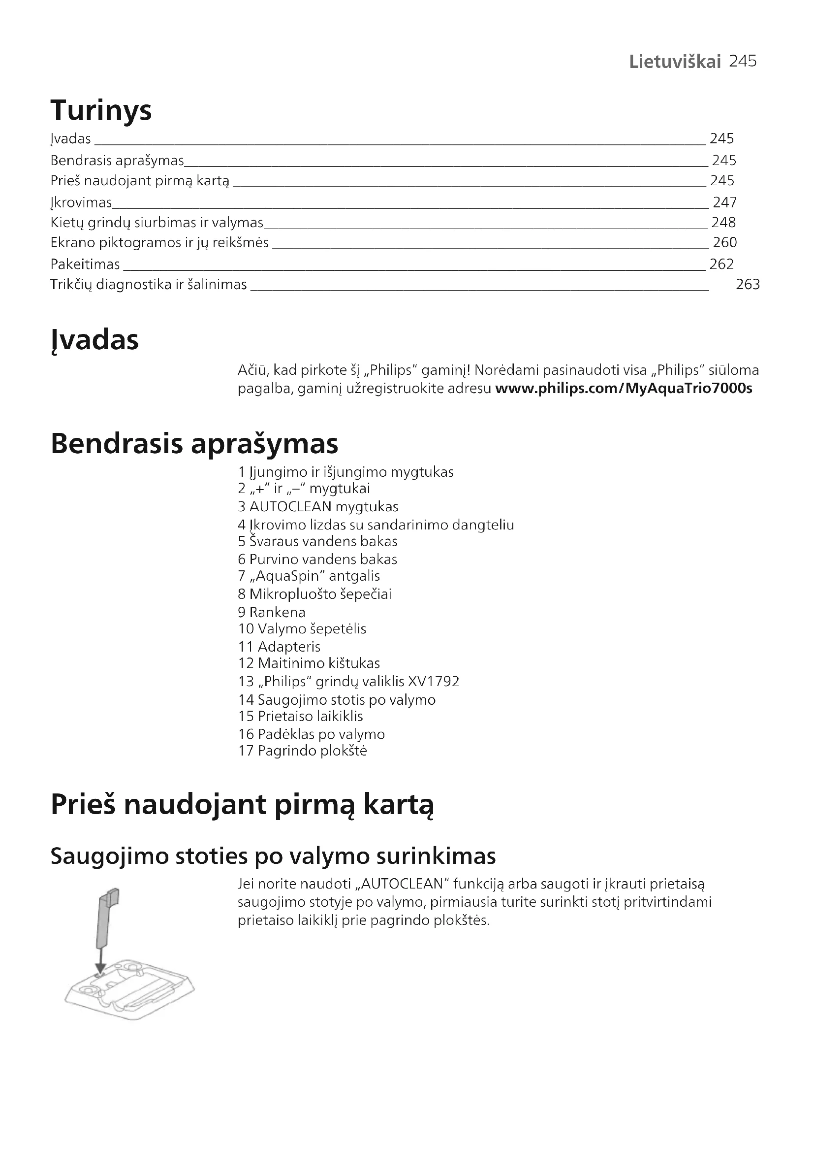 Lietuviškai Turinys Įvadas ____________________________________________________________________________________ 245 Bendrasis aprašymas________________________________________________________________________ 245 Prieš naudojant pirmą kartą _________________________________________________________________ 245 Įkrovimas__________________________________________________________________________________ 247 Kietų grindų siurbimas ir valymas_____________________________________________________________ 248 Ekrano piktogramos ir jų reikšmės ____________________________________________________________ 260 Pakeitimas ________________________________________________________________________________ 262 Trikčių diagnostika ir šalinimas _______________________________________________________________ 263 Įvadas Ačiū, kad pirkote šį „Philips“ gaminį! Norėdami pasinaudoti visa „Philips“ siūloma pagalba, gaminį užregistruokite adresu www.philips.com/MyAquaTrio7000s Bendrasis aprašymas 1 Įjungimo ir išjungimo mygtukas 2 „+“ ir „–“ mygtukai 3 AUTOCLEAN mygtukas 4 Įkrovimo lizdas su sandarinimo dangteliu 5 Švaraus vandens bakas 6 Purvino vandens bakas 7 „AquaSpin“ antgalis 8 Mikropluošto šepečiai 9 Rankena 10 Valymo šepetėlis 11 Adapteris 12 Maitinimo kištukas 13 „Philips“grindų valiklis XV1792 14 Saugojimo stotis po valymo 15 Prietaiso laikiklis 16 Padėklas po valymo 17 Pagrindo plokštė Prieš naudojant pirmą kartą Saugojimo stoties po valymo surinkimas Jei norite naudoti „AUTOCLEAN“ funkciją arba saugoti ir įkrauti prietaisą saugojimo stotyje po valymo, pirmiausia turite surinkti stotį pritvirtindami prietaiso laikiklį prie pagrindo plokštės.246 Lietuviškai Pastaba. Įsitikinkite, kad padėklas po valymo yra sumontuotas ant pagrindo plokštės ir kad temperatūra kambaryje, kuriame yra laikomas, įkraunamas ir valomas prietaisas, yra tarp 5°C ir 35°C. Pastaba. Valymo šepetį taip pat galite laikyti ant padėklo po valymo. 1 Norėdami prietaisą surinkti, įstatykite rankeną į pagrindinį korpusą (išgirsite spragtelėjimą). 2 Norėdami prietaisą laikyti, jį galite įdėti į saugojimo stotelę po valymo. Prietaisą užstumkite ant prietaiso laikiklio, kad prietaiso laikiklio galas įsistatytų į prietaisą. Jei prietaisą vėl norite išardyti, atlikite toliau nurodytus veiksmus. 1 Įstatykite smeigę/ plokščią atsuktuvą į angą prietaiso gale ir patraukite rankeną aukštyn. 2 Rankeną ištraukite iš prietaiso toliau spausdami atsuktuvą į angą.247 Lietuviškai Įkrovimas Prietaise įrengta 25 V ličio jonų baterija. Įkrovimas trunka 4 valandas. 1 Norėdami prietaisą įkrauti, atidarykite sandarinimo dangtelį prietaiso gale. 2 Įkiškite maitinimo kištuką į lizdą, esantį galinėje prietaiso dalyje. Tada įjunkite adapterį į sieninį elektros lizdą. 3 Ekrane mirksinti 0–90 % vertė reiškia, kad prietaisas yra kraunamas. 4 Kai prietaisas visiškai įkraunamas, ekrane pasirodo 100 % vertė. Po kelių minučių ekranas išsijungia. 5 Ištraukite maitinimo kištuką iš lizdo prietaiso gale. 6 Uždarykite sandarinimo dangtelį. Įspėjimas. Laikykite ir kraukite prietaisą ne žemesnėje kaip 5°C ir ne aukštesnėje kaip 35°C temperatūroje.248 Lietuviškai Patarimas: Prietaisą galite įkrauti saugojimo stotyje po valymo. Patarimas: Prietaisą galite įkrauti atskirai, toje vietoje, kuri jums patogiausia. Kietų grindų siurbimas ir valymas Prietaiso naudojimas Pristačius prietaisą prie jo jau yra prijungtas švaraus vandens bakas ir nešvaraus vandens bakas jau yra prijungti. Prietaisą galite naudoti kietoms grindims valyti. Pastaba. Šis prietaisas tinka tuo pačiu metu siurbti ir plauti grindis. Prieš plaunant grindis nebūtina jų išsiurbti. Prietaisas tinka visų tipų kietoms grindims (išskyrus nepadengtas medines grindis) siurbti ir plauti. Prietaisą galite išbandyti nedideliame plote, mažiau matomoje vietoje, kad įsitikintumėte, jog prietaisas tinkamas jūsų grindims. 1 Paspauskite mygtuką žemyn, kad atrakintumėte švaraus vandens bakelį, tada jį išimkite. 2 Atidarykite dangtelį ant švaraus vandens bakelio.249 Lietuviškai 3 Įpilkite 15 ml XV1792 „Philips“ grindų valiklio, kad išvalytumėte vandens baką. Atsargiai! Šį prietaisą „Philips“ išbandė tik su XV1792 „Philips“ grindų valikliu. Naudojant kitus ploviklius gali susidaryti per daug putų, todėl sumažės prietaiso našumas ir gali sutrikti jo veikimas. XV1792 „Philips“ grindų valiklis yra parduodamas tam tiktose rinkose. Jei naudojate bet kokį kitą skystą grindų valiklį, įpilkite daugiausiai 15 ml valiklio į švaraus vandens baką. 4 Švaraus vandens bakelį iki viršaus pripildykite šalto arba drungno vandens iš čiaupo. Atsargiai! Pilamo į švaraus vandens baką vandens iš čiaupo temperatūra negali būti didesnė nei 50 °C. 5 Uždarykite vandens bakelį sandarinimo dangteliu. 6 Švaraus vandens baką vėl įstatykite į prietaisą.250 Lietuviškai 7 Prietaisą išimkite iš stotelės po valymo ir padėkite ant grindų. Uždėkite pėdą ant „AquaSpin“ antgalio ir traukite rankeną atgal, kad „AquaSpin“ antgalį atrakintumėte. Dabar prietaisas paruoštas naudoti. 8 Norėdami įjungti prietaisą, paspauskite įjungimo/ išjungimo mygtuką. Prietaisas įsijungs. Atsargiai! Nepalikite prietaiso be priežiūros, kai „AquaSpin“ antgalis atrakintas arba kai prietaisas įjungtas. 9 Naudokitės mygtukais „+“ ir „–“ norėdami perjungti šiuos tris nustatymus: