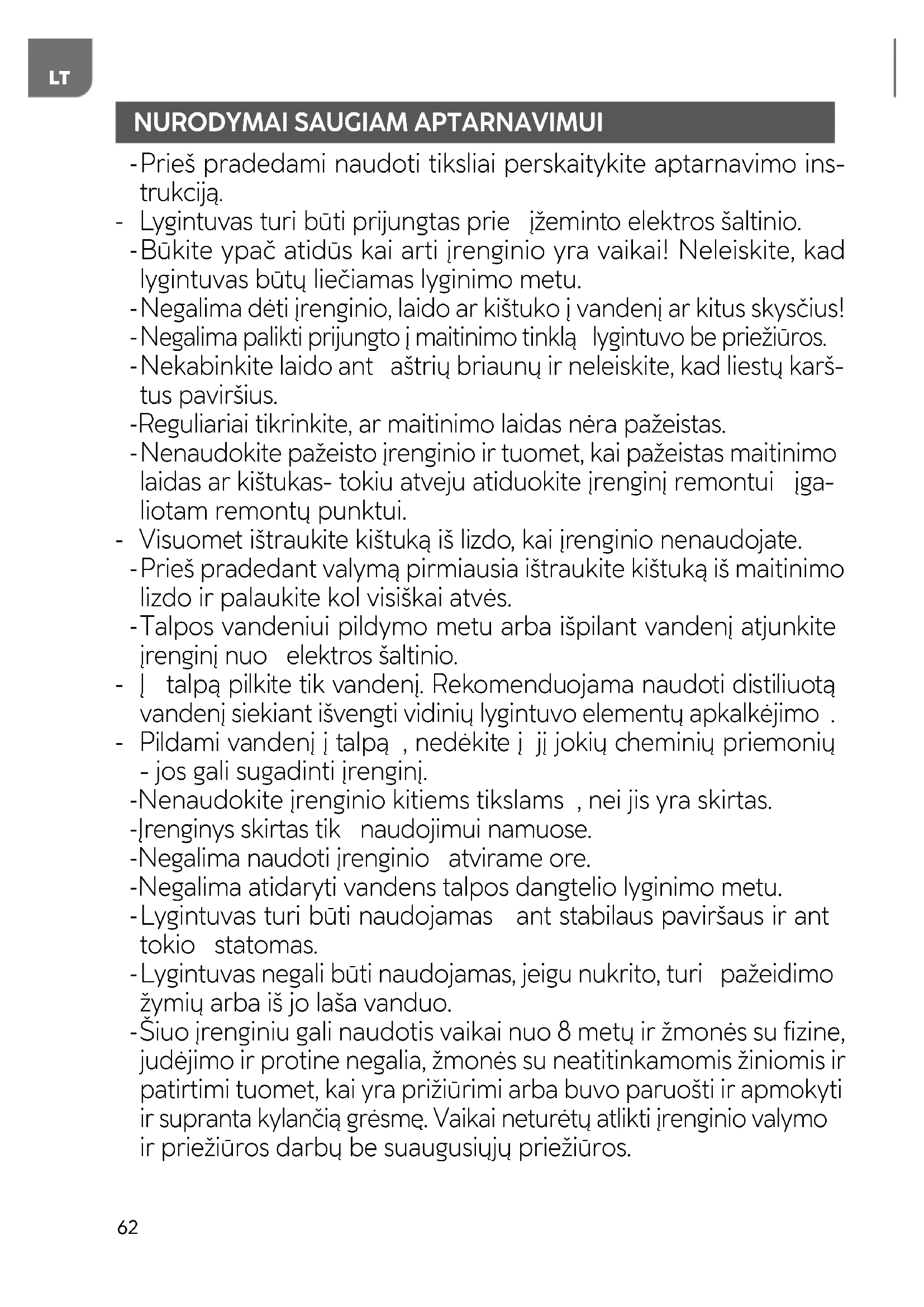 Talpos vandeniui pildymo metu arba išpilant vandenį atjunkite įrenginį nuo elektros šaltinio. - Į talpą pilkite tik vandenį. Rekomenduojama naudoti distiliuotą vandenį siekiant išvengti vidinių lygintuvo elementų apkalkėjimo . - Pildami vandenį į talpą , nedėkite į jį jokių cheminių priemonių - jos gali sugadinti įrenginį. - Nenaudokite įrenginio kitiems tikslams , nei jis yra skirtas. - Įrenginys skirtas tik naudojimui namuose. - Negalima naudoti įrenginio atvirame ore. - Negalima atidaryti vandens talpos dangtelio lyginimo metu.