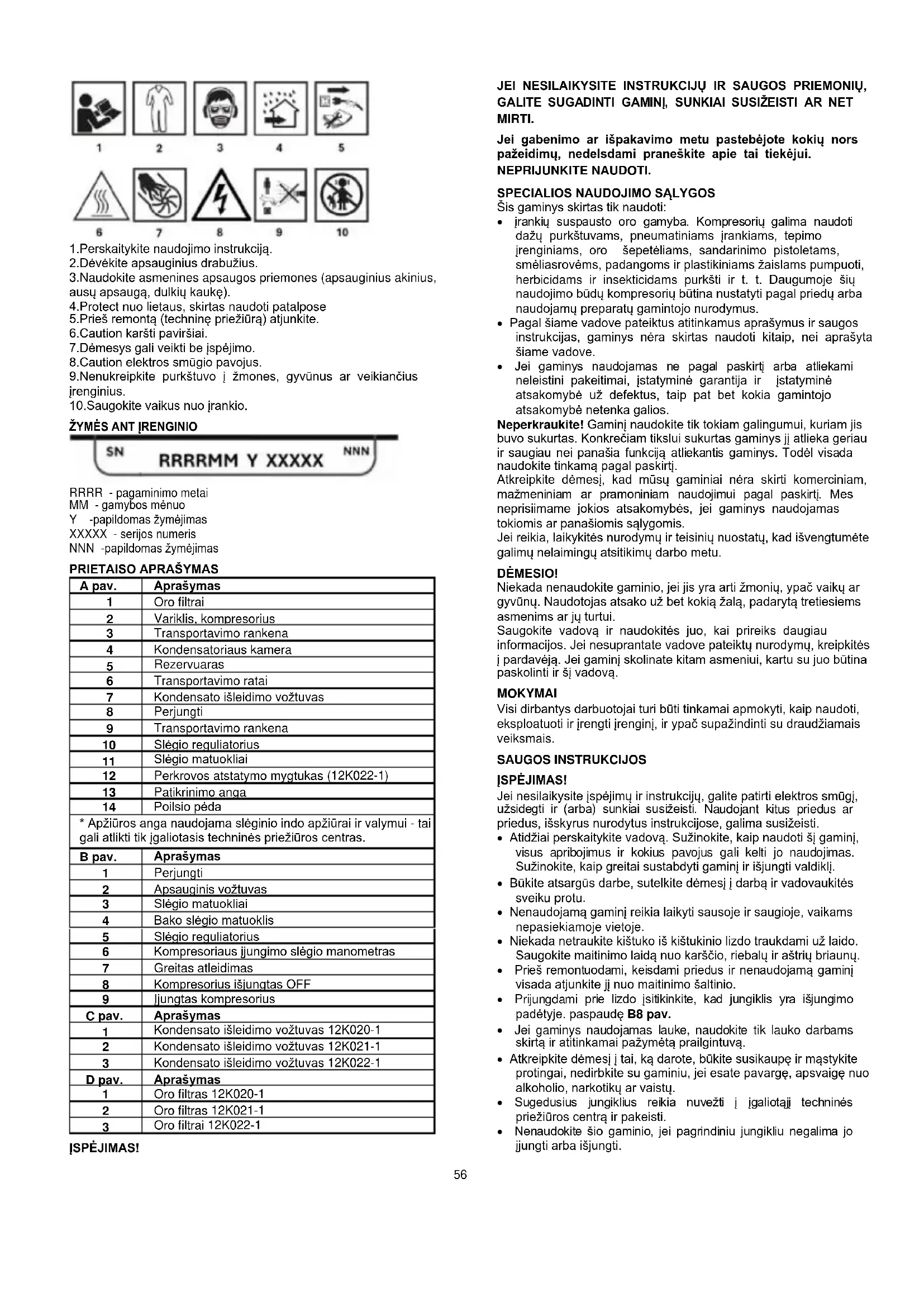 - Triukšmo keliamas pavojus, kad gali sutrikti klausa (kurtumas) ir atsirasti kitų fiziologinių sutrikimų (pvz., pusiausvyros praradimas, sąmonės netekimas). Vibracijos rizika (sukelia kraujagyslių ir neurologinius rankų-rankų sistemos pažeidimus, pvz., vadinamąją "baltųjų pirštų ligą"). ĮSPĖJIMAS! Gaminys sukuria labai mažo intensyvumo elektromagnetinį lauką. Šis laukas gali trikdyti kai kurių širdies stimuliatorių veikimą. Norėdami sumažinti sunkių ar mirtinų sužalojimų riziką, žmonės, turintys širdies stimuliatorių, turėtų pasikonsultuoti su gydytoju. Jei nėra apsaugos nuo viršįtampių, naudotojas turi užtikrinti, kad maitinimo grandinėje būtų sumontuotas apsaugos nuo viršįtampių įtaisas. Jis turi atitikti standarto EN60204-1 reikalavimus. Kreipkitės patarimo į elektriką. Nenaudokite šio kompresoriaus sprogioje aplinkoje: kyla rimtų nelaimingų atsitikimų ir gaisro pavojus.58 Didelė alyvos klampa gali atsirasti šalto paleidimo metu, užsikimšę alyvos filtrai arba vožtuvo gedimas gali sukelti alyvos badą; Kai kompresorius veikia, angos turi būti uždarytos. Nustatykite, kada kompresorius valdomas automatiškai arba nuotoliniu būdu. Imkitės būtinų priemonių, kad būtų užkirstas kelias automatiniam paleidimui arba paleidimui nuotoliniu būdu, kai kompresorius yra aptarnaujamas, prižiūrimas ar tikrinamas: užblokuokite pagrindinį elektros atjungiklį. Išleidimo vamzdyne gali susidaryti koksas ir sukelti gaisrą arba sprogimą. Perdirbtų dujų, kurios gali išstumti kvėpavimo orą, koncentracija turėtų būti priimtino lygio. Naudotojas turėtų vadovautis standartu EN 12021 dėl leistinų teršalų koncentracijų kvėpavimo ore. Prieš pradedant eksploatuoti kompresorių, jo susidariusiems skysčiams apdoroti reikia naudoti separatorius, gaudykles ir evakuacijos įtaisus, nes jie nėra tiekiami; ATRADIMAS