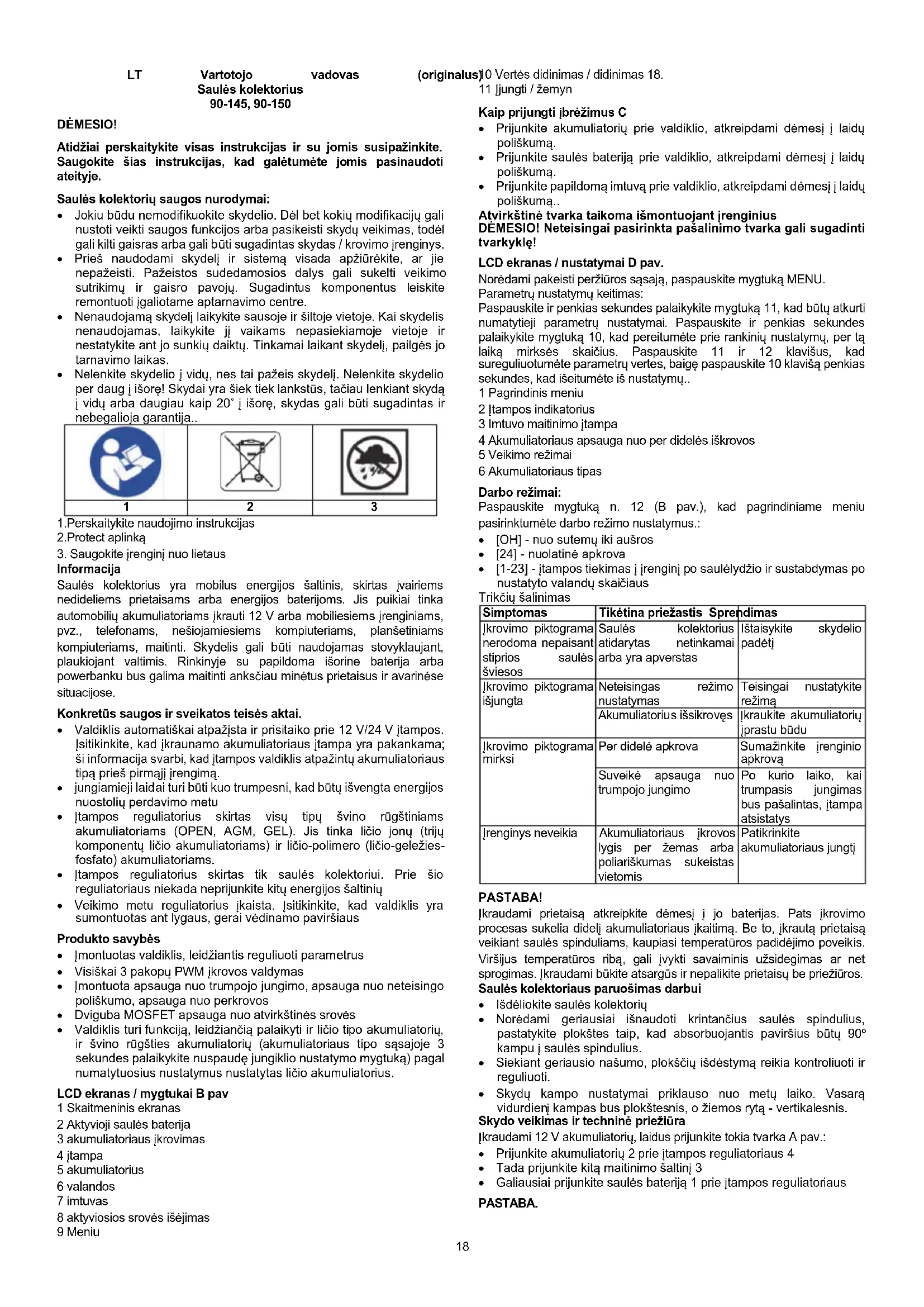 Informacija Saulės kolektorius yra mobilus energijos šaltinis, skirtas įvairiems nedideliems prietaisams arba energijos baterijoms. Jis puikiai tinka automobilių akumuliatoriams įkrauti 12 V arba mobiliesiems įrenginiams, pvz., telefonams, nešiojamiesiems kompiuteriams, planšetiniams kompiuteriams, maitinti. Skydelis gali būti naudojamas stovyklaujant, plaukiojant valtimis. Rinkinyje su papildoma išorine baterija arba powerbanku bus galima maitinti anksčiau minėtus prietaisus ir avarinėse situacijose. Konkretūs saugos ir sveikatos teisės aktai. Valdiklis automatiškai atpažįsta ir prisitaiko prie 12 V/24 V įtampos. Įsitikinkite, kad įkraunamo akumuliatoriaus įtampa yra pakankama; ši informacija svarbi, kad įtampos valdiklis atpažintų akumuliatoriaus tipą prieš pirmąjį įrengimą. jungiamieji laidai turi būti kuo trumpesni, kad būtų išvengta energijos nuostolių perdavimo metu Įtampos reguliatorius skirtas visų tipų švino rūgštiniams akumuliatoriams (OPEN, AGM, GEL). Jis tinka ličio jonų (trijų komponentų ličio akumuliatoriams) ir ličio-polimero (ličio-geležies- fosfato) akumuliatoriams. Įtampos reguliatorius skirtas tik saulės kolektoriui. Prie šio reguliatoriaus niekada neprijunkite kitų energijos šaltinių Veikimo metu reguliatorius įkaista. Įsitikinkite, kad valdiklis yra sumontuotas ant lygaus, gerai vėdinamo paviršiaus Produkto savybės Įmontuotas valdiklis, leidžiantis reguliuoti parametrus Visiškai 3 pakopų PWM įkrovos valdymas Įmontuota apsauga nuo trumpojo jungimo, apsauga nuo neteisingo poliškumo, apsauga nuo perkrovos Dviguba MOSFET apsauga nuo atvirkštinės srovės Valdiklis turi funkciją, leidžiančią palaikyti ir ličio tipo akumuliatorių, ir švino rūgšties akumuliatorių (akumuliatoriaus tipo sąsajoje 3 sekundes palaikykite nuspaudę jungiklio nustatymo mygtuką) pagal numatytuosius nustatymus nustatytas ličio akumuliatorius. LCD ekranas / mygtukai B pav 1 Skaitmeninis ekranas 2 Aktyvioji saulės baterija 3 akumuliatoriaus įkrovimas 4 įtampa 5 akumuliatorius 6 valandos 7 imtuvas 8 aktyviosios srovės išėjimas 9 Meniu 10 Vertės didinimas / didinimas 18. 11 Įjungti / žemyn Kaip prijungti įbrėžimus C Prijunkite akumuliatorių prie valdiklio, atkreipdami dėmesį į laidų poliškumą. Prijunkite saulės bateriją prie valdiklio, atkreipdami dėmesį į laidų poliškumą. Prijunkite papildomą imtuvą prie valdiklio, atkreipdami dėmesį į laidų poliškumą.. Atvirkštinė tvarka taikoma išmontuojant įrenginius DĖMESIO! Neteisingai pasirinkta pašalinimo tvarka gali sugadinti tvarkyklę! LCD ekranas / nustatymai D pav. Norėdami pakeisti peržiūros sąsają, paspauskite mygtuką MENU. Parametrų nustatymų keitimas: Paspauskite ir penkias sekundes palaikykite mygtuką 11, kad būtų atkurti numatytieji parametrų nustatymai. Paspauskite ir penkias sekundes palaikykite mygtuką 10, kad pereitumėte prie rankinių nustatymų, per tą laiką mirksės skaičius. Paspauskite 11 ir 12 klavišus, kad sureguliuotumėte parametrų vertes, baigę paspauskite 10 klavišą penkias sekundes, kad išeitumėte iš nustatymų.. 1 Pagrindinis meniu 2 Įtampos indikatorius 3 Imtuvo maitinimo įtampa 4 Akumuliatoriaus apsauga nuo per didelės iškrovos 5 Veikimo režimai 6 Akumuliatoriaus tipas Darbo režimai: Paspauskite mygtuką n. 12 (B pav.), kad pagrindiniame meniu pasirinktumėte darbo režimo nustatymus.: [OH] - nuo sutemų iki aušros [24] - nuolatinė apkrova [1-23] - įtampos tiekimas į įrenginį po saulėlydžio ir sustabdymas po nustatyto valandų skaičiaus Trikčių šalinimas Simptomas Tikėtina priežastis Sprendimas Įkrovimo piktograma nerodoma nepaisant stiprios saulės šviesos Saulės kolektorius atidarytas netinkamai arba yra apverstas Ištaisykite skydelio padėtį Įkrovimo piktograma išjungta Neteisingas režimo nustatymas Teisingai nustatykite režimą Akumuliatorius išsikrovęs Įkraukite akumuliatorių įprastu būdu Įkrovimo piktograma mirksi Per didelė apkrova Sumažinkite įrenginio apkrovą Suveikė apsauga nuo trumpojo jungimo Po kurio laiko, kai trumpasis jungimas bus pašalintas, įtampa atsistatys Įrenginys neveikia Akumuliatoriaus įkrovos lygis per žemas arba poliariškumas sukeistas vietomis Patikrinkite akumuliatoriaus jungtį PASTABA! Įkraudami prietaisą atkreipkite dėmesį į jo baterijas. Pats įkrovimo procesas sukelia didelį akumuliatoriaus įkaitimą. Be to, įkrautą prietaisą veikiant saulės spinduliams, kaupiasi temperatūros padidėjimo poveikis. Viršijus temperatūros ribą, gali įvykti savaiminis užsidegimas ar net sprogimas. Įkraudami būkite atsargūs ir nepalikite prietaisų be priežiūros. Saulės kolektoriaus paruošimas darbui Išdėliokite saulės kolektorių Norėdami geriausiai išnaudoti krintančius saulės spindulius, pastatykite plokštes taip, kad absorbuojantis paviršius būtų 90º kampu į saulės spindulius. Siekiant geriausio našumo, plokščių išdėstymą reikia kontroliuoti ir reguliuoti. Skydų kampo nustatymai priklauso nuo metų laiko. Vasarą vidurdien į kampas bus plokštesnis, o žiemos rytą - vertikalesnis. Skydo veikimas ir techninė priežiūra Įkraudami 12 V akumuliatorių, laidus prijunkite tokia tvarka A pav.: Prijunkite akumuliatorių 2 prie įtampos reguliatoriaus 4 Tada prijunkite kitą maitinimo šaltinį 3 Galiausiai prijunkite saulės bateriją 1 prie įtampos reguliatoriaus PASTABA.19 Jei yra papildomų vartotojų, vartojančių daug energijos, prijunkite juos tiesiai prie akumuliatoriaus. Saulės generatorių prijunkite tiesiai prie saulės kolektoriaus A pav. Įtampos reguliatoriaus specifikacija Katalogo numeris 90