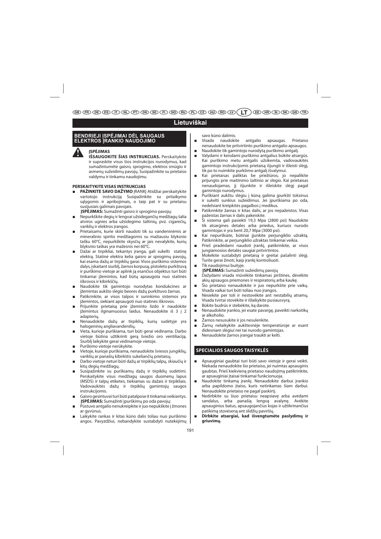 Gardez l’appareil sec, propre, et exempt d’huile et de graisse. Utilisez toujours un chiffon propre pour le nettoyer. N’utilisez jamais de liquide de frein, d’essence, de produits à base de pétrole ou de solvants pour le nettoyer. N’utilisez pas l’appareil si son interrupteur est inopérant. Faites remplacer les interrupteurs défectueux par un service après-vente agréé. Evitez les environnements dangereux. N’utilisez pas l’appareil dans un environnement humide ou mouillé et ne l’exposez pas à la pluie. Gardez la zone de travail bien éclairée. Ne dirigez jamais un jet de peinture vers des personnes ou des animaux, ni vers aucun appareil électrique. Ne démarrez jamais l’appareil si de la glace s’est formée sur l’une de ses parties. Restez à distance des éléments chauds.. Vérifiez que les écrous et boulons sont bien serrés avant chaque utilisation. Un boulon ou un écrou desserré peut gravement détériorer le moteur. Avant de ranger l’appareil, laissez le refroidir. Stockez l’essence dans un lieu frais et bien ventilé, à bonne distance de sécurité de toute source d’étincelle et/ou d’appareil produisant des flammes. N’utilisez jamais le pistolet sans qu’une buse ne soit en place. Une blessure par injection peut conduire à une possible amputation. Consultez immédiatement un médecin. Ne mettez jamais vos mains devant la buse pendant utilisation. Les gants ne protègent pas toujours des blessures par injection. Pendant utilisation, portez des vêtements de protection pour éviter que vos cheveux et votre peau n’entrent en contact avec de la peinture, ainsi qu’un masque respiratoire. La peinture, les solvants et autres produits peuvent être dangereux par inhalation ou par contact avec le corps.