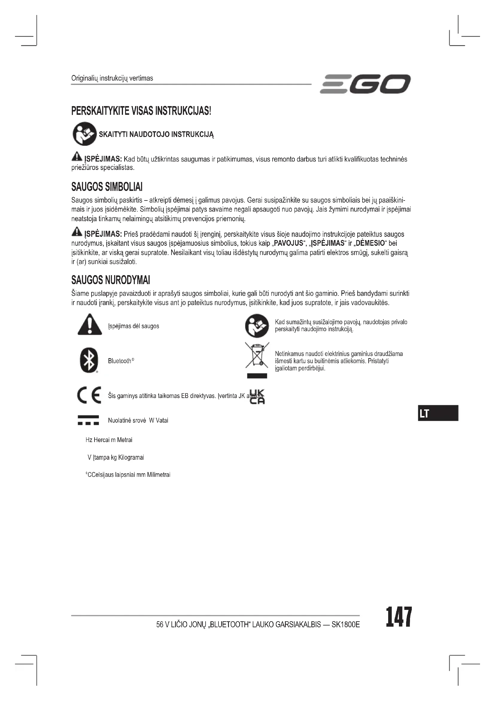 NAUDOJIMO INSTRUKCIJA Power+ SK1800E EGO