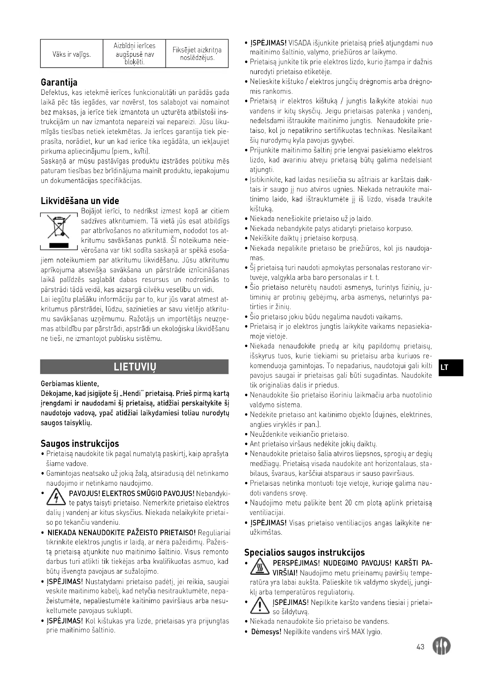 kritumus pārstrādei, lūdzu, sazinieties ar savu vietējo atkritu- mu savākšanas uzņēmumu. Ražotājs un importētājs neuzņe- mas atbildību par pārstrādi, apstrādi un ekoloģisku likvidēšanu ne tieši, ne izmantojot publisku sistēmu. LIETUVIŲ Gerbiamas kliente, Dėkojame, kad įsigijote šį „Hendi“ prietaisą. Prieš pirmą kartą įrengdami ir naudodami šį prietaisą, atidžiai perskaitykite šį naudotojo vadovą, ypač atidžiai laikydamiesi toliau nurodytų saugos taisyklių. Saugos instrukcijos