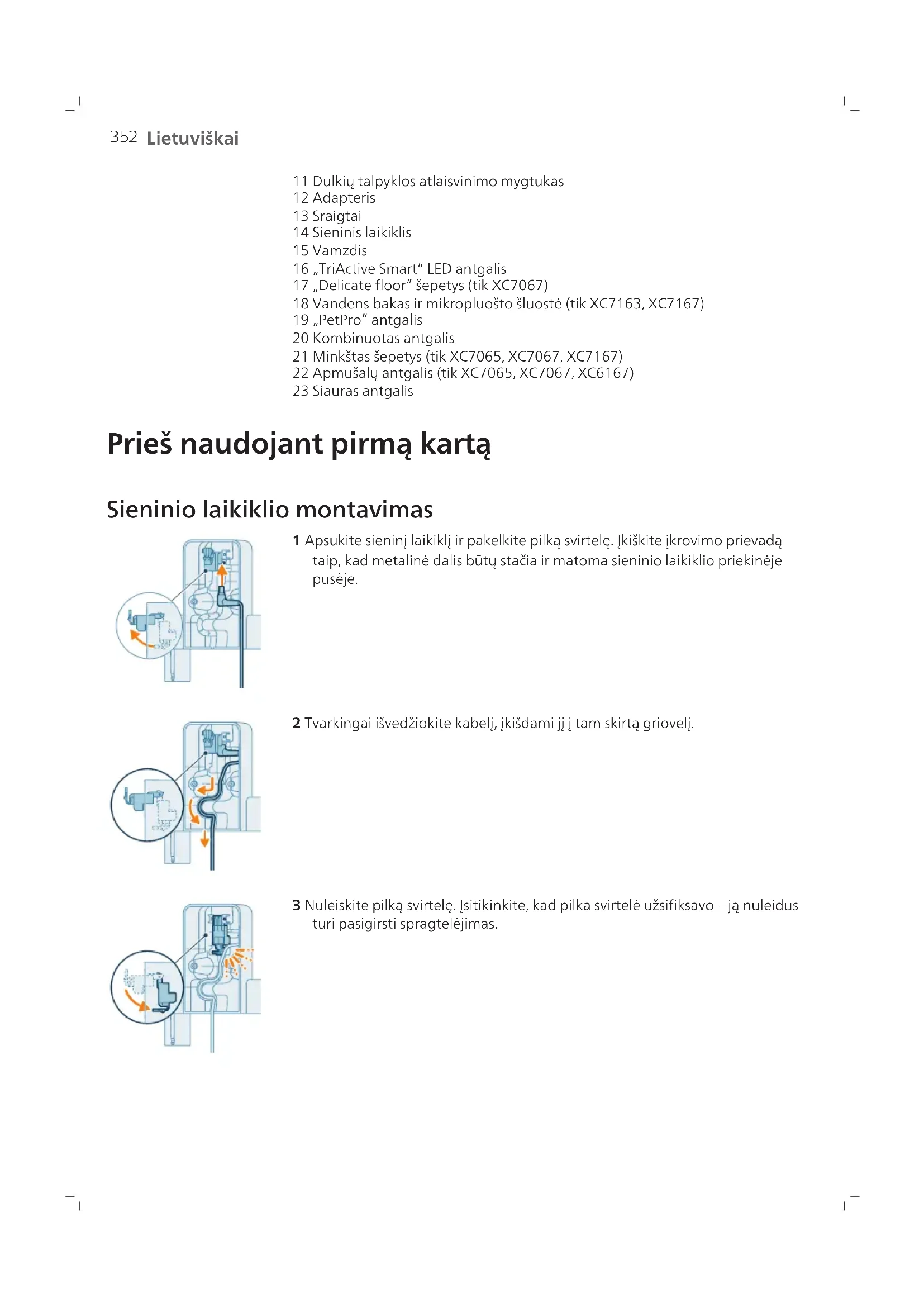 Lietuviškai Lietuviškai Turinys Įvadas ____________________________________________________________________________________ 351 Bendrasis aprašymas ______________________________________________________________________ 351 Prieš naudojant pirmą kartą________________________________________________________________ 352 Sieninio laikiklio montavimas_____________________________________________________________ 352 Priedų laikymas ant sieninio laikiklio_______________________________________________________ 353 Paruošimas naudoti _______________________________________________________________________ 354 Prietaiso naudojimas ______________________________________________________________________ 355 Prietaiso surinkimas _____________________________________________________________________ 355 Kietų ir minkštų grindų siurbimas _________________________________________________________ 355 Kietų grindų siurbimas jas plaunant _______________________________________________________ 356 Universalus panaudojimas ir priedai _______________________________________________________ 359 Pritaikymas poreikiams ir papildoma informacija____________________________________________ 362 Techninė priežiūra po naudojimo___________________________________________________________ 365 Dažna techninė priežiūra po kiekvieno valymo ciklo _________________________________________ 365 Periodinė techninė priežiūra _____________________________________________________________ 367 Pakeitimas________________________________________________________________________________ 376 Naudotojo sąsajos signalai ir jų reikšmės____________________________________________________ 377 Trikčių diagnostika ir šalinimas_____________________________________________________________ 379 Sausas valymas _________________________________________________________________________ 379 Šlapias valymas _________________________________________________________________________ 383 Įvadas Ačiū, kad pirkote šį „Philips“ gaminį! Norėdami pasinaudoti mūsų siūlomu palaikymu, užregistruokite savo produktą interneto svetainėje www.philips.com/mycordlessvacuum-7000s. Bendrasis aprašymas 1 Skaitmeninis indikatoriaus ekranas a Žiedinis akumuliatoriaus įkrovos lygio indikatorius b Akumuliatoriaus įkrovos lygis procentais c Pasirinktas galios lygis d 'Grindų tipo atpažinimo funkcijos aktyvavimo' piktograma e Filtro valymo priminimo piktograma 2 Meniu/Patvirtinimo mygtukas 3 „+“ mygtukas 4 „–“ mygtukas 5 Įjungimo ir išjungimo mygtukas 6 Rankinis įtaisas 7 Dulkių talpykla 8 Akumuliatorius 9 Pakaitinis filtras 10 Lengvo ištuštinimo mygtukas352 Lietuviškai 11 Dulkių talpyklos atlaisvinimo mygtukas 12 Adapteris 13 Sraigtai 14 Sieninis laikiklis 15 Vamzdis 16 „TriActive Smart“ LED antgalis 17 „Delicate floor” šepetys (tik XC7067) 18 Vandens bakas ir mikropluošto šluostė (tik XC7163, XC7167) 19 „PetPro” antgalis 20 Kombinuotas antgalis 21 Minkštas šepetys (tik XC7065, XC7067, XC7167) 22 Apmušalų antgalis (tik XC7065, XC7067, XC6167) 23 Siauras antgalis Prieš naudojant pirmą kartą Sieninio laikiklio montavimas 1 Apsukite sieninį laikiklį ir pakelkite pilką svirtelę. Įkiškite įkrovimo prievadą taip, kad metalinė dalis būtų stačia ir matoma sieninio laikiklio priekinėje pusėje. 2 Tvarkingai išvedžiokite kabelį, įkišdami jį į tam skirtą griovelį. 3 Nuleiskite pilką svirtelę. Įsitikinkite, kad pilka svirtelė užsifiksavo – ją nuleidus turi pasigirsti spragtelėjimas.353 Lietuviškai 110 ± 2 cm 4 Saugiai pritvirtinkite sieninį laikiklį norimoje vietoje ant sienos, užtikrindami, kad tvirtinimo sraigtų skylės būtų maždaug 110 cm atstumu nuo grindų. Atsargiai! Gręždami sienoje skyles sieniniam laikikliui pritvirtinti būkite atsargūs, kad išvengtumėte elektros smūgio pavojaus. Pastaba. Patikrinkite, ar sieninio laikiklio padėtis leidžia prietaisui kabėti ant sienos taip, kad antgalis nesiliestų prie grindų. 5 Kai nustatysite tinkamiausią prietaiso laikymo ir įkrovimo padėtį bei aukštį, tvirtai priveržkite sraigtus, kad pritvirtintumėte sieninį laikiklį. Priedų laikymas ant sieninio laikiklio Visus priedus, išskyrus „PetPro“ antgalio ir apmušalų įrankio derinį, galima laikyti ant sieninio laikiklio. Pastaba. Būkite atsargūs, kad „PetPro“ antgalis ir apmušalų įrankis negalėtų būti laikomi ant sieninio laikiklio kartu.354 Lietuviškai Paruošimas naudoti Prietaisas turi ličio jonų akumuliatorių. Visiškai įkrauti tuščią akumuliatorių trunka apie 6 valandas. 1 Pritvirtinkite akumuliatorių prie pagrindinio prietaiso korpuso, užtikrindami, kad jis užsifiksavo – teisingai pritvirtinus turi pasigirsti spragtelėjimas.