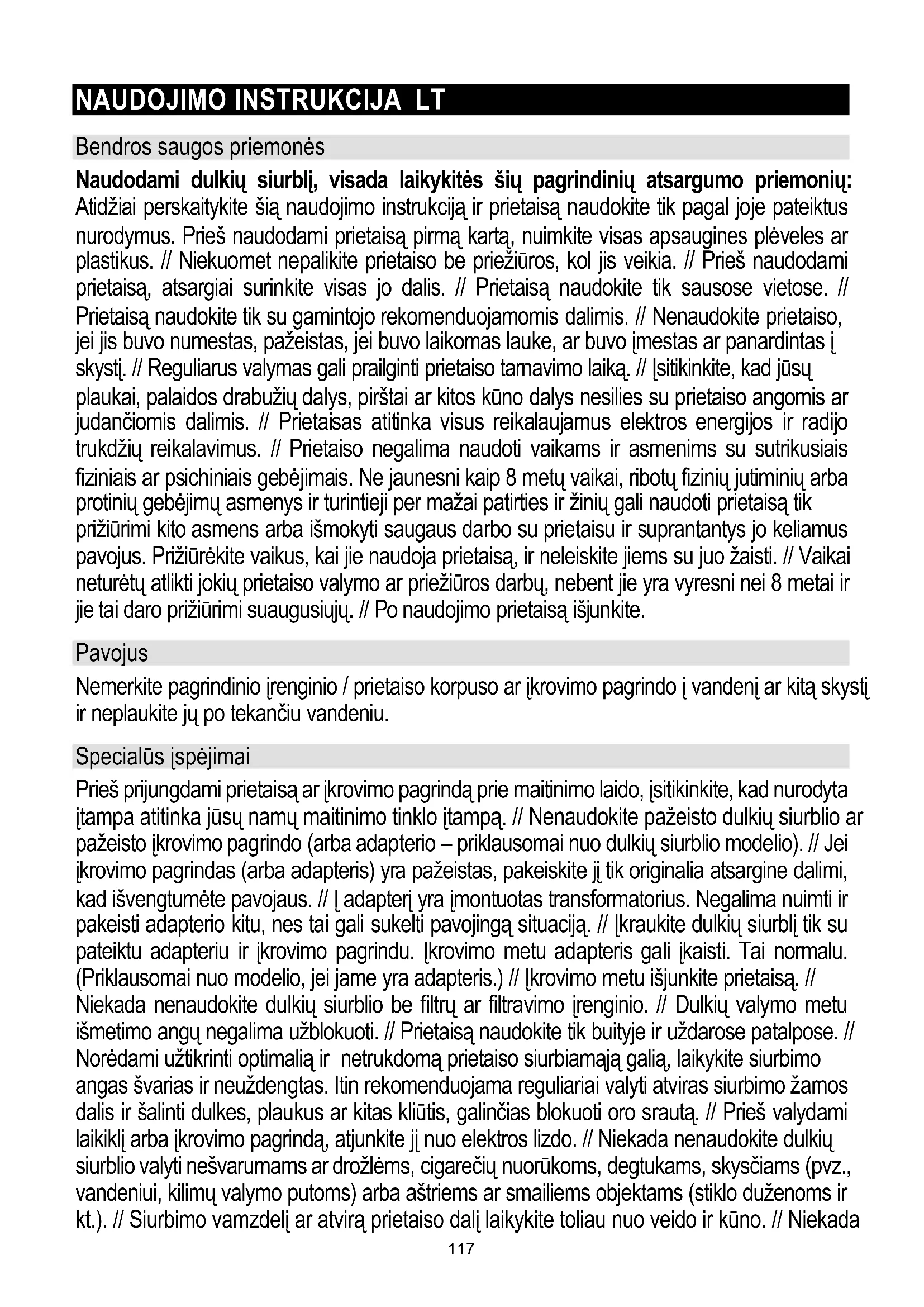 Bendros saugos priemonės Naudodami dulkių siurblį, visada laikykitės šių pagrindinių atsargumo priemonių: Atidžiai perskaitykite šią naudojimo instrukciją ir prietaisą naudokite tik pagal joje pateiktus nurodymus. Prieš naudodami prietaisą pirmą kartą, nuimkite visas apsaugines plėveles ar plastikus. // Niekuomet nepalikite prietaiso be priežiūros, kol jis veikia. // Prieš naudodami prietaisą, atsargiai surinkite visas jo dalis. // Prietaisą naudokite tik sausose vietose. // Prietaisą naudokite tik su gamintojo rekomenduojamomis dalimis. // Nenaudokite prietaiso, jei jis buvo numestas, pažeistas, jei buvo laikomas lauke, ar buvo įmestas ar panardintas į skystį. // Reguliarus valymas gali prailginti prietaiso tarnavimo laiką. // Įsitikinkite, kad jūsų plaukai, palaidos drabužių dalys, pirštai ar kitos kūno dalys nesilies su prietaiso angomis ar judančiomis dalimis. // Prietaisas atitinka visus reikalaujamus elektros energijos ir radijo trukdžių reikalavimus. // Prietaiso negalima naudoti vaikams ir asmenims su sutrikusiais fiziniais ar psichiniais gebėjimais. Ne jaunesni kaip 8 metų vaikai, ribotų fizinių jutiminių arba protinių gebėjimų asmenys ir turintieji per mažai patirties ir žinių gali naudoti prietaisą tik prižiūrimi kito asmens arba išmokyti saugaus darbo su prietaisu ir suprantantys jo keliamus pavojus. Prižiūrėkite vaikus, kai jie naudoja prietaisą, ir neleiskite jiems su juo žaisti. // Vaikai neturėtų atlikti jokių prietaiso valymo ar priežiūros darbų, nebent jie yra vyresni nei 8 metai ir jie tai daro prižiūrimi suaugusiųjų. // Po naudojimo prietaisą išjunkite. Pavojus Nemerkite pagrindinio įrenginio / prietaiso korpuso ar įkrovimo pagrindo į vandenį ar kitą skystį ir neplaukite jų po tekančiu vandeniu. Specialūs įspėjimai Prieš prijungdami prietaisą ar įkrovimo pagrindą prie maitinimo laido, įsitikinkite, kad nurodyta įtampa atitinka jūsų namų maitinimo tinklo įtampą. // Nenaudokite pažeisto dulkių siurblio ar pažeisto įkrovimo pagrindo (arba adapterio – priklausomai nuo dulkių siurblio modelio). // Jei įkrovimo pagrindas (arba adapteris) yra pažeistas, pakeiskite jį tik originalia atsargine dalimi, kad išvengtumėte pavojaus. // Į adapterį yra įmontuotas transformatorius. Negalima nuimti ir pakeisti adapterio kitu, nes tai gali sukelti pavojingą situaciją. // Įkraukite dulkių siurblį tik su pateiktu adapteriu ir įkrovimo pagrindu. Įkrovimo metu adapteris gali įkaisti. Tai normalu. (Priklausomai nuo modelio, jei jame yra adapteris.) // Įkrovimo metu išjunkite prietaisą. // Niekada nenaudokite dulkių siurblio be filtrų ar filtravimo įrenginio. // Dulkių valymo metu išmetimo angų negalima užblokuoti. // Prietaisą naudokite tik buityje ir uždarose patalpose. // Norėdami užtikrinti optimalią ir netrukdomą prietaiso siurbiamąją galią, laikykite siurbimo angas švarias ir neuždengtas. Itin rekomenduojama reguliariai valyti atviras siurbimo žarnos dalis ir šalinti dulkes, plaukus ar kitas kliūtis, galinčias blokuoti oro srautą. // Prieš valydami laikiklį arba įkrovimo pagrindą, atjunkite jį nuo elektros lizdo. // Niekada nenaudokite dulkių siurblio valyti nešvarumams ar drožlėms, cigarečių nuorūkoms, degtukams, skysčiams (pvz., vandeniui, kilimų valymo putoms) arba aštriems ar smailiems objektams (stiklo duženoms ir kt.). // Siurbimo vamzdelį ar atvirą prietaiso dalį laikykite toliau nuo veido ir kūno. // Niekada 117nenaudokite prietaiso siurbti statybinėms medžiagoms (pvz., smulkiam smėliui, kalkėms, cemento milteliams, dažų dulkėms ir kt.). Taip galite sugadinti prietaisą. Problemos ir sprendimas Problema Galima priežastis Sprendimas Neveikia. Baterija išseko. Dulkių siurblys neteisingai surinktas. Įkrovimas. Tinkamai surinkite dulkių siurblį. Sumažėjo siurbimo galia. Pilnas dulkių puodelis. Užblokuotas filtras. Užblokuotas oro įleidimo tunelis arba elektrinio šepečio volelis. Išpilkite dulkes. Išvalykite arba pakeiskite filtrą. Išvalykite elektros šepetį. VC neįsikrauna. Įkroviklis neprijungtas prie lizdo. Įkroviklio jungtis neprijungta prie pagrindo korpuso angos. Dulkių siurblys neprijungtas prie korpuso. Prijunkite įkroviklį prie lizdo. Prijunkite įkroviklį su pagrindiniu dulkių siurblio korpusu. Surinkite dulkių siurblįant korpuso. Po įkrovimo galima naudoti labai trumpai. Nepakanka įkrovimo laiko. Baterija senka. Įkraukite pagal instrukcijas. Pakeiskite bateriją. Aplinka Pasibaigus eksploatacijos laikui, neišmeskite prietaiso su įprastomis buitinėmis atliekomis. Nuneškite jį į oficialų surinkimo punktą perdirbimui. Tokiu būdu galite padėti saugoti aplinką. Šis prietaisas atitinka Europos EU/2012/19, Elektros ir elektroninės įrangos atliekų direktyvą (EEĮ atliekų direktyvą). Šios gairės galioja visoje Europoje grąžinant ir perdirbant naudotą elektros ir elektroninę įrangą ir jos atliekas. Garantinis aptarnavimas ir priežiūra Jei reikia informacijos ar turite klausimų, prašome kreiptis į „Gorenje“ klientų aptarnavimo centrą savo šalyje (telefono numerį rasite visame pasaulyje galiojančios garantijos lankstinuke). Jei jūsų šalyje nėra klientų aptarnavimo centro, kreipkitės į vietinį „Gorenje“ pardavėją arba į „Gorenje“ buitinės technikos techninio aptarnavimo skyrių. Pastaba: Dulkių siurblio baterijos garantija yra 12 mėnesiai. Tik buitiniam naudojimui. 118Kad būtų lengviau transportuoti, kai kurios prietaiso dalys pakuojamos atskirai ir saugiai dedamos į pagrindinę pakuotę. // Prieš naudodami pirmą kartą, perskaitykite ir laikykitės surinkimo ir saugaus naudojimo instrukcijų. // Prietaisas skirtas sausam siurbimui buitinėje aplinkoje naudoti buityje. DALYS
