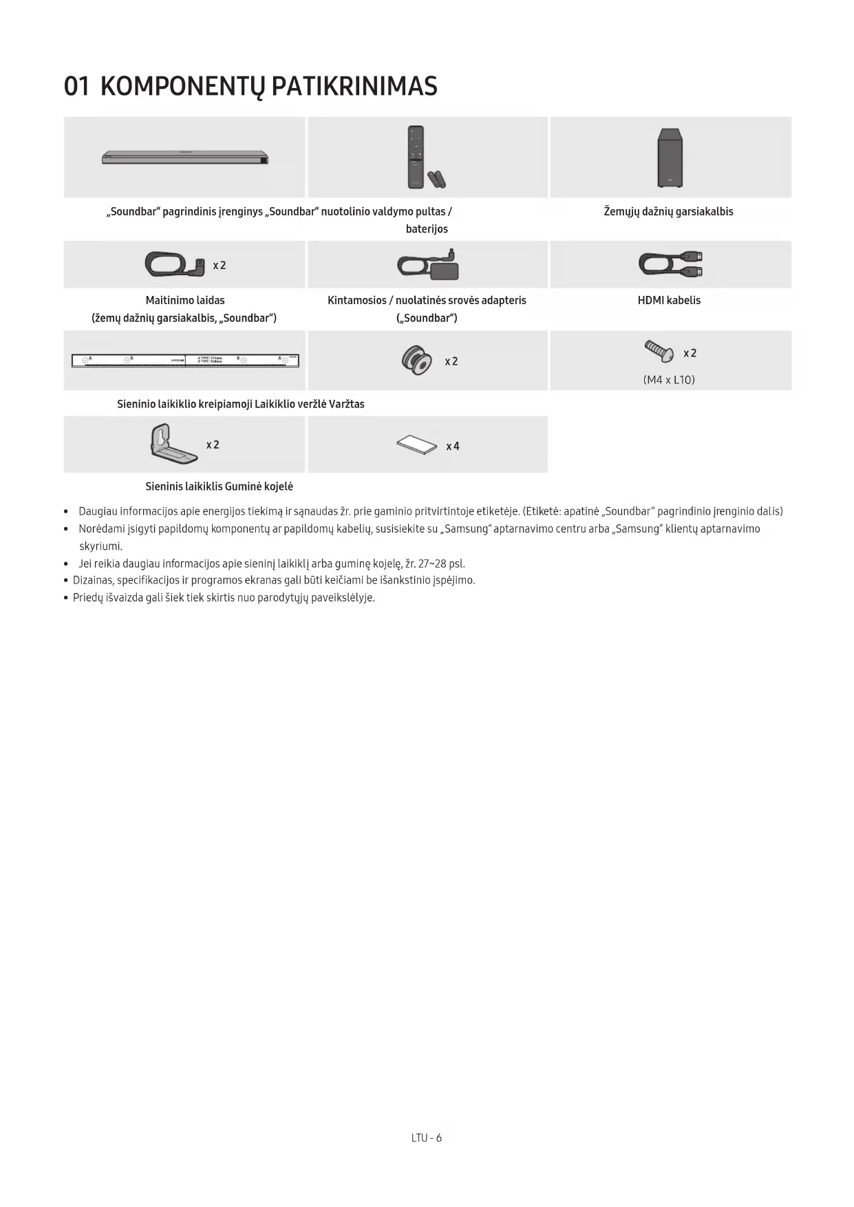 - 14 Trikčių šalinimas 30 15 Licencija 31 16 Atviro šaltinio įspėjimas dėl licencijos 31 17 Svarbios pastabos apie paslaugą 31 18 Specikacijos ir vadovas 32 Specikacijos LTU - 6 01 KOMPONENTŲ PATIKRINIMAS VOL WOOFER SOUNDBAR SOUND MODE PAIR „Soundbar“ pagrindinis įrenginys „Soundbar“ nuotolinio valdymo pultas / baterijos Žemųjų dažnių garsiakalbis x 2 Maitinimo laidas (žemų dažnių garsiakalbis, „Soundbar“) Kintamosios / nuolatinės srovės adapteris („Soundbar“) HDMI kabelis x 2 x 2 (M4 x L10) Sieninio laikiklio kreipiamoji Laikiklio veržlė Varžtas x 2 x 4 Sieninis laikiklis Guminė kojelė p. 32