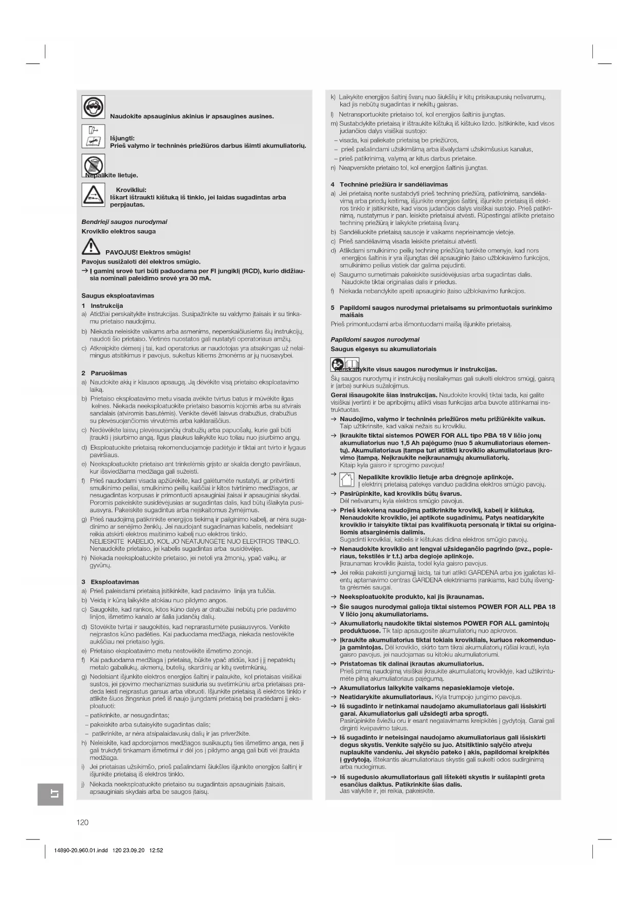 Nepalikite kroviklio lietuje arba drėgnoje aplinkoje. Į elektrinį prietaisą patekęs vanduo padidina elektros smūgio pavojų. v Pasirūpinkite, kad kroviklis būtų švarus. Dėl nešvarumų kyla elektros smūgio pavojus. v Prieš kiekvieną naudojimą patikrinkite kroviklį, kabelį ir kištuką. Nenaudokite kroviklio, jei aptikote sugadinimų. Patys neatidarykite kroviklio ir taisykite tiktai pas kvalifikuotą personalą ir tiktai su origina- liomis atsarginėmis dalimis. Sugadinti krovikliai, kabelis ir kištukas didina elektros smūgio pavojų. v Nenaudokite kroviklio ant lengvai užsidegančio pagrindo (pvz., popie- riaus, tekstilės ir t.t.) arba degioje aplinkoje. Įkraunamas kroviklis įkaista, todėl kyla gaisro pavojus. v Jei reikia pakeisti jungiamąjį laidą, tai turi atlikti GARDENA arba jos įgaliotas kli- entų aptarnavimo centras GARDENA elektriniams įrankiams, kad būtų išveng- ta grėsmės saugai. v Neeksploatuokite produkto, kai jis įkraunamas. v Šie saugos nurodymai galioja tiktai sistemos POWER FOR ALL PBA 18 V ličio jonų akumuliatoriams. v Akumuliatorių naudokite tiktai sistemos POWER FOR ALL gamintojų produktuose. Tik taip apsaugosite akumuliatorių nuo apkrovos. v Įkraukite akumuliatorius tiktai tokiais krovikliais, kuriuos rekomenduo- ja gamintojas. Dėl kroviklio, skirto tam tikrai akumuliatorių rūšiai krauti, kyla gaisro pavojus, jei naudojamas su kitokiu akumuliatoriumi. v Pristatomas tik dalinai įkrautas akumuliatorius. Prieš pirmą naudojimą visiškai įkraukite akumuliatorių kroviklyje, kad užtikrintu- mėte pilną akumuliatoriaus pajėgumą. v Akumuliatorius laikykite vaikams nepasiekiamoje vietoje. v Neatidarykite akumuliatoriaus. Kyla trumpojo jungimo pavojus. v Iš sugadinto ir netinkamai naudojamo akumuliatoriaus gali išsiskirti garai. Akumuliatorius gali užsidegti arba sprogti. Pasirūpinkite šviežiu oru ir esant negalavimams kreipkitės į gydytoją. Garai gali dirginti kvėpavimo takus. v Iš sugadinto ir neteisingai naudojamo akumuliatoriaus gali išsiskirti degus skystis. Venkite sąlyčio su juo. Atsitiktinio sąlyčio atveju nuplaukite vandeniu. Jei skysčio pateko į akis, papildomai kreipkitės įgydytoją. Ištekantis akumuliatoriaus skystis gali sukelti odos sudirginimą arba nudegimus. v Iš sugedusio akumuliatoriaus gali ištekėti skystis ir sušlapinti greta esančius daiktus. Patikrinkite šias dalis. Jas valykite ir, jei reikia, pakeiskite. 14890-20.960.01.indd 120 23.09.20 12:52LT