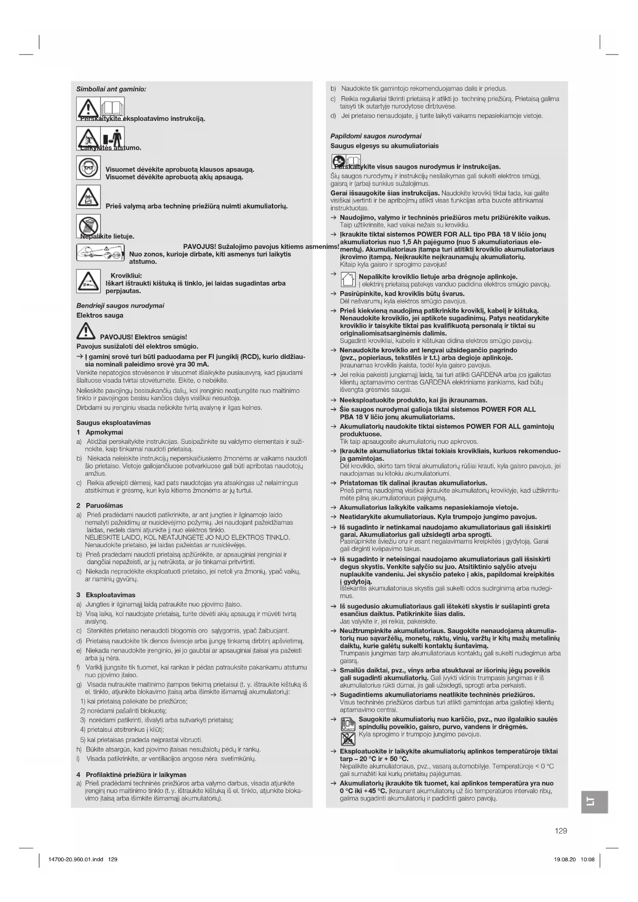 Nepalikite kroviklio lietuje arba drėgnoje aplinkoje. Į elektrinį prietaisą patekęs vanduo padidina elektros smūgio pavojų. v Pasirūpinkite, kad kroviklis būtų švarus. Dėl nešvarumų kyla elektros smūgio pavojus. v Prieš kiekvieną naudojimą patikrinkite kroviklį, kabelį ir kištuką. Nenaudokite kroviklio, jei aptikote sugadinimų. Patys neatidarykite kroviklio ir taisykite tiktai pas kvalifikuotą personalą ir tiktai su originaliomis atsarginėmis dalimis. Sugadinti krovikliai, kabelis ir kištukas didina elektros smūgio pavojų. v Nenaudokite kroviklio ant lengvai užsidegančio pagrindo (pvz., popieriaus, tekstilės ir t.t.) arba degioje aplinkoje. Įkraunamas kroviklis įkaista, todėl kyla gaisro pavojus. v Jei reikia pakeisti jungiamąjį laidą, tai turi atlikti GARDENA arba jos įgaliotas klientų aptarnavimo centras GARDENA elektriniams įrankiams, kad būtų išvengta grėsmės saugai. v Neeksploatuokite produkto, kai jis įkraunamas. v Šie saugos nurodymai galioja tiktai sistemos POWER FOR ALL PBA 18V ličio jonų akumuliatoriams. v Akumuliatorių naudokite tiktai sistemos POWER FOR ALL gamintojų produktuose. Tik taip apsaugosite akumuliatorių nuo apkrovos. v Įkraukite akumuliatorius tiktai tokiais krovikliais, kuriuos rekomenduo- ja gamintojas. Dėl kroviklio, skirto tam tikrai akumuliatorių rūšiai krauti, kyla gaisro pavojus, jei naudojamas su kitokiu akumuliatoriumi. v Pristatomas tik dalinai įkrautas akumuliatorius. Prieš pirmą naudojimą visiškai įkraukite akumuliatorių kroviklyje, kad užtikrintu- mėte pilną akumuliatoriaus pajėgumą. v Akumuliatorius laikykite vaikams nepasiekiamoje vietoje. v Neatidarykite akumuliatoriaus. Kyla trumpojo jungimo pavojus. v Iš sugadinto ir netinkamai naudojamo akumuliatoriaus gali išsiskirti garai. Akumuliatorius gali užsidegti arba sprogti. Pasirūpinkite šviežiu oru ir esant negalavimams kreipkitės į gydytoją. Garai gali dirginti kvėpavimo takus. v Iš sugadinto ir neteisingai naudojamo akumuliatoriaus gali išsiskirti degus skystis. Venkite sąlyčio su juo. Atsitiktinio sąlyčio atveju nuplaukite vandeniu. Jei skysčio pateko į akis, papildomai kreipkitės įgydytoją. Ištekantis akumuliatoriaus skystis gali sukelti odos sudirginimą arba nudegi- mus. v Iš sugedusio akumuliatoriaus gali ištekėti skystis ir sušlapinti greta esančius daiktus. Patikrinkite šias dalis. Jas valykite ir, jei reikia, pakeiskite. v Neužtrumpinkite akumuliatoriaus. Saugokite nenaudojamą akumulia- torių nuo sąvaržėlių, monetų, raktų, vinių, varžtų ir kitų mažų metalinių daiktų, kurie galėtų sukelti kontaktų šuntavimą. Trumpasis jungimas tarp akumuliatoriaus kontaktų gali sukelti nudegimus arba gaisrą. v Smailūs daiktai, pvz., vinys arba atsuktuvai ar išorinių jėgų poveikis gali sugadinti akumuliatorių. Gali įvykti vidinis trumpasis jungimas ir iš akumuliatorius rūkti dūmai, jis gali užsidegti, sprogti arba perkaisti. v Sugadintiems akumuliatoriams neatlikite techninės priežiūros. Visus techninės priežiūros darbus turi atlikti gamintojas arba įgaliotieji klientų aptarnavimo centrai.