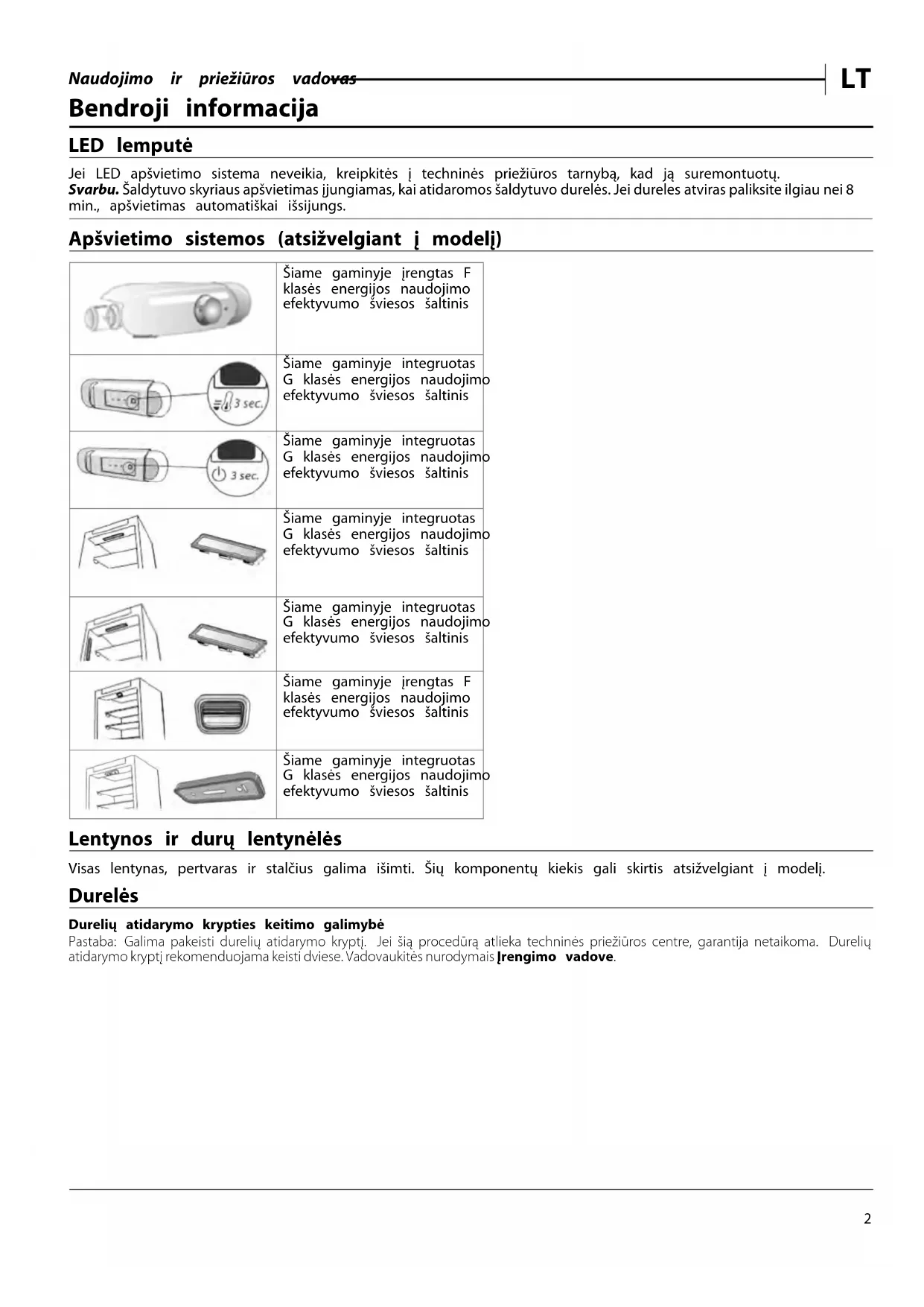 Bendroji informacija LED lemputė Jei LED apšvietimo sistema neveikia, kreipkitės į techninės priežiūros tarnybą, kad ją suremontuotų. Svarbu. Šaldytuvo skyriaus apšvietimas įjungiamas, kai atidaromos šaldytuvo durelės. Jei dureles atviras paliksite ilgiau nei 8 min., apšvietimas automatiškai išsijungs. Apšvietimo sistemos (atsižvelgiant į modelį) Šiame gaminyje įrengtas F klasės energijos naudojimo efektyvumo šviesos šaltinis Šiame gaminyje integruotas G klasės energijos naudojimo efektyvumo šviesos šaltinis Šiame gaminyje integruotas G klasės energijos naudojimo efektyvumo šviesos šaltinis Šiame gaminyje integruotas G klasės energijos naudojimo efektyvumo šviesos šaltinis Šiame gaminyje integruotas G klasės energijos naudojimo efektyvumo šviesos šaltinis Šiame gaminyje įrengtas F klasės energijos naudojimo efektyvumo šviesos šaltinis Šiame gaminyje integruotas G klasės energijos naudojimo efektyvumo šviesos šaltinis Lentynos ir durų lentynėlės Visas lentynas, pertvaras ir stalčius galima išimti. Šių komponentų kiekis gali skirtis atsižvelgiant į modelį. Durelės Durelių atidarymo krypties keitimo galimybė Pastaba: Galima pakeisti durelių atidarymo kryptį. Jei šią procedūrą atlieka techninės priežiūros centre, garantija netaikoma. Durelių atidarymo kryptį rekomenduojama keisti dviese. Vadovaukitės nurodymais Įrengimo vadove.Naudojimo ir priežiūros vadovas
