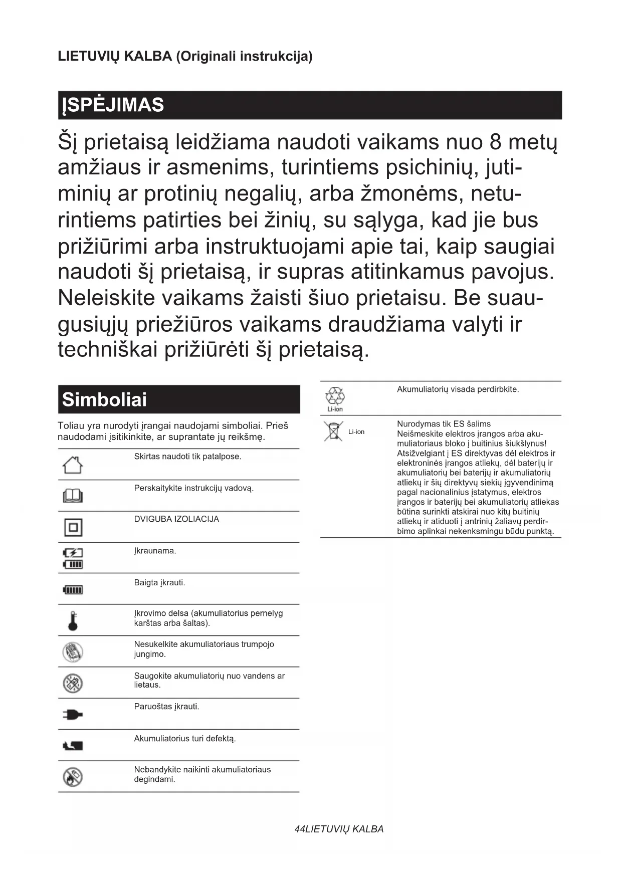 - Akumulatora kasetne ilgstoši atradusies aukstā gaisā. Lādēšana tiks sākta brīdī, kad akumulatora kasetne sasniegs lādēšanai piemērotu temperatūru. PIEZĪME: Ja lādēšanas gaismas pamīšus mirgo sarkanā un zaļā krāsā, lādēšana nav iespējama. Lādētāja vai akumulatora kasetnes spailes netīras vai akumulatora kasetne ir nolietojusies vai bojāta.44 LIETUVIŲ KALBA LIETUVIŲ KALBA (Originali instrukcija) ĮSPĖJIMAS Šį prietaisą leidžiama naudoti vaikams nuo 8 metų amžiaus ir asmenims, turintiems psichinių, juti- minių ar protinių negalių, arba žmonėms, netu- rintiems patirties bei žinių, su sąlyga, kad jie bus prižiūrimi arba instruktuojami apie tai, kaip saugiai naudoti šį prietaisą, ir supras atitinkamus pavojus. Neleiskite vaikams žaisti šiuo prietaisu. Be suau- gusiųjų priežiūros vaikams draudžiama valyti ir techniškai prižiūrėti šį prietaisą. Simboliai Toliau yra nurodyti įrangai naudojami simboliai. Prieš naudodami įsitikinkite, ar suprantate jų reikšmę. Skirtas naudoti tik patalpose. Perskaitykite instrukcijų vadovą. DVIGUBA IZOLIACIJA Įkraunama. Baigta įkrauti. Įkrovimo delsa (akumuliatorius pernelyg karštas arba šaltas). Nesukelkite akumuliatoriaus trumpojo jungimo. Saugokite akumuliatorių nuo vandens ar lietaus. Paruoštas įkrauti. Akumuliatorius turi defektą. Nebandykite naikinti akumuliatoriaus degindami. Akumuliatorių visada perdirbkite. Li-ion Nurodymas tik ES šalims Neišmeskite elektros įrangos arba aku- muliatoriaus bloko į buitinius šiukšlynus! Atsižvelgiant į ES direktyvas dėl elektros ir elektroninės įrangos atliekų, dėl baterijų ir akumuliatorių bei baterijų ir akumuliatorių atliekų ir šių direktyvų siekių įgyvendinimą pagal nacionalinius įstatymus, elektros įrangos ir baterijų bei akumuliatorių atliekas būtina surinkti atskirai nuo kitų buitinių atliekų ir atiduoti į antrinių žaliavų perdir- bimo aplinkai nekenksmingu būdu punktą.45 LIETUVIŲ KALBA PERSPĖJIMAS