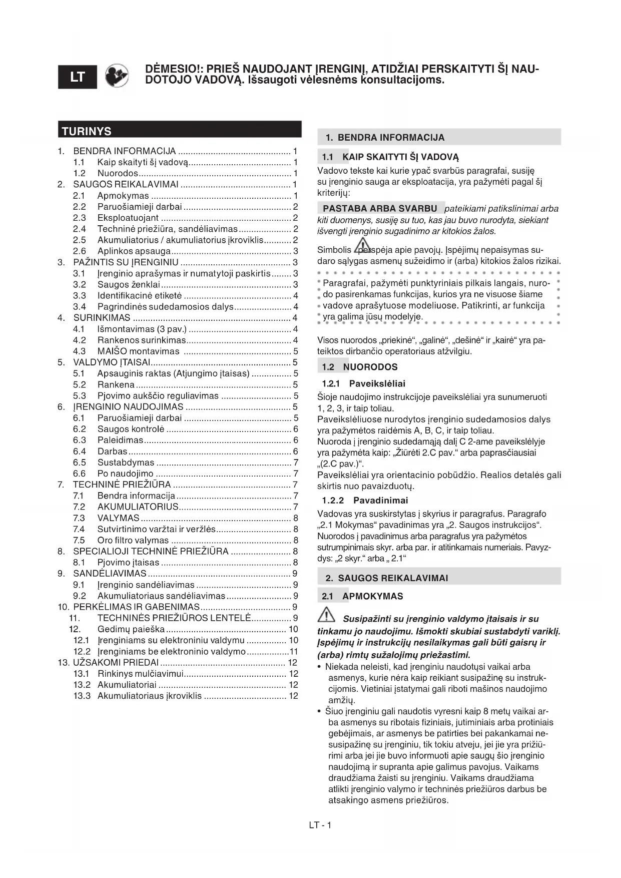 VIKLIS SVARBU Šie saugos reikalavimai papildo saugos nurodymus, aprašytus atitinkamoje kartu su įrenginiuLT - 3 pristatomoje akumuliatoriaus ir akumuliatoriaus įkroviklio instrukcijų knygelėje.