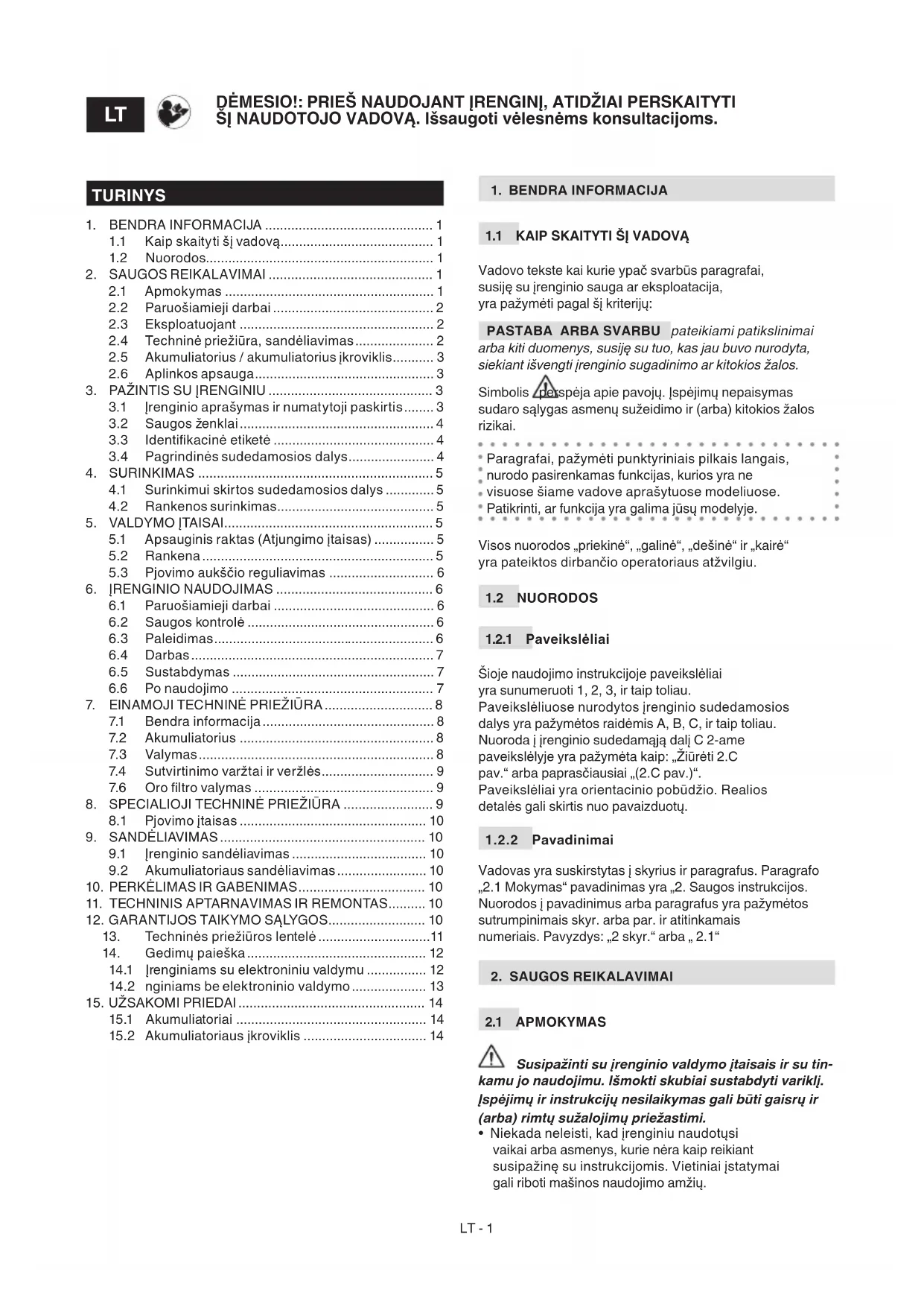 Intervencija Periodiškumas Pastabos ĮRENGINYS Visų tvirtinimo elementų patikrinimas Prieš kiekvieną naudojimą 7.4 par. Saugos kontrolė / Valdymo įtaisų patikrinimas Prieš kiekvieną naudojimą par. 6.2 Pjovimo įtaiso patikrinimas Prieš kiekvieną naudojimą 6.2.1 par. Akumuliatoriaus įkrovimo būsenos patikrinimas Prieš kiekvieną naudojimą * Akumuliatoriaus įkrovimas Po kiekvieno naudojimo par. 7.2.2 * Bendras valymas ir kontrolė Po kiekvieno naudojimo 7.3 par. Galimų įrenginio pažeidimų patikrinimas. Jei reikia, kreiptis į įgaliotąjį techninės priežiūros centrą. Po kiekvieno naudojimo - Oro ltro valymas Vieną kartą per mėnesį 7.6 par. Pavarų dėžės valymas 1-2 kartus per metus 7.5 par. Pjovimo įtaiso pakeitimas - 8.1 par.*** Eigos reguliavimas *** **