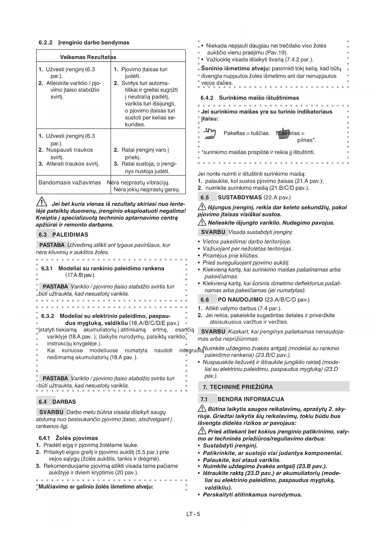 Veiksmas Periodiškumas Pastabos ĮRENGINYS Visų tvirtinimo elementų patikrinimas saugos kontrolė / valdymo įtaisų patikra; galinio išmetimo / šoninio išmetimo apsaugų patikra; surinkimo maišo, šoninio išmetimo deektoriaus patikra; pjovimo įtaiso patikra. Prieš naudojant 6.2.2 par. Bendras valymas ir kontrolė; galimų įrenginio pažeidimų patikrinimas. Jei reikia, kreiptis į įgaliotąjį techninio aptarnavimo centrą. Po kiekvieno naudojimo