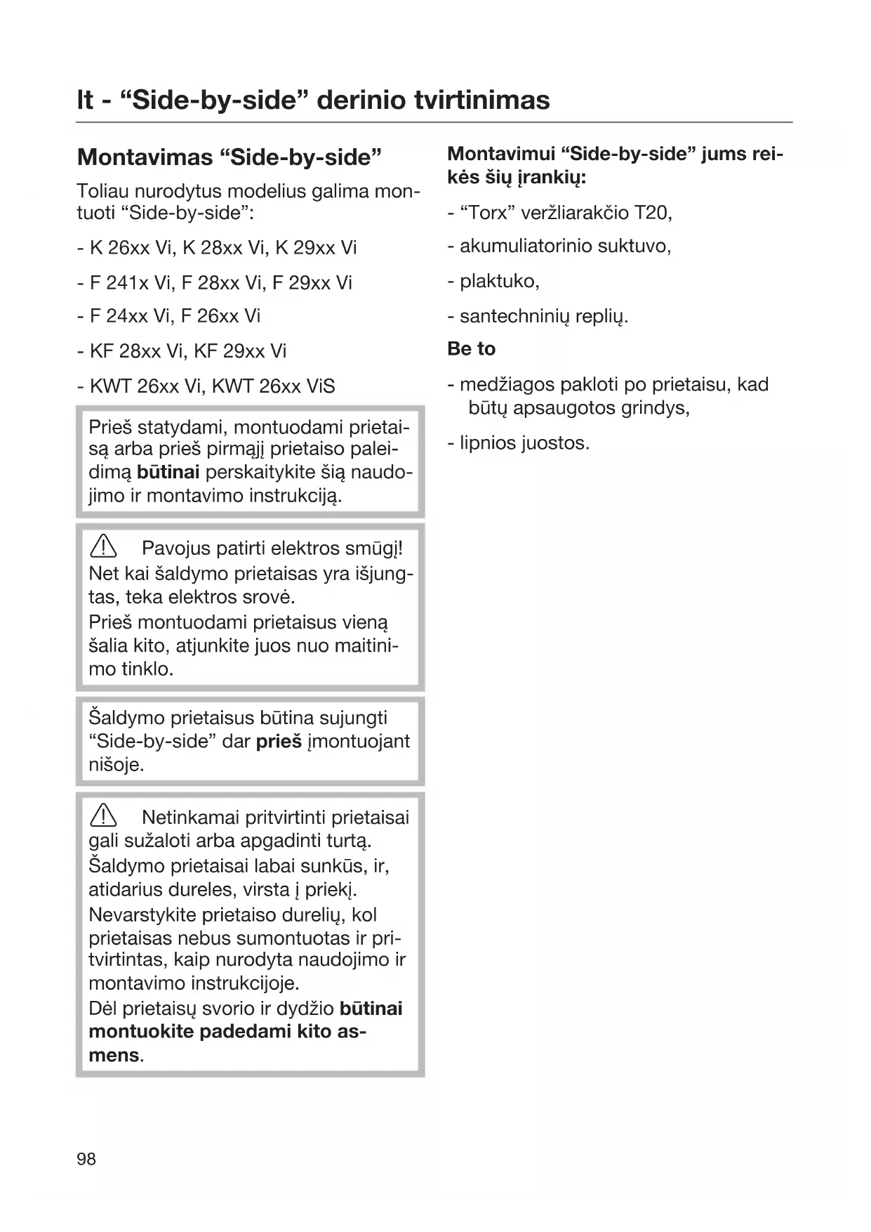 Montavimas “Side-by-side” Toliau nurodytus modelius galima mon- tuoti “Side-by-side”: - K26xxVi, K28xxVi, K29xxVi - F241xVi, F28xxVi, F29xxVi - F24xxVi, F26xxVi - KF28xxVi, KF29xxVi - KWT26xxVi, KWT26xxViS Prieš statydami, montuodami prietai- są arba prieš pirmąjį prietaiso palei- dimą būtinai perskaitykite šią naudo- jimo ir montavimo instrukciją. Pavojus patirti elektros smūgį! Net kai šaldymo prietaisas yra išjung- tas, teka elektros srovė. Prieš montuodami prietaisus vieną šalia kito, atjunkite juos nuo maitini- mo tinklo. Šaldymo prietaisus būtina sujungti “Side-by-side” dar prieš įmontuojant nišoje. Netinkamai pritvirtinti prietaisai gali sužaloti arba apgadinti turtą. Šaldymo prietaisai labai sunkūs, ir, atidarius dureles, virsta į priekį. Nevarstykite prietaiso durelių, kol prietaisas nebus sumontuotas ir pri- tvirtintas, kaip nurodyta naudojimo ir montavimo instrukcijoje. Dėl prietaisų svorio ir dydžio būtinai montuokite padedami kito as- mens. Montavimui “Side-by-side” jums rei- kės šių įrankių: - “Torx” veržliarakčio T20, - akumuliatorinio suktuvo, - plaktuko, - santechninių replių. Be to - medžiagos pakloti po prietaisu, kad būtų apsaugotos grindys, - lipnios juostos.lt - “Side-by-side” derinio tvirtinimas