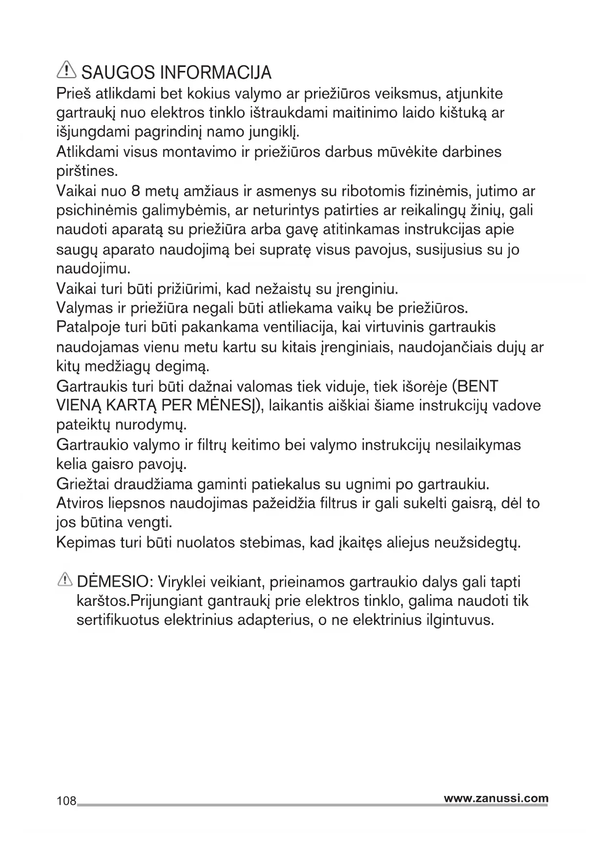 1 ON/OFF gaismas 2 OFF dzinēji 3 Minimālā iesūkšanas jauda 4 Vidējā iesūkšanas jauda 5 Maksimālā iesūkšanas jauda Izmantot augstāku ātrumu īpašas virtuves dūmu koncentrācijas gadījumā. Iesakām ieslēgt iesūkšanu 5 minūtes pirms ēdiena gatavošanas sākšanas un neslēgt to ārā vēl 15 minūtes pēc ēdiena gatavošanas pabeigšanas. APGAISMOJUMS Atvienot ierīci no elektriskās sistēmas. Uzmanību! Pirms pieskarties spuldzēm, pārliecināties, ka tās ir aukstas. Nomainiet bojāto spuldzi. Izmantojiet tikai LED spuldzes ar maks. 3W-E14. Papildu informāciju skatiet pievienotajā lapā “ILCOS D” (burtu un ciparu pozīcija “1d”).108 www.zanussi.com SAUGOS INFORMACIJA Prieš atlikdami bet kokius valymo ar priežiūros veiksmus, atjunkite gartraukį nuo elektros tinklo ištraukdami maitinimo laido kištuką ar išjungdami pagrindinį namo jungiklį. Atlikdami visus montavimo ir priežiūros darbus mūvėkite darbines pirštines. Vaikai nuo 8 metų amžiaus ir asmenys su ribotomis fizinėmis, jutimo ar psichinėmis galimybėmis, ar neturintys patirties ar reikalingų žinių, gali naudoti aparatą su priežiūra arba gavę atitinkamas instrukcijas apie saugų aparato naudojimą bei supratę visus pavojus, susijusius su jo naudojimu. Vaikai turi būti prižiūrimi, kad nežaistų su įrenginiu. Valymas ir priežiūra negali būti atliekama vaikų be priežiūros. Patalpoje turi būti pakankama ventiliacija, kai virtuvinis gartraukis naudojamas vienu metu kartu su kitais įrenginiais, naudojančiais dujų ar kitų medžiagų degimą. Gartraukis turi būti dažnai valomas tiek viduje, tiek išorėje (BENT VIENĄ KARTĄ PER MĖNESĮ), laikantis aiškiai šiame instrukcijų vadove pateiktų nurodymų. Gartraukio valymo ir filtrų keitimo bei valymo instrukcijų nesilaikymas kelia gaisro pavojų. Griežtai draudžiama gaminti patiekalus su ugnimi po gartraukiu. Atviros liepsnos naudojimas pažeidžia filtrus ir gali sukelti gaisrą, dėl to jos būtina vengti. Kepimas turi būti nuolatos stebimas, kad įkaitęs aliejus neužsidegtų. DĖMESIO: Viryklei veikiant, prieinamos gartraukio dalys gali tapti karštos.Prijungiant gantraukį prie elektros tinklo, galima naudoti tik sertifikuotus elektrinius adapterius, o ne elektrinius ilgintuvus.109 www.zanussi.com SAUGOS INSTRUKCIJOS Lempos keitimui naudokite tik šių instrukcijų vadove esančiame priežiūros skyriuje nurodytus lempų tipus. Dėmesio! Nejunkite įrenginio prie elektros tinklo, kol jis nėra visiškai sumontuotas. Griežtai laikykitės vietinės valdžios pateiktų taisyklių dėl išmetamų dūmų techninių matmenų ir saugumo. Įsiurbiamas oras negali būti išleidžiamas į vamzdyną naudojamą dūmų, susidariusių dėl dujų ar kitų medžiagų degimo, išmetimui. Nenaudokite ir nepalikite gartraukio tinkamai nesumontavę lempų, nes rizikuojate elektros nutrenkimu. Niekuomet nenaudokite gartraukio tinkamai nesumontavę grotelių! Gartraukis JOKIAIS BŪDAIS negali būti naudojamas, kaip atrama, nebent aiškiai nurodyta kitaip. Montavimui naudokite tik kartu su gaminiu gautus tvirtinimo varžtus, o jeigu jų negavote, naudokite tinkamo tipo varžtus. Naudokite tinkamo ilgio varžtus, kuris nurodytas Montavimo vadove. Iškilus dvejonėms, kreipkitės į įgaliotą aptarnavimo centrą ar panašų kvalifikuotą personalą. DĖMESIO! Netinkamai sumontavus varžtus ir kitas tvirtinimo detales nurodytas šiose instrukcijose, gali kilti pavojų su elektra. APLINKOS APSAUGA Atiduokite perdirbti medžiagas, pažymėtas šiuo ženklu . Išmeskite pakuotę į atitinkamą atliekų surinkimo konteinerį, kad ji būtų perdirbta. Padėkite saugoti aplinką bei žmonių sveikatą ir surinkti bei perdirbti elektros ir elektronikos prietaisų atliekas. Neišmeskite šiuo ženklu pažymėtų prietaisų kartu su kitomis buitinėmis atliekomis. Atiduokite šį gaminį į vietos atliekų surinkimo punktą arba susisiekite su vietnos savivaldybe dėl papildomos informacijos. NAUDOJIMAS Sukurtos dvi gaubto naudojimo versijos: įtraukiamoji, kai oras pašalinamas į išorę , ir filtruojamoji, kai vykdoma vidinė oro recirkuliacija