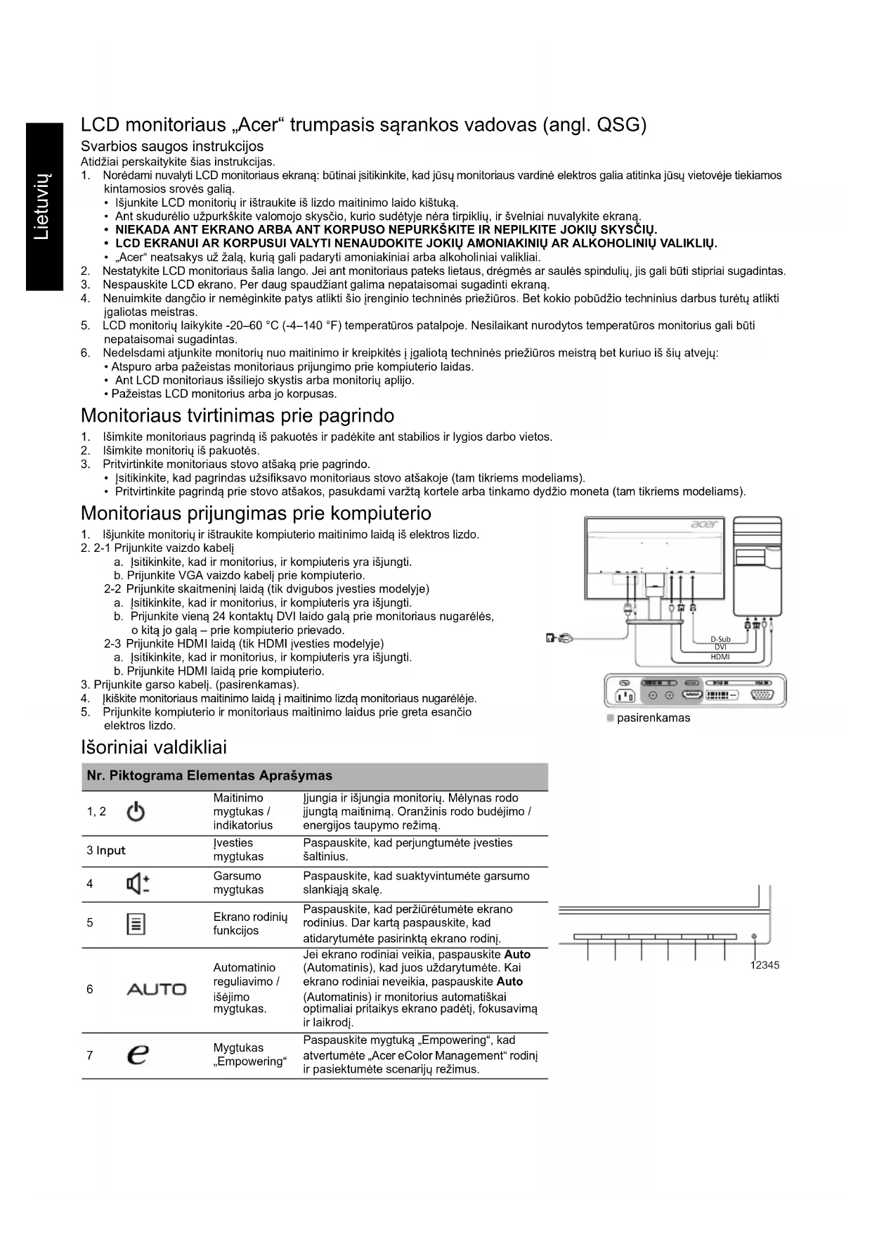 Värvitemperatuur 6-teljeline küllastus 6-teljeline toon Sinine tuli Keel Menüü ajapiirang Automaatseadistus Lai režiim ACM Sisend DDC/CI Automaatne allikas Kiire alustamise režiim Lähtesta Kõiki tehnilisi andmeid võidakse ette teatamata muuta.Lietuvių LCD monitoriaus „Acer“ trumpasis sąrankos vadovas (angl. QSG) Svarbios saugos instrukcijos Atidžiai perskaitykite šias instrukcijas. 1. Norėdami nuvalyti LCD monitoriaus ekraną: būtinai įsitikinkite, kad jūsų monitoriaus vardinė elektros galia atitinka jūsų vietovėje tiekiamos kintamosios srovės galią.