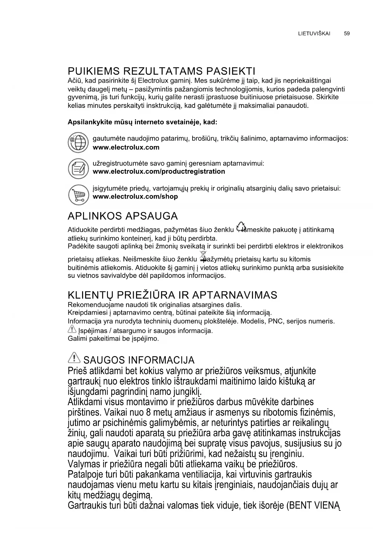 Ačiū, kad pasirinkite šį Electrolux gaminį. Mes sukūrėme jį taip, kad jis nepriekaištingai veiktų daugelį metų – pasižymintis pažangiomis technologijomis, kurios padeda palengvinti gyvenimą, jis turi funkcijų, kurių galite nerasti įprastuose buitiniuose prietaisuose. Skirkite kelias minutes perskaityti insktrukciją, kad galėtumėte jį maksimaliai panaudoti. Apsilankykite mūsų interneto svetainėje, kad: gautumėte naudojimo patarimų, brošiūrų, trikčių šalinimo, aptarnavimo informacijos: www.electrolux.com užregistruotumėte savo gaminį geresniam aptarnavimui: www.electrolux.com/productregistration įsigytumėte priedų, vartojamųjų prekių ir originalių atsarginių dalių savo prietaisui: www.electrolux.com/shop APLINKOS APSAUGA Atiduokite perdirbti medžiagas, pažymėtas šiuo ženklu . Išmeskite pakuotę į atitinkamą atliekų surinkimo konteinerį, kad ji būtų perdirbta. Padėkite saugoti aplinką bei žmonių sveikatą ir surinkti bei perdirbti elektros ir elektronikos prietaisų atliekas. Neišmeskite šiuo ženklu pažymėtų prietaisų kartu su kitomis buitinėmis atliekomis. Atiduokite šį gaminį į vietos atliekų surinkimo punktą arba susisiekite su vietnos savivaldybe dėl papildomos informacijos.