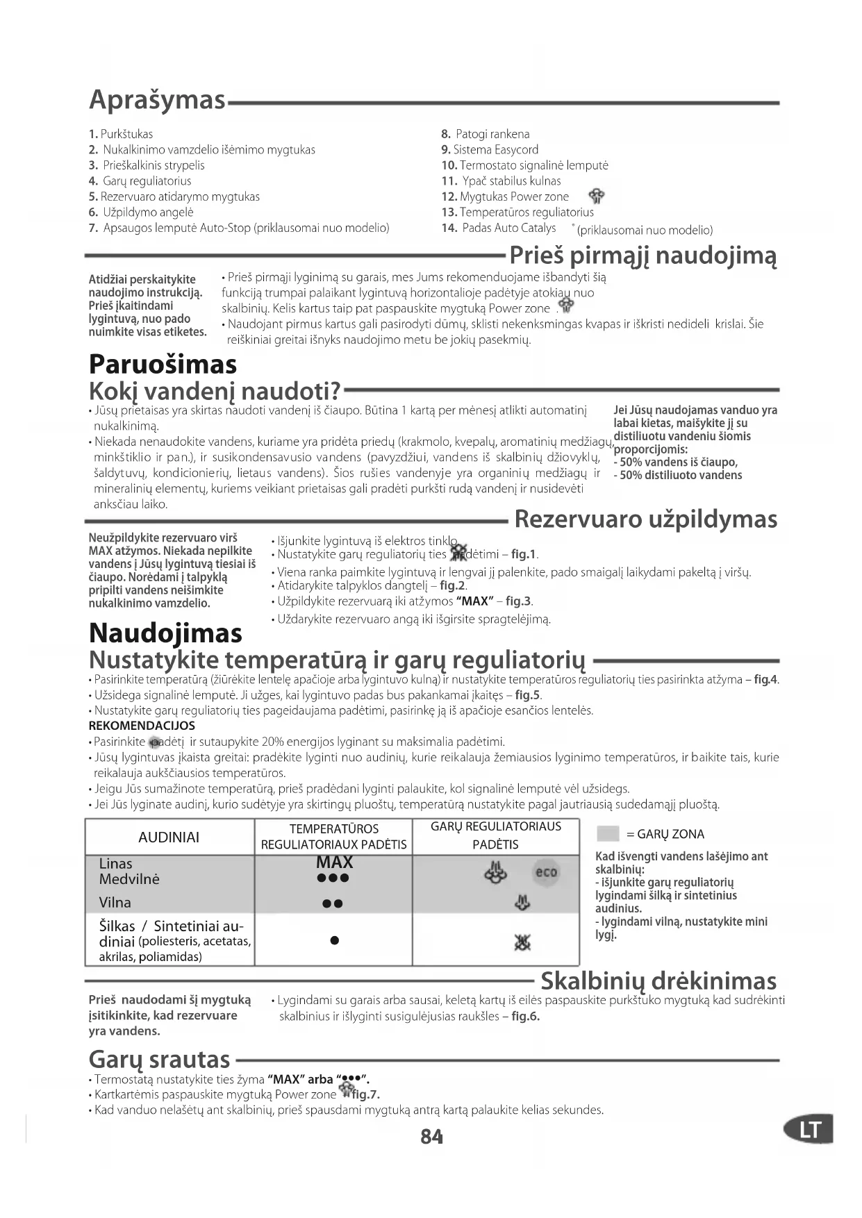 - Nustatykite norimą temperatūrą pagal lyginamą audinį.• Nustatykite garų reguliatorių ties padėtimi– fig.1.• Jūs galėsite pradėti lyginti, kai signalinė lemputė užges. Papildomos funkcijos Padas Autoclean Catalys