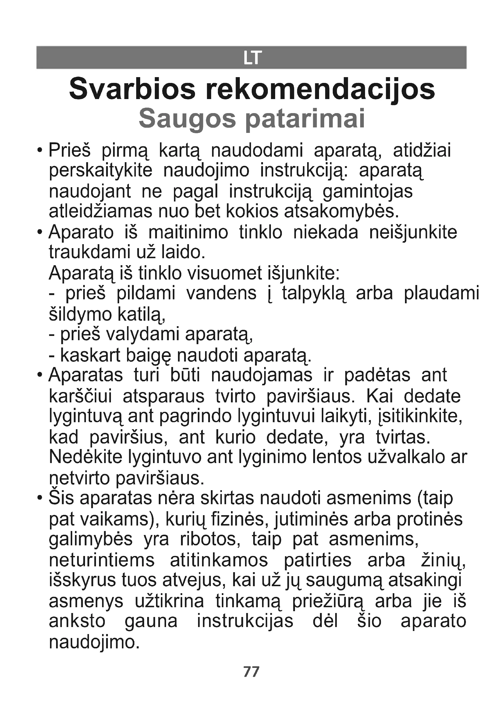 - Šis aparatas nėra skirtas naudoti asmenims (taip pat vaikams), kurių fizinės, jutiminės arba protinės galimybės yra ribotos, taip pat asmenims, neturintiems atitinkamos patirties arba žinių, išskyrus tuos atvejus, kai už jų saugumą atsakingi asmenys užtikrina tinkamą priežiūrą arba jie iš anksto gauna instrukcijas dėl šio aparato naudojimo.
