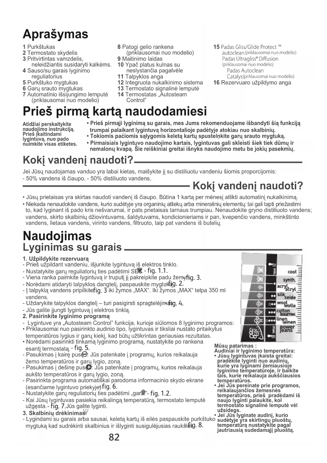 - Niekada nenaudokite vandens, kurio sudėtyje yra organinių atliekų arba mineralinių elementų: tai gali tapti priežastimi to, kad lyginant iš pado kris nešvarumai, ir pats prietaisas tarnaus trumpiau. Nenaudokite gryno distiliuoto vandens;vandens, skirto skalbinių džiovintuvams, šaldytuvams, kondicionieriams ir pan, kvepenčio vandens, minkštintovandens, lietaus vandens, virinto vandens, filtruoto, taip pat vandens iš butelių. Naudojimas Lyginimas su garais 1. Užpildykite rezervuarą- Prieš užpildant vandeniu, išjunkite lygintuvą iš elektros tinklo.- Nustatykite garų reguliatorių ties padėtimi SEC - fig. 1.1. - Viena ranka paimkite lygintuvą ir truputį jį pakreipkite padu žemyn. - fig. 3. - Norėdami atidaryti talpyklos dangtelį, paspauskite mygtuką - fig. 2. - Į talpyklą vandens pripilkite - fig. 3 iki žymos „MAX“. Iki žymos „MAX“ telpa 350 mlvandens.- Uždarykite talpyklos dangtelį – turi pasigirsti spragtelėjimas - fig. 4. - Jūs galite įjungti lygintuvą į elektros tinklą.2. Pasirinkite lyginimo programą- Lygintuve yra „Autosteam Control” funkcija, kurioje siūlomos 8 lyginimo programos:• Priklausomai nuo pasirinkto audinio tipo, lygintuvas ir tiksliai nustato pritaikytustemperatūros lygius ir garų kiekį, kad būtų užtikrintas geriausias rezultatas.• Norėdami pasirinkti tinkamą lyginimo programą, nustatykite po rankenaesantį termostatą. - fig. 5. - Pasukimas į kairę pusę : Jūs patenkate į programų, kurios reikalaujažemo temperatūros ir garų lygio, zoną.- Pasukimas į dešinę pusę : Jūs patenkate į programų, kurios reikalaujaaukšto temperatūros ir garų lygio, zoną. - Pasirinkta programa automatiškai parodoma informacinio skydo ekrane(esančiame lygintuvo priekyje) - fig. 6. - Nustatykite garų reguliatorių ties padėtimi „garai“ - fig. 1.2. - Kai Jūsų lygintuvas pasiekia reikalingą temperatūrą, termostato lemputėužgęsta. - fig. 7. Jūs galite lyginti.3. Skalbinių drėkinimas - Lygindami su garais arba sausai, keletą kartų iš eilės paspauskite purkštukomygtuką kad sudrėkinti skalbinius ir išlyginti susigulėjusias raukšles - fig. 8. Atidžiai perskaitykitenaudojimo instrukciją.Prieš įkaitindamilygintuvą, nuo padonuimkite visas etiketes.Mūsų patarimas : Audiniai ir lyginimo temperatūra:• Jūsų lygintuvas įkaista greitai:pradėkite lyginti nuo audinių,kurie yra lyginami žemiausiojelyginimo temperatūroje, ir baikitetais, kurie reikalauja aukščiausiostemperatūros.• Jei Jūs pereinate prie programos,reikalaujančios žemesnėstemperatūros, prieš pradėdami išnaujo lyginti palaukite, koltermostato signalinė lemputė vėlužsidegs.• Jei Jūs lyginate audinį, kuriosudėtyje yra skirtingų pluoštų,temperatūrą nustatykite pagaljautriausią sudedamąjį pluoštą. Aprašymas 1800135516 FV95XX E2_110x154 26/01/15 14:46 Page8283