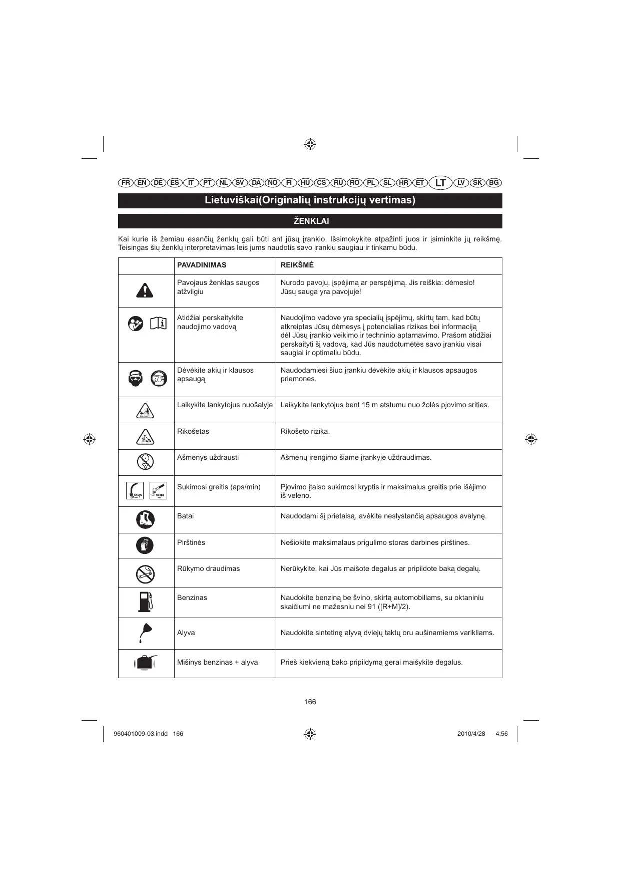 Lietuviškai(Originali3 instrukcij3 vertimas) ŽENKLAI Kai kurie iš žemiau esančių ženklų gali būti ant jūsų įrankio. Išsimokykite atpažinti juos ir įsiminkite jų reikšmę. Teisingas šių ženklų interpretavimas leis jums naudotis savo įrankiu saugiau ir tinkamu būdu. PAVADINIMAS REIKŠMĖ Pavojaus ženklas saugos atžvilgiu Nurodo pavojų, įspėjimą ar perspėjimą. Jis reiškia: dėmesio! Jūsų sauga yra pavojuje! Atidžiai perskaitykite naudojimo vadovą Naudojimo vadove yra specialių įspėjimų, skirtų tam, kad būtų atkreiptas Jūsų dėmesys į potencialias rizikas bei informaciją dėl Jūsų įrankio veikimo ir techninio aptarnavimo. Prašom atidžiai perskaityti šį vadovą, kad Jūs naudotumėtės savo įrankiu visai saugiai ir optimaliu būdu. Dėvėkite akių ir klausos apsaugą Naudodamiesi šiuo įrankiu dėvėkite akių ir klausos apsaugos priemones. Laikykite lankytojus nuošalyje Laikykite lankytojus bent 15 m atstumu nuo žolės pjovimo srities. Rikošetas Rikošeto rizika. Ašmenys uždrausti Ašmenų įrengimo šiame įrankyje uždraudimas. Sukimosi greitis (aps/min) Pjovimo įtaiso sukimosi kryptis ir maksimalus greitis prie išėjimo iš veleno. Batai Naudodami šį prietaisą, avėkite neslystančią apsaugos avalynę. Pirštinės Nešiokite maksimalaus prigulimo storas darbines pirštines. Rūkymo draudimas Nerūkykite, kai Jūs maišote degalus ar pripildote baką degalų. Benzinas Naudokite benziną be švino, skirtą automobiliams, su oktaniniu skaičiumi ne mažesniu nei 91 ([R+M]/2). Alyva Naudokite sintetinę alyvą dviejų taktų oru aušinamiems varikliams. Mišinys benzinas + alyva Prieš kiekvieną bako pripildymą gerai maišykite degalus.