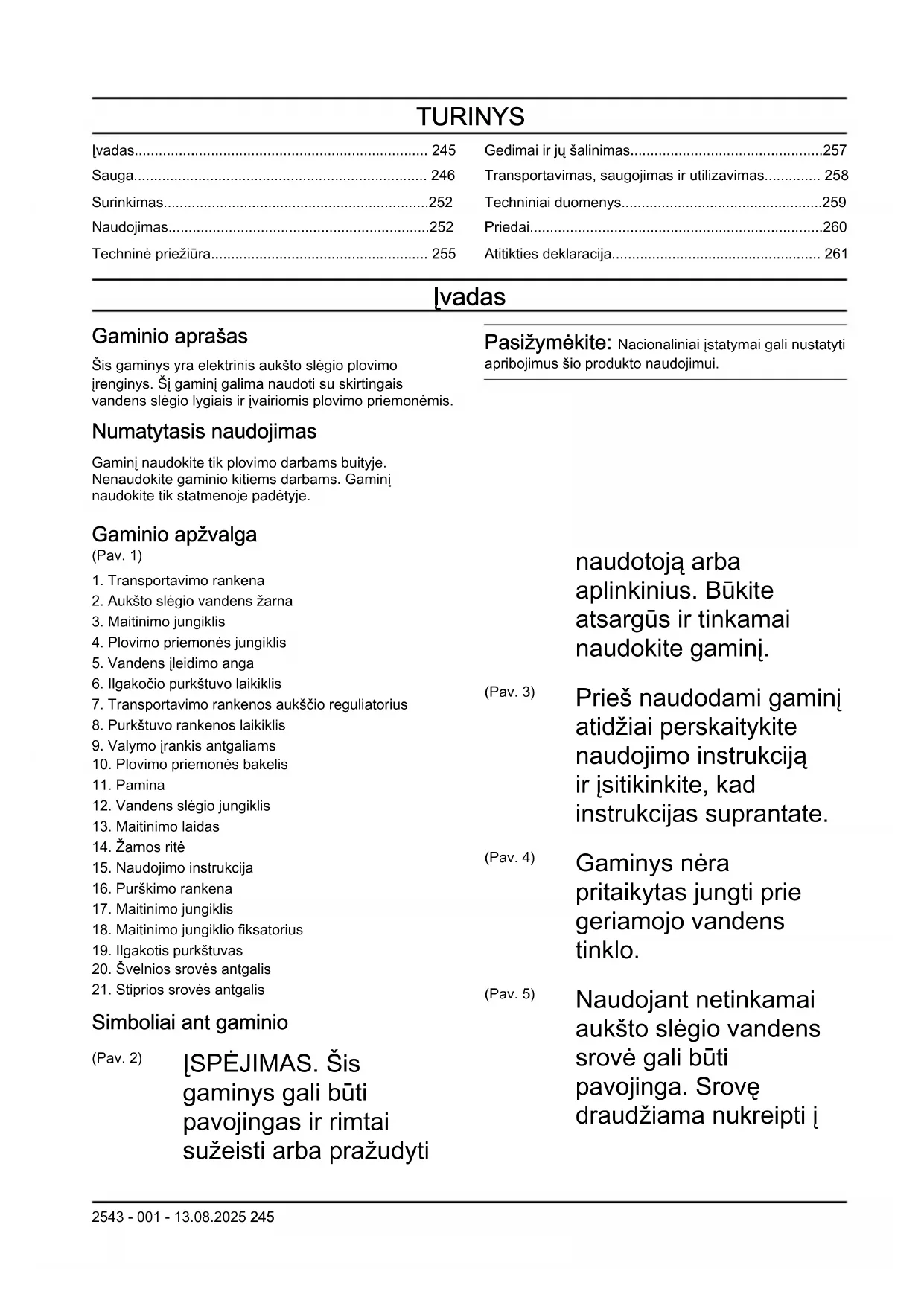 Simboliai ant gaminio (Pav. 2) ĮSPĖJIMAS. Šis gaminys gali būti pavojingas ir rimtai sužeisti arba pražudyti naudotoją arba aplinkinius. Būkite atsargūs ir tinkamai naudokite gaminį. (Pav. 3) Prieš naudodami gaminį atidžiai perskaitykite naudojimo instrukciją ir įsitikinkite, kad instrukcijas suprantate. (Pav. 4) Gaminys nėra pritaikytas jungti prie geriamojo vandens tinklo. (Pav. 5) Naudojant netinkamai aukšto slėgio vandens srovė gali būti pavojinga. Srovę draudžiama nukreipti į 2543 - 001 - 13.08.2025 245žmogų, elektros įrangą ar gaminį. (Pav. 6) Aplinkosaugos simbolis. Gaminys ar gaminio pakuotė nepriskiriami buitinėms atliekoms. Nuvežkite jį į įgaliotą elektros ir elektronikos įrenginių utilizavimo vietą. (Pav. 7) II klasės įrankis. (Pav. 8) Triukšmo emisijos į aplinką ženklinimas atitinka ES ir Jungtinės Karalystės direktyvas bei reglamentus ir Naujojo Pietų Velso įstatymą „2017m. aplinkos apsaugos (triukšmo kontrolės) reglamentas“. Gaminio garantuotas garso galios lygis nurodytas Techniniai duomenys psl. 259 ir etiketėje. (Pav. 9) Apsaugota nuo žemo slėgio vandens srovės bet kuriuo kampu. (Pav. 10) Saugokite nuo šalčio. (Pav. 11) Šis gaminys atitinka taikomas ES direktyvas. Pasižymėkite: Kiti ant gaminio pateikti simboliai (etiketės) skirti kai kurių rinkų sertifikavimo reikalavimams. Produkto pažeidimai Mes neatsakome už mūsų gaminio sugadinimą, jei: