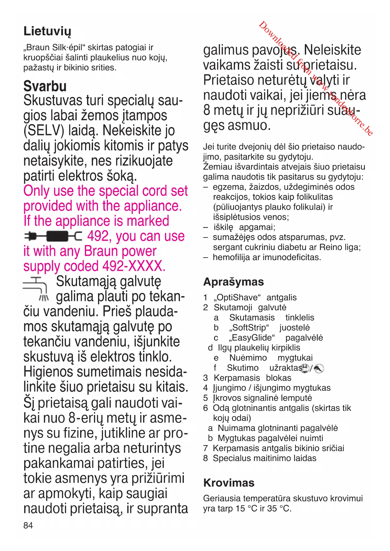 - Kai skustuvas pilnai įsikraus, iškraukite jį įprastai naudodamos. Tuomet vėl pilnai įkraukite. Didžiausias baterijų galingumas bus pasiektas tik po kelių įkrovimo / iškrovimo ciklų.