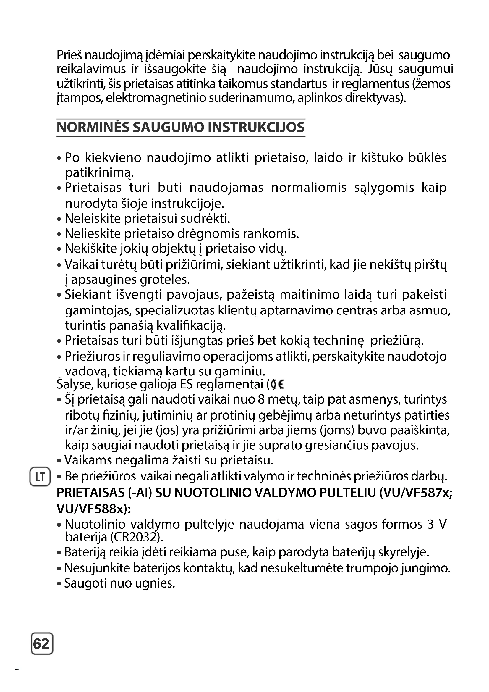 - Be priežiūros vaikai negali atlikti valymo ir techninės priežiūros darbų. PRIETAISAS (-AI) SU NUOTOLINIO VALDYMO PULTELIU (VU/VF587x; VU/VF588x):