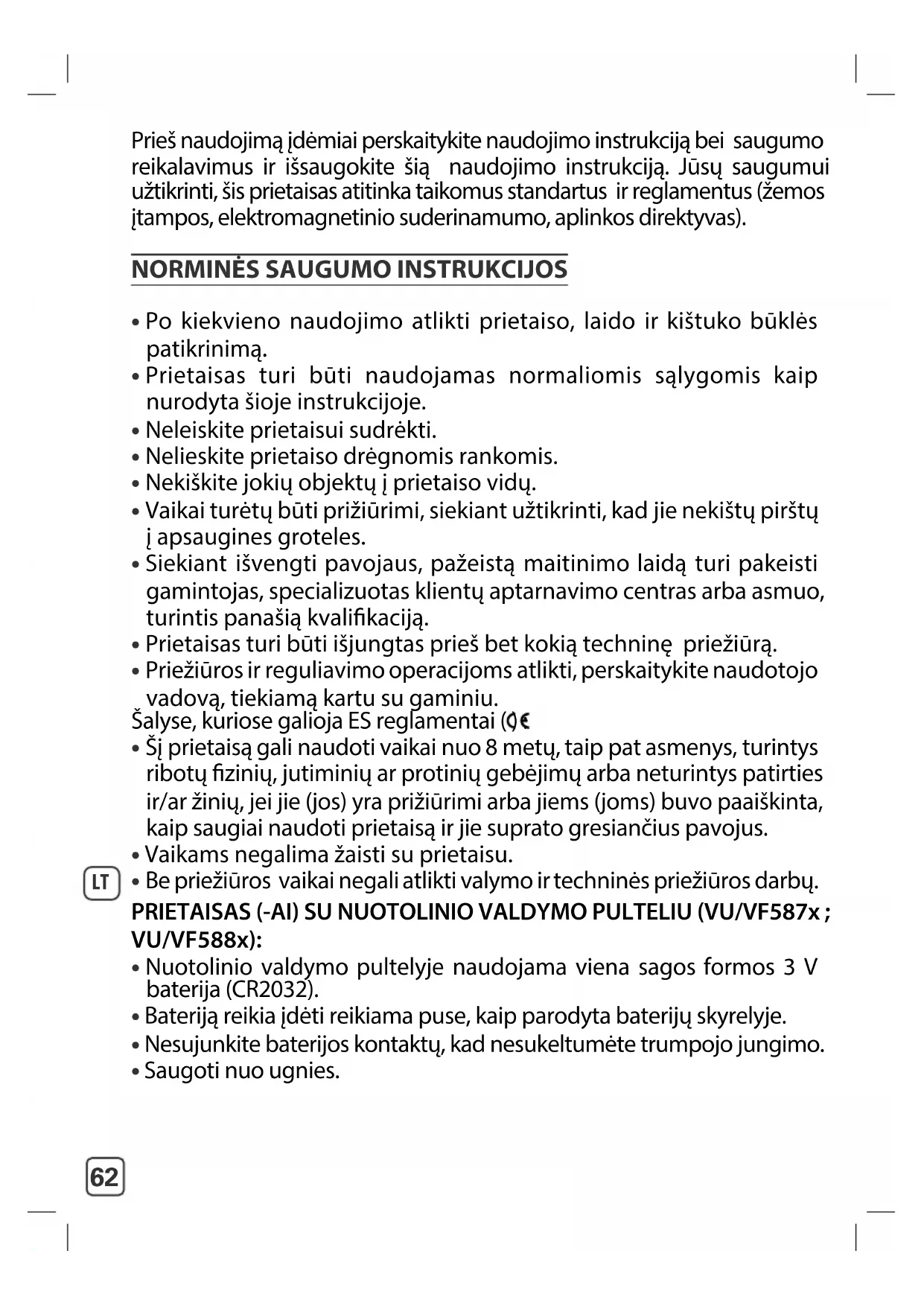 - Be priežiūros vaikai negali atlikti valymo ir techninės priežiūros darbų. PRIETAISAS (-AI) SU NUOTOLINIO VALDYMO PULTELIU (VU/VF587x ; VU/VF588x):