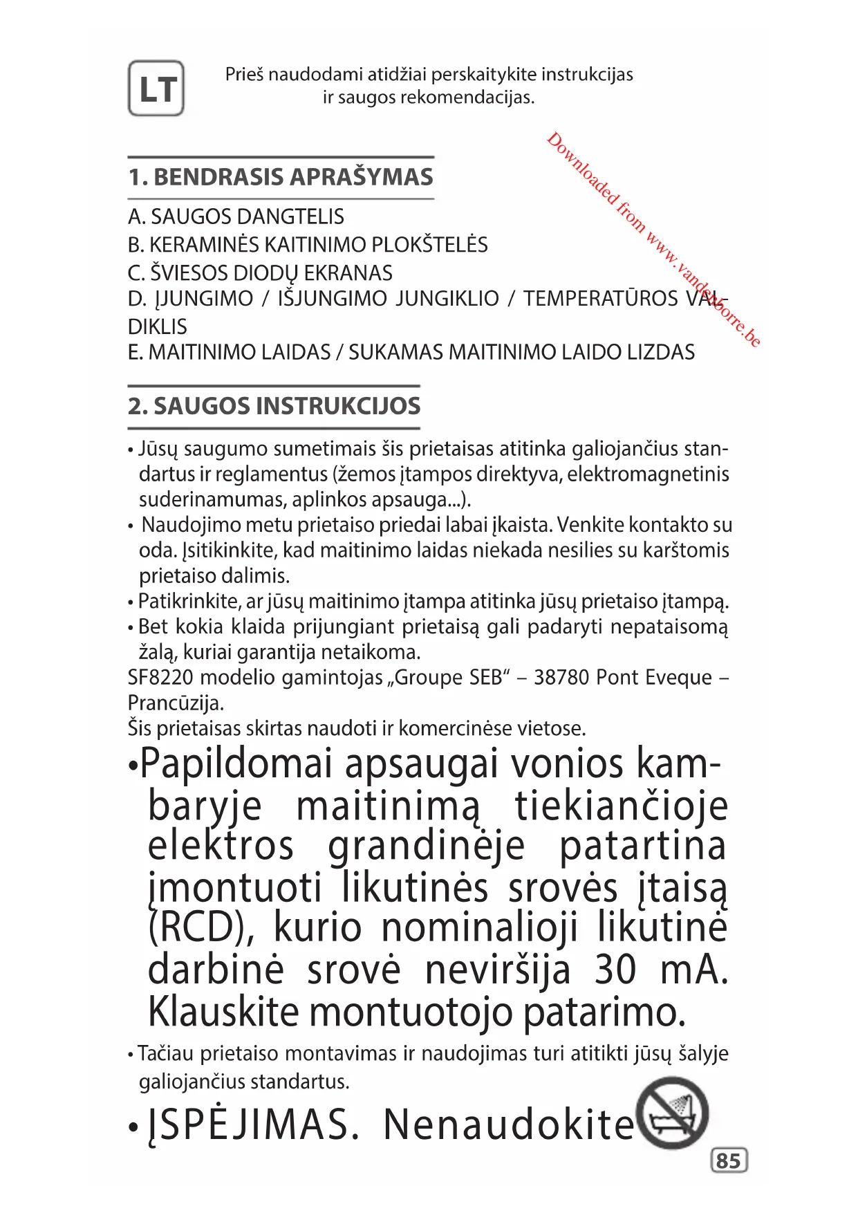 - Bet kokia klaida prijungiant prietaisą gali padaryti nepataisomą žalą, kuriai garantija netaikoma. SF8220 modelio gamintojas „Groupe SEB“ – 38780 Pont Eveque – Prancūzija. Šis prietaisas skirtas naudoti ir komercinėse vietose.