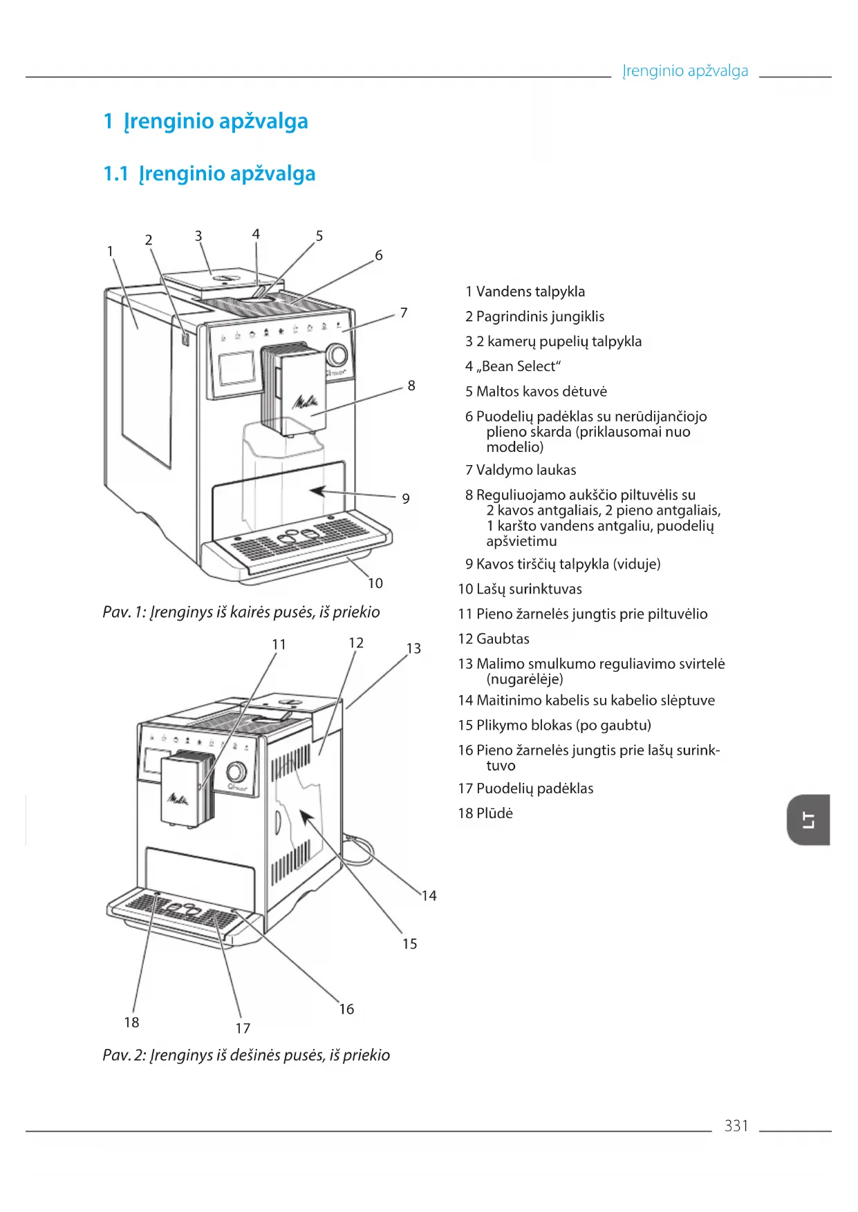 Pav. 2: Įrenginys iš dešinės pusės, iš priekio 1 Vandens talpykla 2 Pagrindinis jungiklis 3 2 kamerų pupelių talpykla 4 „Bean Select“ 5 Maltos kavos dėtuvė 6 Puodelių padėklas su nerūdijančiojo plieno skarda (priklausomai nuo modelio) 7 Valdymo laukas 8 Reguliuojamo aukščio piltuvėlis su 2kavos antgaliais, 2 pieno antgaliais, 1 karšto vandens antgaliu, puodelių apšvietimu 9 Kavos tirščių talpykla (viduje) 10 Lašų surinktuvas 11 Pieno žarnelės jungtis prie piltuvėlio 12 Gaubtas 13 Malimo smulkumo reguliavimo svirtelė (nugarėlėje) 14 Maitinimo kabelis su kabelio slėptuve 15 Plikymo blokas (po gaubtu) 16 Pieno žarnelės jungtis prie lašų surink- tuvo 17 Puodelių padėklas 18 PlūdėĮrenginio apžvalga