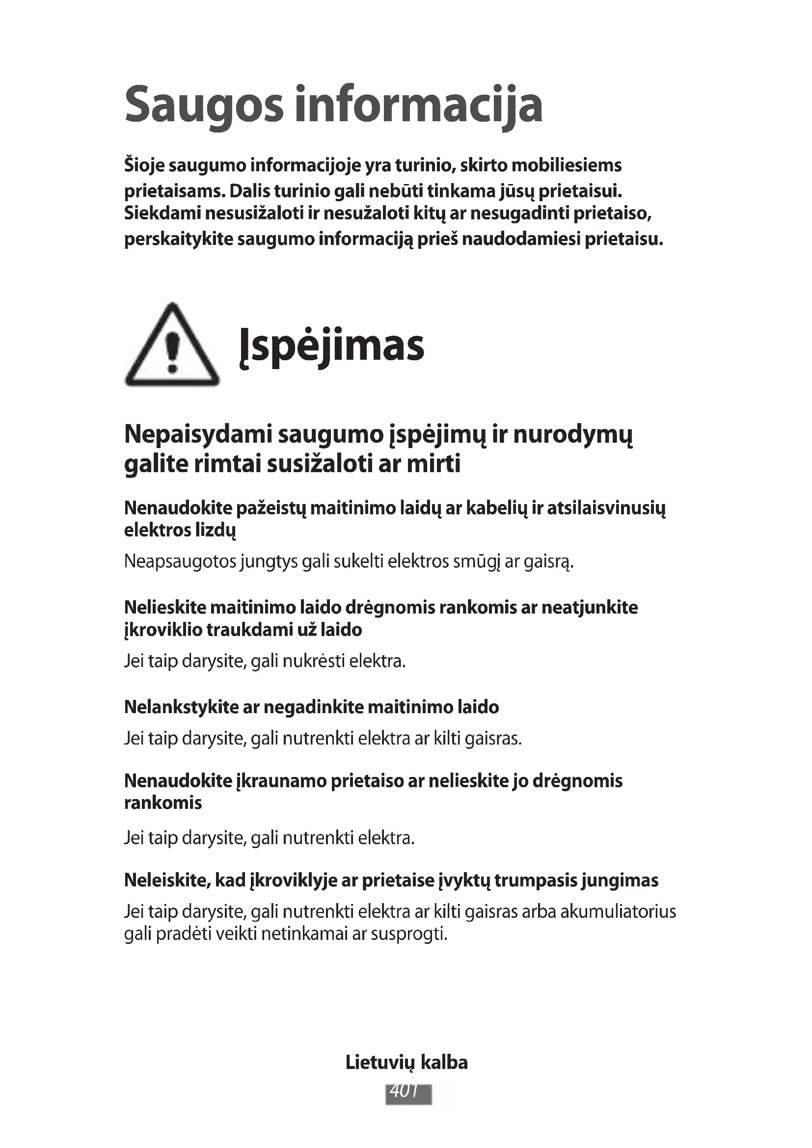 Saugos informacija Šioje saugumo informacijoje yra turinio, skirto mobiliesiems prietaisams. Dalis turinio gali nebūti tinkama jūsų prietaisui. Siekdami nesusižaloti ir nesužaloti kitų ar nesugadinti prietaiso, perskaitykite saugumo informaciją prieš naudodamiesi prietaisu. Įspėjimas Nepaisydami saugumo įspėjimų ir nurodymų galite rimtai susižaloti ar mirti Nenaudokite pažeistų maitinimo laidų ar kabelių ir atsilaisvinusių elektros lizdų Neapsaugotos jungtys gali sukelti elektros smūgį ar gaisrą. Nelieskite maitinimo laido drėgnomis rankomis ar neatjunkite įkroviklio traukdami už laido Jei taip darysite, gali nukrėsti elektra. Nelankstykite ar negadinkite maitinimo laido Jei taip darysite, gali nutrenkti elektra ar kilti gaisras. Nenaudokite įkraunamo prietaiso ar nelieskite jo drėgnomis rankomis Jei taip darysite, gali nutrenkti elektra. Neleiskite, kad įkroviklyje ar prietaise įvyktų trumpasis jungimas Jei taip darysite, gali nutrenkti elektra ar kilti gaisras arba akumuliatorius gali pradėti veikti netinkamai ar susprogti.Lietuvių kalba