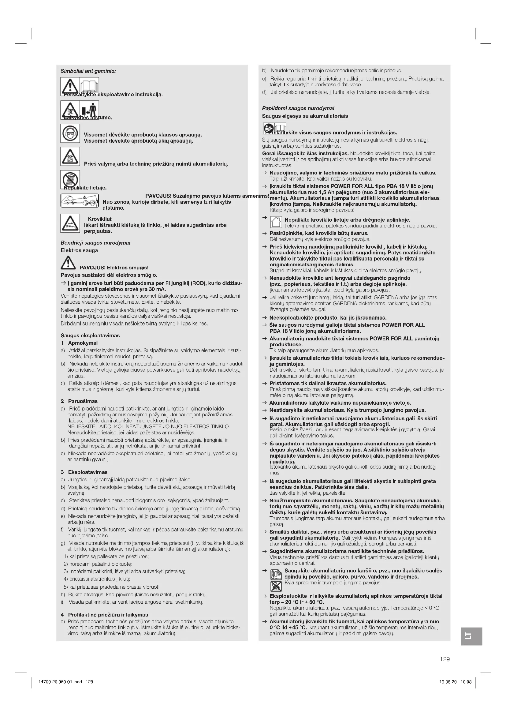 Nepalikite kroviklio lietuje arba drėgnoje aplinkoje. Į elektrinį prietaisą patekęs vanduo padidina elektros smūgio pavojų. v Pasirūpinkite, kad kroviklis būtų švarus. Dėl nešvarumų kyla elektros smūgio pavojus. v Prieš kiekvieną naudojimą patikrinkite kroviklį, kabelį ir kištuką. Nenaudokite kroviklio, jei aptikote sugadinimų. Patys neatidarykite kroviklio ir taisykite tiktai pas kvalifikuotą personalą ir tiktai su originaliomis atsarginėmis dalimis. Sugadinti krovikliai, kabelis ir kištukas didina elektros smūgio pavojų. v Nenaudokite kroviklio ant lengvai užsidegančio pagrindo (pvz., popieriaus, tekstilės ir t.t.) arba degioje aplinkoje. Įkraunamas kroviklis įkaista, todėl kyla gaisro pavojus. v Jei reikia pakeisti jungiamąjį laidą, tai turi atlikti GARDENA arba jos įgaliotas klientų aptarnavimo centras GARDENA elektriniams įrankiams, kad būtų išvengta grėsmės saugai. v Neeksploatuokite produkto, kai jis įkraunamas. v Šie saugos nurodymai galioja tiktai sistemos POWER FOR ALL PBA 18V ličio jonų akumuliatoriams. v Akumuliatorių naudokite tiktai sistemos POWER FOR ALL gamintojų produktuose. Tik taip apsaugosite akumuliatorių nuo apkrovos. v Įkraukite akumuliatorius tiktai tokiais krovikliais, kuriuos rekomenduo- ja gamintojas. Dėl kroviklio, skirto tam tikrai akumuliatorių rūšiai krauti, kyla gaisro pavojus, jei naudojamas su kitokiu akumuliatoriumi. v Pristatomas tik dalinai įkrautas akumuliatorius. Prieš pirmą naudojimą visiškai įkraukite akumuliatorių kroviklyje, kad užtikrintu- mėte pilną akumuliatoriaus pajėgumą. v Akumuliatorius laikykite vaikams nepasiekiamoje vietoje. v Neatidarykite akumuliatoriaus. Kyla trumpojo jungimo pavojus. v Iš sugadinto ir netinkamai naudojamo akumuliatoriaus gali išsiskirti garai. Akumuliatorius gali užsidegti arba sprogti. Pasirūpinkite šviežiu oru ir esant negalavimams kreipkitės į gydytoją. Garai gali dirginti kvėpavimo takus. v Iš sugadinto ir neteisingai naudojamo akumuliatoriaus gali išsiskirti degus skystis. Venkite sąlyčio su juo. Atsitiktinio sąlyčio atveju nuplaukite vandeniu. Jei skysčio pateko į akis, papildomai kreipkitės įgydytoją. Ištekantis akumuliatoriaus skystis gali sukelti odos sudirginimą arba nudegi- mus. v Iš sugedusio akumuliatoriaus gali ištekėti skystis ir sušlapinti greta esančius daiktus. Patikrinkite šias dalis. Jas valykite ir, jei reikia, pakeiskite. v Neužtrumpinkite akumuliatoriaus. Saugokite nenaudojamą akumulia- torių nuo sąvaržėlių, monetų, raktų, vinių, varžtų ir kitų mažų metalinių daiktų, kurie galėtų sukelti kontaktų šuntavimą. Trumpasis jungimas tarp akumuliatoriaus kontaktų gali sukelti nudegimus arba gaisrą. v Smailūs daiktai, pvz., vinys arba atsuktuvai ar išorinių jėgų poveikis gali sugadinti akumuliatorių. Gali įvykti vidinis trumpasis jungimas ir iš akumuliatorius rūkti dūmai, jis gali užsidegti, sprogti arba perkaisti. v Sugadintiems akumuliatoriams neatlikite techninės priežiūros. Visus techninės priežiūros darbus turi atlikti gamintojas arba įgaliotieji klientų aptarnavimo centrai.