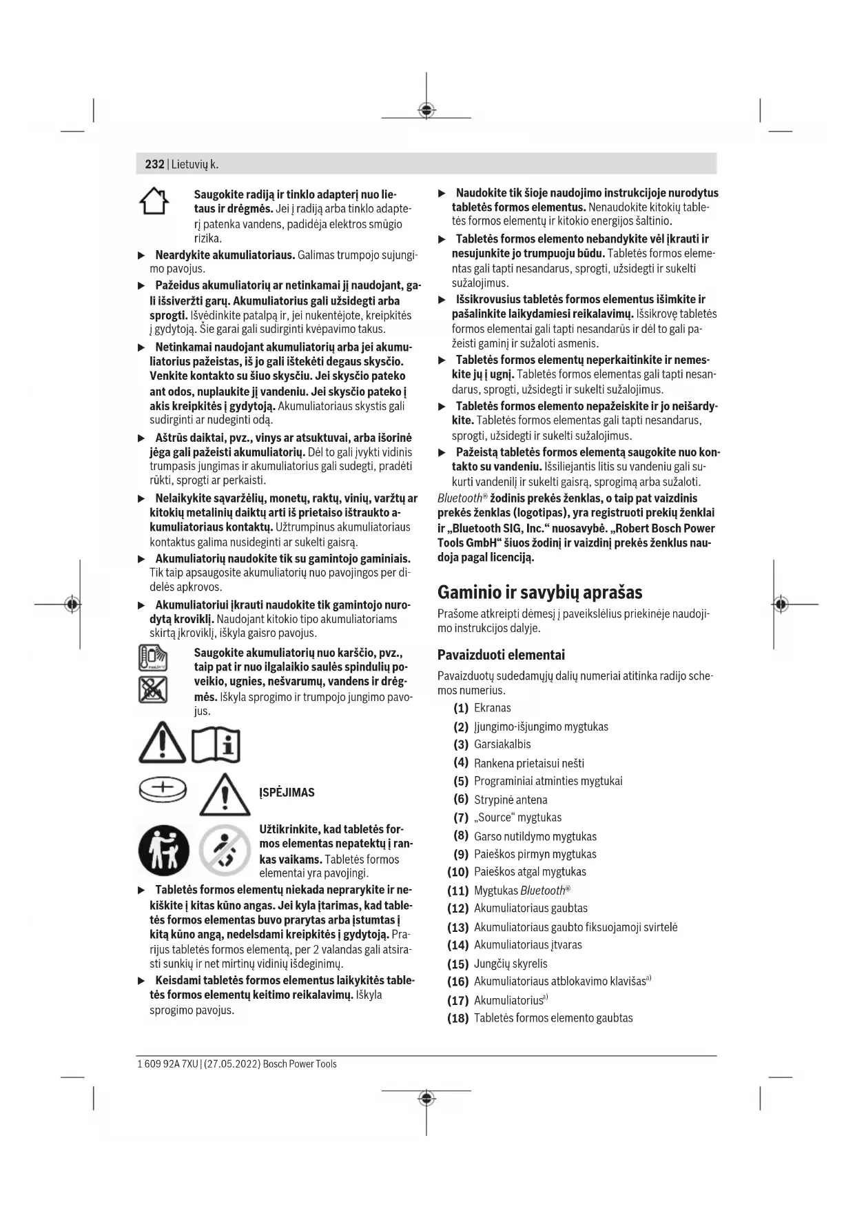 Kitus techninius duomenis rasite čia: https://www.bosch-professional.com/ecodesign Elektros energijos tiekimas į radiją Elektros energija į radiją gali būti tiekiama iš ličio jonų akumuliatoriaus(17) arba per tinklo adapterį(20). Naudojimas su akumuliatoriumi u Naudokite tik techninių duomenų skyriuje nurodytus kroviklius. Tik šie krovikliai yra priderinti prie jūsų radiju- je naudojamo ličio jonų akumuliatoriaus. Nuoroda: naudojant radijui netinkamus akumuliatorius, radi- jas gali pradėti netinkamai veikti arba gali būti pažeistas. Celių apsaugos sistema „Electronic Cell Protection (ECP)“ saugo ličio jonų akumuliatorių nuo visiškos iškrovos. Kai aku- muliatorius išsikrauna, apsauginis išjungiklis išjungia radiją. u Neįjunkite radijo, jei jį išjungė apsauginis išjungklis. Taip galite sugadinti ličio jonų akumuliatorių. Akumuliatoriaus keitimas Atlaisvinkite akumuliatoriaus gaubto fiksuojamąją svirtelę(13) ir atidarykite akumuliatoriaus gaubtą(12). Norėdami išimti akumuliatorių, paspauskite ant akumuliato- riaus esantį atblokavimo mygtuką(16) ir ištraukite akumulia- torių iš akumuliatoriaus skyriaus. Traukdami nenaudokite jėgos. Norėdami įdėti akumuliatorių, stumkite jį į akumuliatoriaus įtvarą(14), akumuliatoriaus jungtys priglustų prie akumulia- toriaus įtvaro jungčių. Akumuliatorius turi užsifiksuoti. Uždenkite akumuliatoriaus gaubtą(12) ir jį užfiksuokite. Akumuliatoriaus įkrovos būklės indikatorius Kai akumuliatorius įstatytas, akumuliatoriaus(17) įkrovos būklė yra rodoma ekrane, o kai akumuliatorius išimtas – ant paties akumuliatoriaus. Akumuliatoriaus įkrovos būklė ekrane Akumuliatoriaus įkrovos indikatorius(i) atsiranda ekrane iš- kart, kai tik įstatomas pakankamos įtampos akumuliatorius, o radijas su elektros tinklu yra sujungtas nenaudojant tinklo adapterio(20). Indikatorius Talpa 80−100% 60−80% 40−60 % 20−40 % 5−20 % 0−5 % Akumuliatoriaus įkrovos būklės rodmuo ant akumuliatoriaus Jei akumuliatorius išimamas iš radijo, įkrovos būklę gali rodyti ant akumuliatoriaus esantys žali šviesadiodžiai įkrovos būklės indikatoriai. Jei norite, kad būtų parodyta įkrovos būklė, paspauskite įkrovos būklės mygtuką arba . Jei paspaudus mygtuką nešviečia nei vienas šviesadiodis in- dikatorius, vadinasi akumuliatorius yra pažeistas ir jį reikia pakeisti. Akumuliatoriaus tipas GBA 18V... LEDs Talpa Šviečia nuolat 3× žalias 60−100% Šviečia nuolat 2× žalias 30−60% Šviečia nuolat 1× žalias 5−30% Mirksi 1× žalias 0−5% Akumuliatoriaus tipas ProCORE18V... LEDs Talpa Šviečia nuolat 5× žalias 80−100% Šviečia nuolat 4× žalias 60−80% Šviečia nuolat 3× žalias 40−60 % Šviečia nuolat 2× žalias 20−40 % Šviečia nuolat 1× žalias 5−20 % Mirksi 1× žalias 0−5 % Eksploatacija su tinklo adapteriu (žr.Apav.) u Naudokite tik techninių duomenų skyriuje nurodytus tinklo adapterius. Tik taip galėsite užtikrinti nepriekaiš- tingą radijo veikimą. u Atkreipkite dėmesį į tinklo įtampą! Maitinimo šaltinio įtampa turi sutapti su tinklo adapterio firminėje lentelėje nurodytais duomenimis. Atidenkite jungčių skyrelio(15) apsauginį gaubtelį. Tinklo adapterio prietaiso kištuką(21) įstatykite į jungiamąją įvorę(22) (DCIN18V). Įjunkite tinklo adapterį į elektros tinklą. Kai ištraukiate prietaiso kištuką(21), apsaugai nuo nešvaru- mų užtikrinti vėl uždenkite jungčių skyrelio(15) apsauginį gaubtelį. 1 609 92A 7XU | (27.05.2022) Bosch Power ToolsLietuvių k. | 235 Tabletės formos elemento keitimas Kad radijuje būtų išsaugomas laikas ir kiti nustatymai, kaip buferinę bateriją reikia įdėti tabletės formos elementą. Prieš pradėdami eksploatuoti radiją pirmą kartą, ištraukite įdėto tabletės formos elemento apsauginę juostelę. Atlaisvinkite akumuliatoriaus gaubto fiksuojamąją svirtelę(13) ir atidarykite akumuliatoriaus gaubtą(12). Jei reikia, išimkite akumuliatorių(17). Ištraukite apsauginę juostelę, esančią po tabletės formos elemento gaubteliu(18). Jei radijuje nebeišsaugomas paros laikas ir susilpnėja rodmenys, pakeiskite tabletės formos elementą. Tuo tikslu sukite tabletės formos elemento gaubtelį(18) prieš laikrodžio rodyklę (pvz., moneta) ir nuimkite gaubtelį. Įdėkite naują tabletės formos elementą. Atkreipkite dėmesį į gaubtelio(18) vidinėje pusėje nurody- tus polius. Tabletės formos elemento gaubtelį(18) vėl uždėkite ir tvirtai užsukite, sukdami pagal laikrodžio rodyklę. Gaubtelis geria užfiksuotas yra tik tada, jei gaubtelio žymė ir spynos simbolis yra nukreipti vienas į kitą. u Jei radijo ilgesnį laiką nenaudosite, išimkite iš jo tab- letės formos elementą. Ilgesnį laiką radijuje sandėliuoja- mas tabletės formos elementas dėl korozijos gali pradėti irti ir savaime išsikrauti. Naudojimas u Saugokite radiją nuo tiesioginio kontakto su vandeniu. Įradiją patekęs vanduo padidina elektros smūgio riziką. u Akumuliatoriaus gaubtą ir jungčių skyrelio apsauginį gaubtelį, jei tik galima, laikykite uždengtus. Uždengti gaubtai saugo radiją nuo vandens ir dulkių. Garso režimas Įjungimas ir išjungimas Norėdami radiją įjungti, paspauskite įjungimo-išjungimo mygtuką(2). Suaktyvinamas ekranas(1) ir transliuojamas radijo paskutinio išjungimo metu nustatytas garso šaltinis. Kiekvieną kartą paspaudžiant mygtuką, kelioms sekundėms apšviečiamas ekranas(1). Norėdami radiją išjungti, paspauskite įjungimo-išjungimo mygtuką(2). Esamas garso šaltinio nustatymas išsaugomas. Garso stiprumo reguliavimas Radiją įjungus visada yra nustatytas žemas garso stiprumas. Norėdami padidinti garso stiprumą, sukite įjungimo-išjungi- mo mygtuką(2) pagal laikrodžio rodyklę, o norėdami garso stiprumą sumažinti – prieš laikrodžio rodyklę. Garso stiprumo nustatymas<VL> arba <Volume> su verte nuo 0 iki 30 kelias sekunde