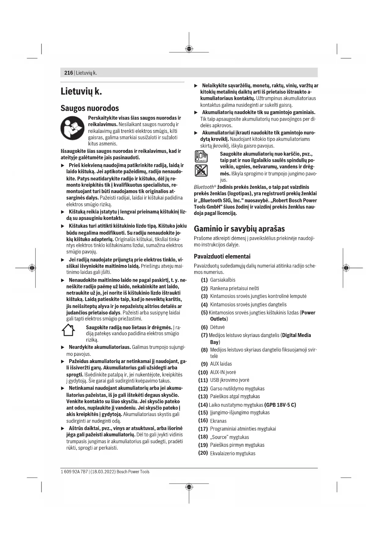 Apsaugos klasė /Ⅰ /Ⅰ Rekomenduojama aplinkos temperatūra įkraunant °C 0…+35 0…+35 Leidžiamoji aplinkos temperatūra veikiant °C 0…+35 0…+35 Leidžiamoji aplinkos temperatūra sandėliuojant °C −20…+50 −20…+50 Rekomenduojami akumuliatoriai GBA 18V… ProCORE18V… GBA 18V… ProCORE18V… Rekomenduojami krovikliai GAL 18… GAX 18… GAL 36… GAL 18… GAX 18… GAL 36… A) Priklausomai nuo naudojamo akumuliatoriaus Elektros energijos tiekimas į radiją Elektros energija į radiją gali būti tiekiama iš elektros tinklo arba iš ličio jonų akumuliatoriaus(26). Jei elektros energija tiekiama iš akumuliatoriaus, galima nau- dotis tik garso režimo funkcijomis, o elektros energija išori- niams prietaisams tiekiama per integruotą USB jungtį. Eksploatacija, kai maitinama iš tinklo u Atkreipkite dėmesį į tinklo įtampą! Maitinimo šaltinio įtampa turi sutapti su radijo firminėje lentelėje nurodytais duomenimis. 230V pažymėtus radijus taip pat galima jungti ir į 220V įtampos elektros tinklą. Bosch Power Tools 1 609 92A 7B7 | (18.03.2022)218 | Lietuvių k. Naudojimas su akumuliatoriumi u Naudokite tik techninių duomenų skyriuje nurodytus kroviklius. Tik šie krovikliai yra priderinti prie jūsų radiju- je naudojamo ličio jonų akumuliatoriaus. Nuoroda: naudojant radijui netinkamus akumuliatorius, radi- jas gali pradėti netinkamai veikti arba gali būti pažeistas. Celių apsaugos sistema „Electronic Cell Protection (ECP)“ saugo ličio jonų akumuliatorių nuo visiškos iškrovos. Kai aku- muliatorius išsikrauna, apsauginis išjungiklis išjungia radiją. u Neįjunkite radijo, jei jį išjungė apsauginis išjungklis. Taip galite sugadinti ličio jonų akumuliatorių. Akumuliatoriaus keitimas Atlaisvinkite akumuliatoriaus gaubto fiksuojamąją svirtelę(28) ir atidarykite akumuliatoriaus gaubtą(27). Norėdami išimti akumuliatorių, paspauskite ant akumuliato- riaus esantį atblokavimo mygtuką(25) ir ištraukite akumulia- torių iš akumuliatoriaus skyriaus. Traukdami nenaudokite jėgos. Norėdami įdėti akumuliatorių, stumkite jį į akumuliatoriaus įtvarą(29), akumuliatoriaus jungtys priglustų prie akumulia- toriaus įtvaro jungčių. Akumuliatorius turi užsifiksuoti. Uždenkite akumuliatoriaus gaubtą(27) ir jį užfiksuokite. Akumuliatoriaus įkrovos būklės indikatorius Kai akumuliatorius įstatytas, akumuliatoriaus(26) įkrovos būklė yra rodoma ekrane, o kai akumuliatorius išimtas – ant paties akumuliatoriaus. Akumuliatoriaus įkrovos būklė ekrane Akumuliatoriaus įkrovos indikatorius(b) atsiranda ekrane iš- kart, kai tik įstatomas pakankamos įtampos akumuliatorius, o radijas nėra sujungtas su elektros tinklu. Indikatorius Talpa 80−100% 60−80% 40−60 % 20−40 % 5−20 % 0−5 % Akumuliatoriaus įkrovos būklės rodmuo ant akumuliatoriaus Jei akumuliatorius išimamas iš radijo, įkrovos būklę gali rodyti ant akumuliatoriaus esantys žali šviesadiodžiai įkrovos būklės indikatoriai. Jei norite, kad būtų parodyta įkrovos būklė, paspauskite įkrovos būklės mygtuką arba . Jei paspaudus mygtuką nešviečia nei vienas šviesadiodis in- dikatorius, vadinasi akumuliatorius yra pažeistas ir jį reikia pakeisti. Akumuliatoriaus tipas GBA 18V... LEDs Talpa Šviečia nuolat 3× žalias 60−100% Šviečia nuolat 2× žalias 30−60% Šviečia nuolat 1× žalias 5−30% Mirksi 1× žalias 0−5% Akumuliatoriaus tipas ProCORE18V... LEDs Talpa Šviečia nuolat 5× žalias 80−100% Šviečia nuolat 4× žalias 60−80% Šviečia nuolat 3× žalias 40−60 % Šviečia nuolat 2× žalias 20−40 % Šviečia nuolat 1× žalias 5−20 % Mirksi 1× žalias 0−5 % Buferinių baterijų įdėjimas/keitimas Paros laikui ir kitiems radijo nustatymams išsaugoti reikia įdėti buferines baterijas. Tuo tikslu patariama naudoti šar- mines mangano baterijas. Atlaisvinkite akumuliatoriaus gaubto fiksuojamąją svirtelę(28) ir atidarykite akumuliatoriaus gaubtą(27). Jei reikia, išimkite akumuliatorių(26). Norėdami atidaryti baterijų skyriaus dangtelį(24), paspaus- kite fiksatorių(23) ir nuimkite baterijų skyriaus dangtelį. Įdė- kite kartu pateiktas buferines baterijas. Įdėdami baterijas atkreipkite dėmesį į baterijų skyriaus vidu- je nurodytus baterijų polius. Vėl uždėkite baterijų skyriaus dangtelį(24). "REPLACE AA BATTERY WHEN UNIT NOLONGER KEEPS CORRECT TIME": Jei radijuje nebeišsaugomas paros laikas, pakeiskite buferines baterijas. Visada kartu pakeiskite visas baterijas. Naudokite tik vieno gamintojo ir vienodos talpos baterijas. u Jei radijo ilgesnį laiką nenaudosite, išimkite iš jo bufe- rines baterijas. Ilgesnį laiką radijuje laikomos buferinės baterijos dėl korozijos gali pradėti irti ir savaime išsi- krauti. Naudojimas u Saugokite radiją nuo tiesioginio kontakto su vandeniu. Įradiją patekęs vanduo padidina elektros smūgio riziką. u Akumuliatoriaus skyriaus, medijos leistuvo ir kinta- mosios srovės jungčių dangtelius, jei tik galima, laiky- kite uždarykite. Uždengti gaubtai saugo radiją nuo van- dens ir dulkių. 1 609 92A 7B7 | (18.03.2022) Bosch Power ToolsLietuvių k. | 219 Garso režimas Įjungimas ir išjungimas Norėdami radiją įjungti, paspauskite įjungimo-išjungimo mygtuką(15). Suaktyvinamas ekranas(16) ir transliuoja- mas radijo paskutinio išjungimo metu nustatytas garso šal- tinis. Norėdami radiją išjungti, dar kartą paspauskite įjungimo-iš- jungimo mygtuką(15). Esamas garso šaltinio nustatymas iš- saugomas. Garso stiprumo reguliavimas Radiją įjungus visada yra nustatytas žemas garso stiprumas. Norėdami padidinti garso stiprumą, sukite „Clock“ mygtuką(14) (GPB18V‑5C) arba meniu mygtuką(22) (GPB18V‑5SC) pagal laikrodžio rodyklę, norėdami suma- žinti – prieš laikrodžio rodyklę. Garso stiprumo nustatymas su verte nuo 0 iki 30 kelias se- kundes parodomas ekrane. Prieš nustatydami ar keisdami radijo stotį, nustatykite m