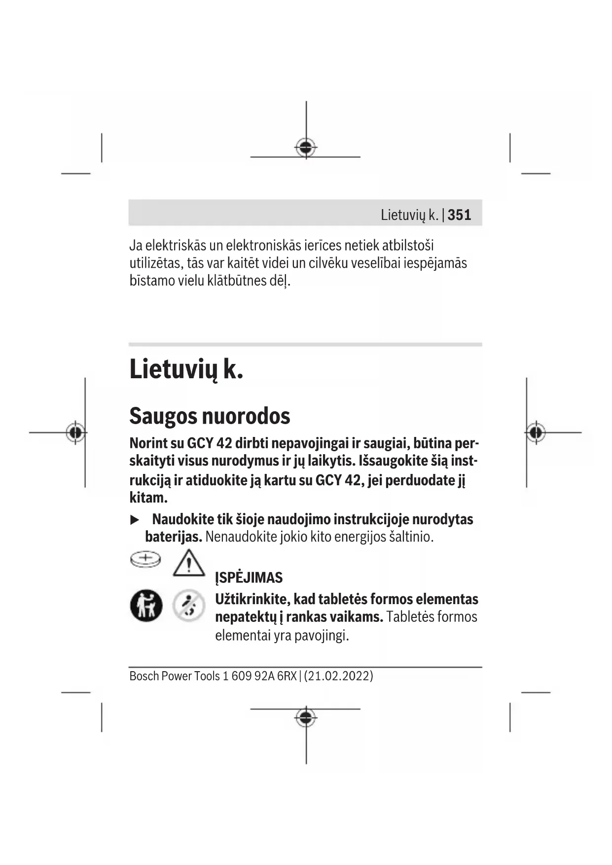 Veikimo nuotolis, priklausomai nuo išorinių sąlygų, taip pat ir nuo naudojamo imtuvo, gali labai skirtis. Uždarose patalpose ir dėl metalinių barjerų (pvz., sienų, lentynų, la- gaminų ir kt.) Bluetooth® veikimo nuotolis gali labai su- mažėti. Būtinos sąlygos sistemai GCY 42 Mobilusis galinis prietaisas (planšetė, išmanusis telefo- nas) „Android 6.0“ (ir aukštesnės versijos) „iOS 11“ (ir aukštesnės versijos) 1 609 92A 6RX | (21.02.2022) Bosch Power ToolsLietuvių k. | 357 Montavimas ir naudojimas Elektros energijos tiekimas u Naudodamiesi, pvz., atsuktuvu ar didele moneta, nuo elektrinio įrankio nuimkite Bluetooth® „Low Energy Module GCY 42“ skirtą dangtelį. Naudojant netinkamus daiktus, gali būti pažeista elektronika arba dangtelis. – Jei nusipirkę ar pakeitę bateriją (1) prietaisą norite įjungti, sekite nurodymus puslapiuose su schemomis. Laikykitės žemiau pateiktų nurodymų. Pirmasis paleidimas eksploatuoti (žr. A1–A5 pav.) Nuoroda: saugokite dangtelį (3), skirtą GCY42. Jei elektrinį įrankį perduodate kitam savininkui be GCY 42, uždėkite dang- telį. Įdėkite bateriją (1) pliusinį polių nukreipę aukštyn į GCY 42 (2). Baterijos įspausti nebūtina, ji savaime užsifiksuoja. Numa- tytoje padėtyje ji užsifiksuoja tik uždarant dangtelį. Norėdami GCY42 po įdėjimo instaliuoti, paspauskite elektri- nio įrankio įjungimo-išjungimo jungiklį. Bosch Power Tools 1 609 92A 6RX | (21.02.2022)358 | Lietuvių k. Baterijos keitimas (žr. B1–B4 pav.) Išsieikvojusias baterijas (1) išimkite tik pirštais. Prieš visiškai išsieikvojant baterijai, programoje parodomas įspėjimas. GCY 42 išėmimas (žr. C1–C2 pav.) Išimdami GCY42 (2) nenaudokite jėgos. Nenaudokite smailių ir aštrių įrankių. Nuoroda: Kad GCY42 būtų lengviau išimti, elektrinį įrankį gali- te apversti. Paruošimas naudoti Kai tik įdedama baterija (1) ir paspaudžiamas elektrinio įrankio įjungimo-išjungimo jungiklis, GCY42 pradeda nuolat siųsti sig- nalą. Bluetooth® signalas nutraukiamas tik tada, kai išsieikvoja, pažeidžiama arba išimama baterija. Išsamesnės informacijos rasite Bosch programoje. 1 609 92A 6RX | (21.02.2022) Bosch Power ToolsLietuvių k. | 359 Programos įdiegimas ir priderinimas Norėdami naudoti GCY42, pirmiausia turite įdiegti programėlę Bosch Toolbox. – Iš atitinkamos programų parduotuvės („AppleApp Store“, „Google Play Store“) parsisiųskite programėlę Bosch Tool- box. Nuoroda: atitinkamoje „AppStore“ būtina sąlyga yra naudo- tojo paskyra. – Tada programoje pasirinkite papunktį MyTools. – Jūsų mobiliojo galinio prietaiso ekrane bus parodyti visi kiti žingsniai, kaip elektrinį įrankį sujungti su galiniu prietaisu . Nuoroda: Pirmiausia peržiūrėkite visą programos mokomąją medžiagą. Tada įgysite aiškesnį suvokimą apie prijungimo ope- raciją ir jungiamumo funkcijų naudojimą. Duomenų perdavimas Bluetooth® GCY42 turi reguliarų siuntimo intervalą. Priklausomai nuo apli- nkos, kol bus atpažintas GCY42, gali prireikti kelių siuntimo intervalų. Jei GCY42 nebūtų atpažintas, patikrinkite šiuos pusnktus: Bosch Power Tools 1 609 92A 6RX | (21.02.2022)360 | Lietuvių k. – Gal per didelis atstumas iki mobiliojo galinio prietaiso? Sumažinkite atstumą tarp mobiliojo galinio prietaiso ir GCY42. – Gal per daug išsieikvojusi arba tuščia baterija? Pakeiskite bateriją. – Savo mobiliajame galiniame prietaise išjunkite Bluetooth® ir vėl įjunkite. Patikrinkite, ar GCY42 buvo atpažintas. Priežiūra ir servisas Priežiūra ir valymas Teptuku pašalinkite nešvarumus. Nenaudokite valymo priemo- nių ir tirpiklių. Klientų aptarnavimo skyrius ir konsultavimo tarnyba Klientų aptarnavimo skyriuje gausite atsakymus į klausimus, susijusius su jūsų gaminio remontu, technine priežiūra bei at- sarginėmis dalimis. Detalius brėžinius ir informacijos apie at- sargines dalis rasite interneto puslapyje: www.bosch-pt.com 1 609 92A 6RX | (21.02.2022) Bosch Power ToolsLietuvių k. | 361 Bosch konsultavimo tarnybos specialistai mielai pakonsultuos Jus apie gaminius ir jų papildomą įrangą. Ieškant informacijos ir užsakant atsargines dalis prašome bū- tinai nurodyti dešimtženklį gaminio numerį, esantį firminėje le- ntelėje. Lietuva Bosch įrankių servisas Informacijos tarnyba: (037) 713350 ļrankių remontas: (037) 713352 Faksas: (037) 713354 El. paštas: service-pt@lv.bosch.com Kitus techninės priežiūros skyriaus adresus rasite čia: www.bosch-pt.com/serviceaddresses Šalinimas GCY42 modulis, papildoma įranga ir pakuotės turi būti utili- zuojami aplinkai nekenksmingu būdu. Nemeskite elektroninių konstrukcinių dalių ir ba- terijų į buitinių atliekų konteinerius! Bosch Power Tools 1 609 92A 6RX | (21.02.2022)362 | 中文 Tik ES šalims: Pagal Europos direktyvą 2012/19/ES dėl elektros ir elektroni- nės įrangos atliekų ir šios direktyvos perkėlimo į nacionalinę teisę aktus nebetinkami naudoti elektriniai įrankiai ir pagal 2006/66EB pažeisti ir susidėvėję akumuliatoriai/baterijos turi būti surenkami atskirai ir perdirbami aplinkai nekenksmingu būdu. Netinkamai pašalintos elektros ir elektroninės įrangos atliekos dėl galimų pavojingų medžiagų gali turėti žalingą poveikį apli- nkai ir žmonių sveikatai.