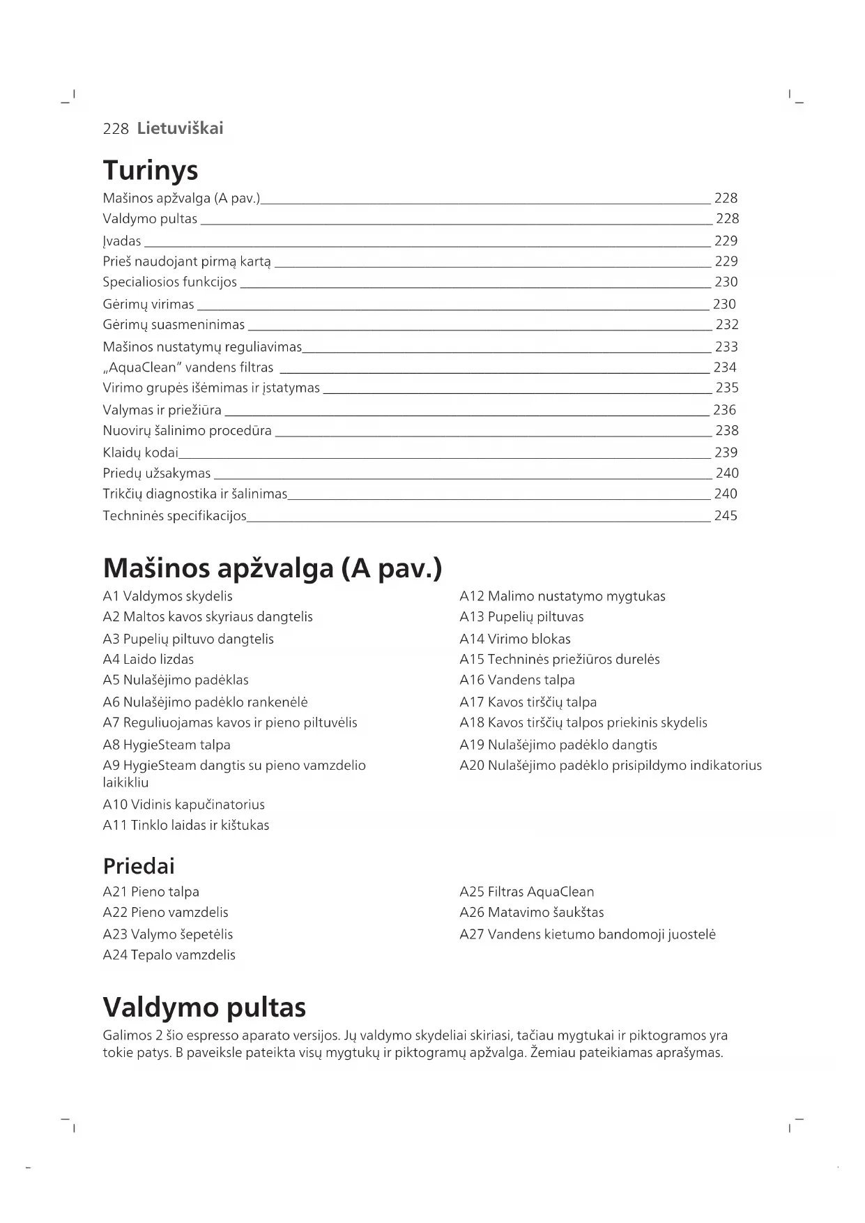 Lietuviškai Turinys Mašinos apžvalga (A pav.)__________________________________________________________________ 228 Valdymo pultas ___________________________________________________________________________ 228 Įvadas ___________________________________________________________________________________ 229 Prieš naudojant pirmą kartą ________________________________________________________________ 229 Specialiosios funkcijos _____________________________________________________________________ 230 Gėrimų virimas ___________________________________________________________________________ 230 Gėrimų suasmeninimas ____________________________________________________________________ 232 Mašinos nustatymų reguliavimas____________________________________________________________ 233 „AquaClean“ vandens filtras _______________________________________________________________ 234 Virimo grupės išėmimas ir įstatymas _________________________________________________________ 235 Valymas ir priežiūra _______________________________________________________________________ 236 Nuovirų šalinimo procedūra ________________________________________________________________ 238 Klaidų kodai______________________________________________________________________________ 239 Priedų užsakymas _________________________________________________________________________ 240 Trikčių diagnostika ir šalinimas______________________________________________________________ 240 Techninės specifikacijos____________________________________________________________________ 245 Mašinos apžvalga (A pav.) A1 Valdymos skydelis A2 Maltos kavos skyriaus dangtelis A3 Pupelių piltuvo dangtelis A4 Laido lizdas A5 Nulašėjimo padėklas A6 Nulašėjimo padėklo rankenėlė A7 Reguliuojamas kavos ir pieno piltuvėlis A8 HygieSteam talpa A9 HygieSteam dangtis su pieno vamzdelio laikikliu A10 Vidinis kapučinatorius A11 Tinklo laidas ir kištukas A12 Malimo nustatymo mygtukas A13 Pupelių piltuvas A14 Virimo blokas A15 Techninės priežiūros durelės A16 Vandens talpa A17 Kavos tirščių talpa A18 Kavos tirščių talpos priekinis skydelis A19 Nulašėjimo padėklo dangtis A20 Nulašėjimo padėklo prisipildymo indikatorius Priedai A21 Pieno talpa A22 Pieno vamzdelis A23 Valymo šepetėlis A24 Tepalo vamzdelis A25 Filtras AquaClean A26 Matavimo šaukštas A27 Vandens kietumo bandomoji juostelė Valdymo pultas Galimos 2 šio espresso aparato versijos. Jų valdymo skydeliai skiriasi, tačiau mygtukai ir piktogramos yra tokie patys. B paveiksle pateikta visų mygtukų ir piktogramų apžvalga. Žemiau pateikiamas aprašymas.229 Lietuviškai Pasinaudodami rodyklėmis aukštyn ir žemyn slinkite per ekraną ir bakstelėkite piktogramą OK, kad pasirinktumėte ar patvirtintumėte savo pasirinkimus. B1 J./IŠJ. mygtukas B2 Gėrimų pasirinkimo mygtukai B3 Piktograma CoffeeMaestro B4 Išplėstinis gėrimų meniu B5 Paleidimo/sustabdymo mygtukas B6 Naršymo piktogramos (aukštyn, žemyn, atgal, gerai) B7 Ekranas B8 Aparato nustatymai B9 Valymo meniu B10 Asmeniniai profiliai Įvadas Sveikiname įsigijus visiškai automatinę „Saeco“ kavos mašiną! Kad galėtumėte pasinaudoti Saeco internetine pagalba, užregistruokite gaminį svetainėje www.saeco.com/MyCoffeeMachine. Pastaba. Ši mašina buvo išbandyta naudojant kavą. Nors ji buvo kruopščiai išvalyta, joje gali būti šiek tiek kavos likučių. Tačiau mes garantuojame, kad mašina visiškai nauja. Prieš naudojant pirmą kartą